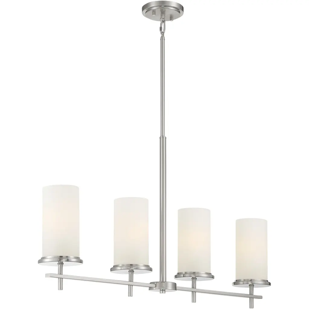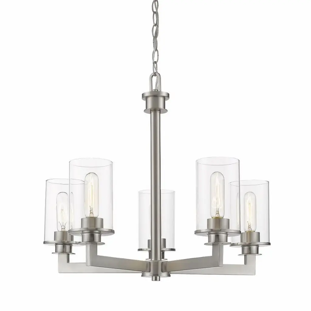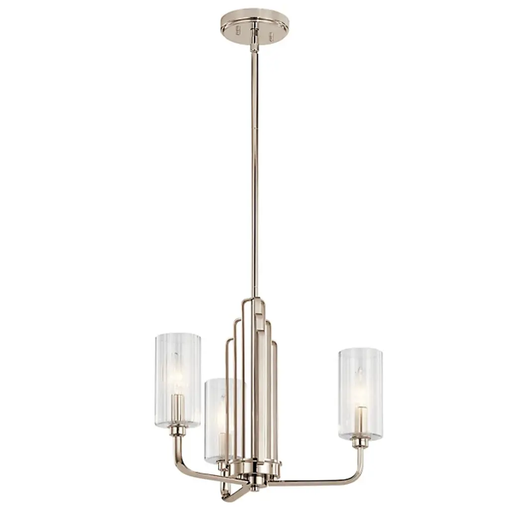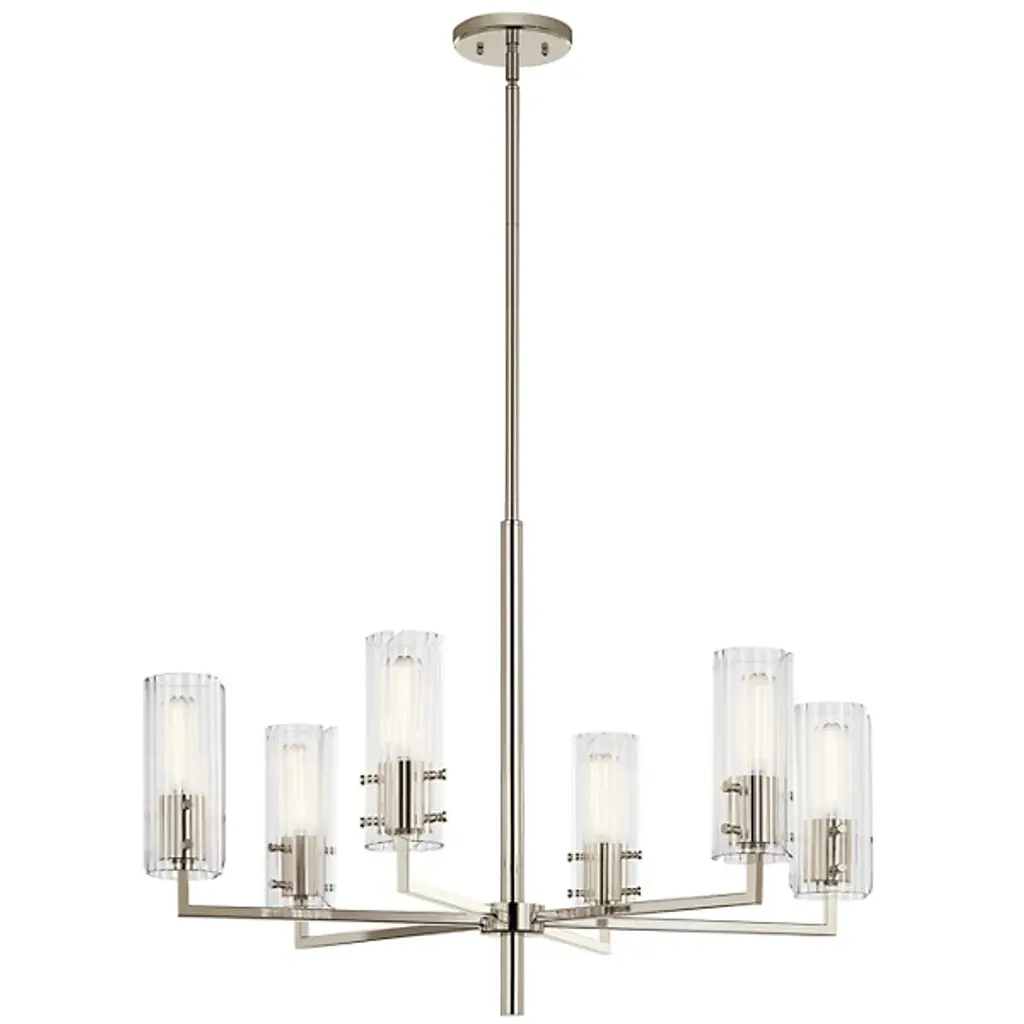 The Velestino Chandelier from Kichler merges straight lines with organic glass forms. Each glass cylinder features distinct ribbing that creates dynamic light patterns. One side flows in a gentle curve while the opposite maintains a crisp edge, adding subtle complexity. This piece’s steel frame provides a structured foundation that contrasts with its fluid glasswork. Adaptable to sloped ceilings, this chandelier brightens dining spaces and foyers while its thoughtful design casts intriguing shadows both day and night.