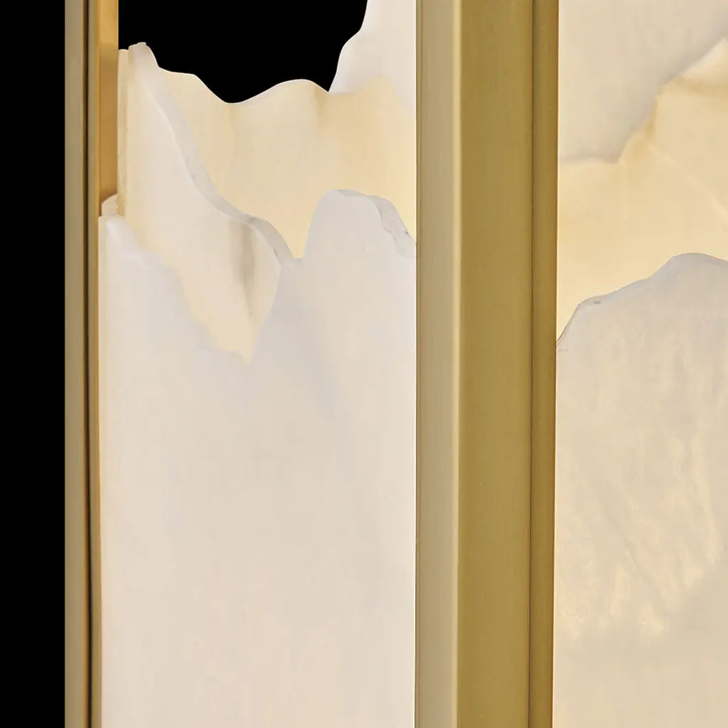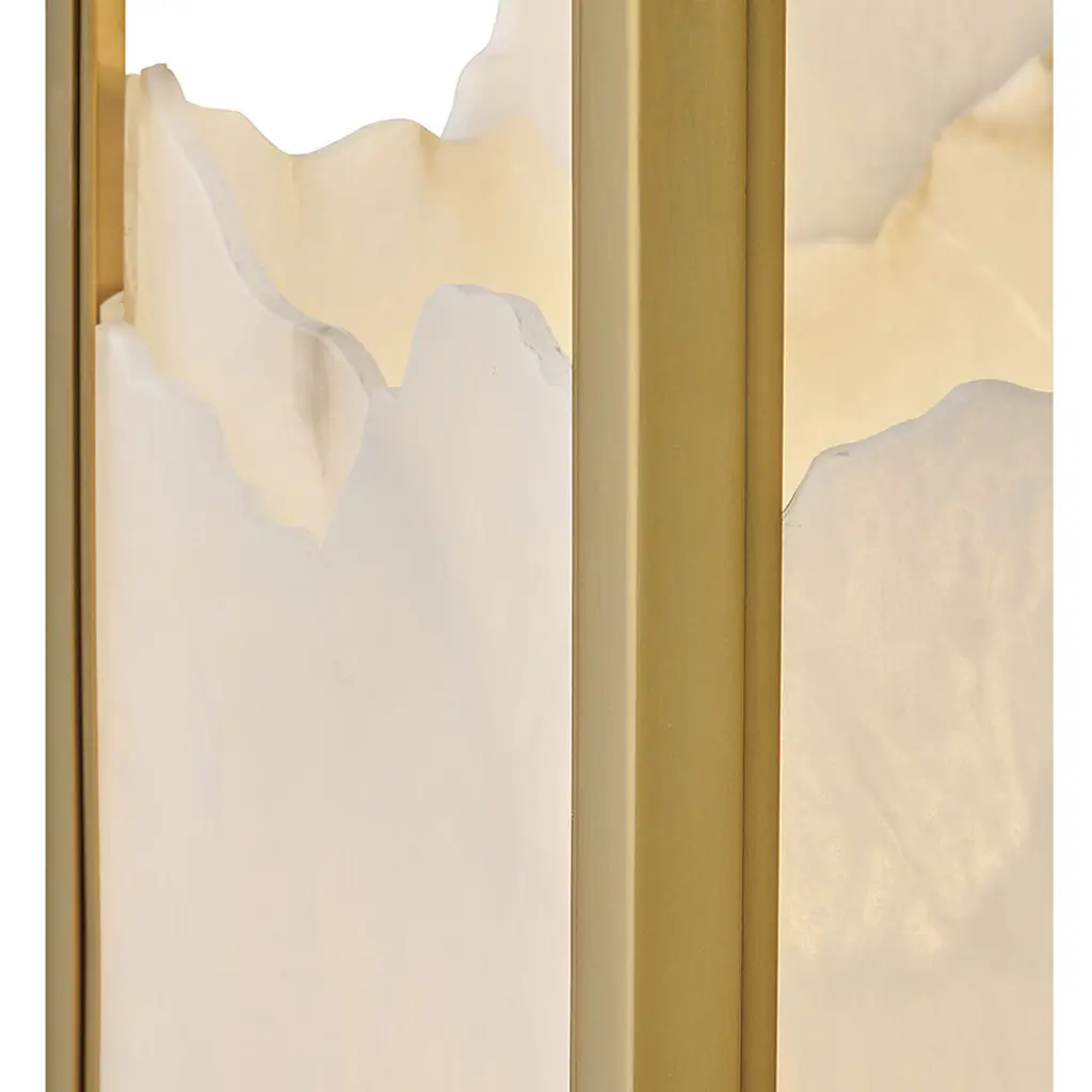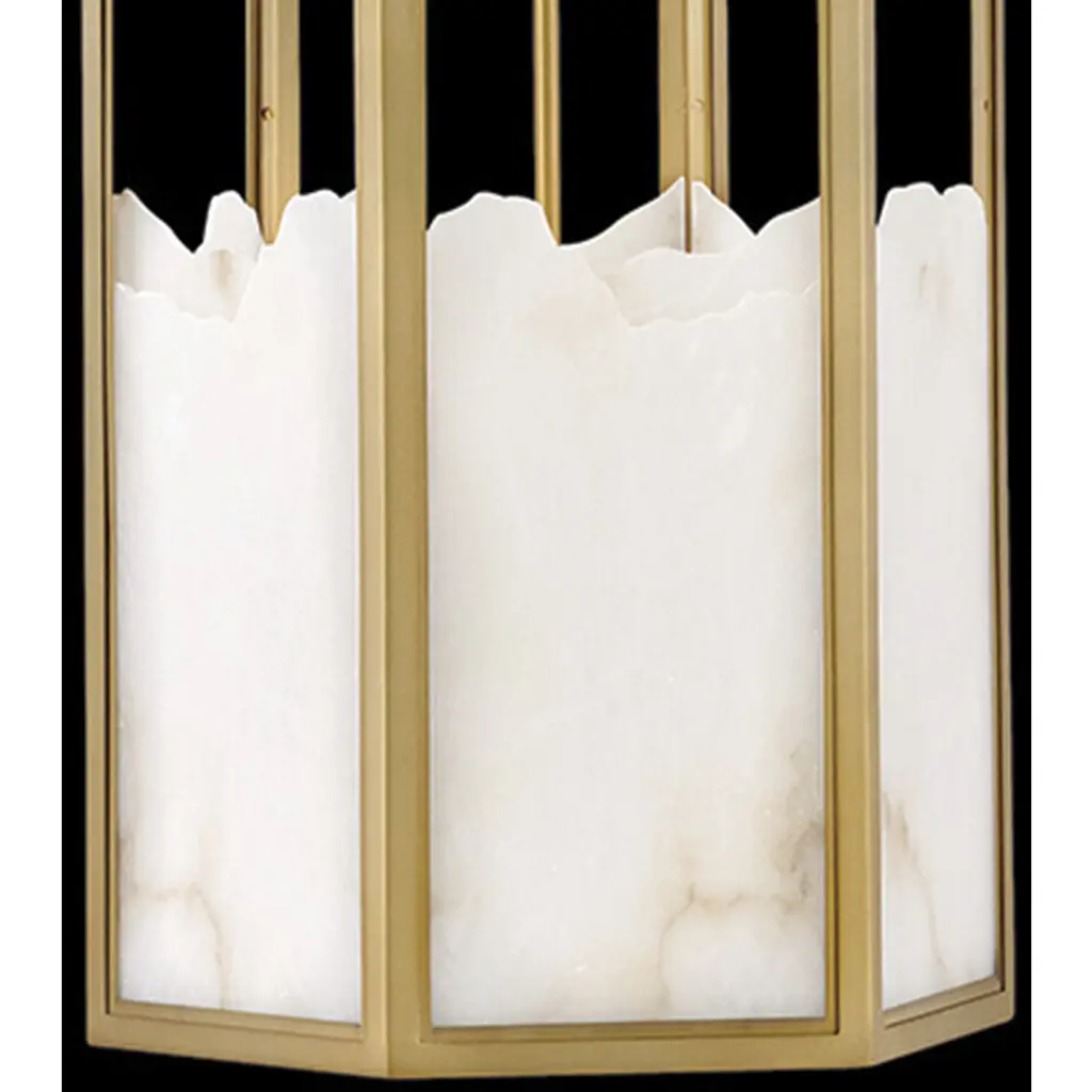Inspired by Italian design, Valetas natural alabaster shade with jagged top edges is showcased by a geometric Lacquered Brass frame. Truly one-of-a-kind graining, color variations, and organically formed textures make each Veleta fixture genuinely unique.