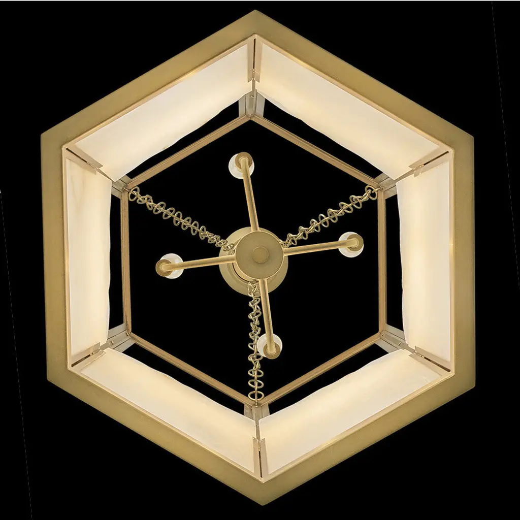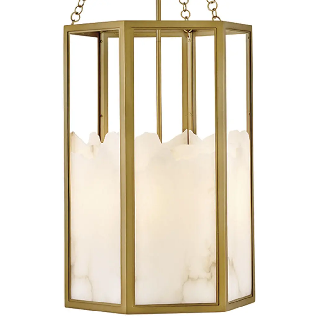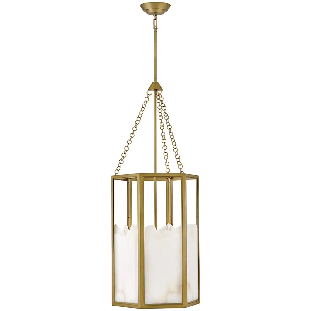 Inspired by Italian design, Valetas natural alabaster shade with jagged top edges is showcased by a geometric Lacquered Brass frame. Truly one-of-a-kind graining, color variations, and organically formed textures make each Veleta fixture genuinely unique.