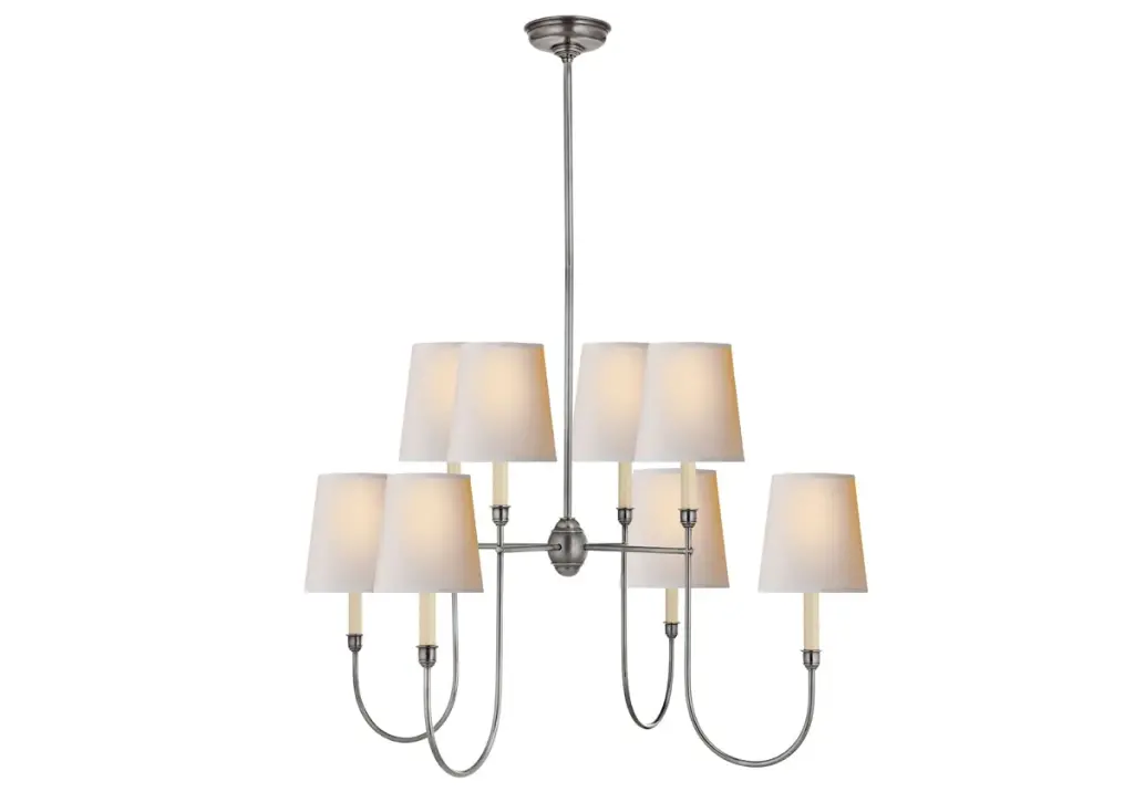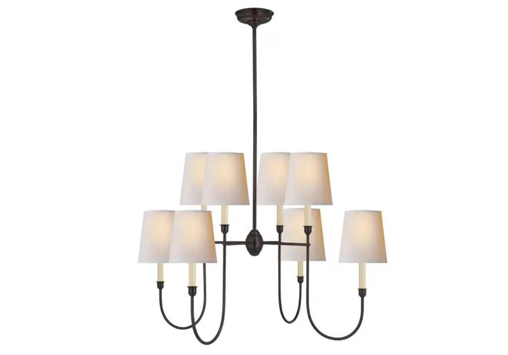 Create a visually distinct look with this luminous chandelier. Its pronounced arms support eight lights with tapered natural paper shades, which create a distinguished and captivating design. Available in three distinct finishes: antique brass, bronze, and antique silver.Dimensions: 36” W | 27” H