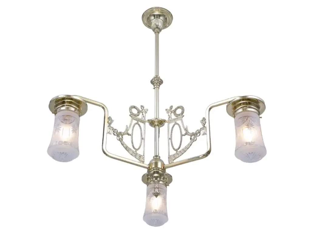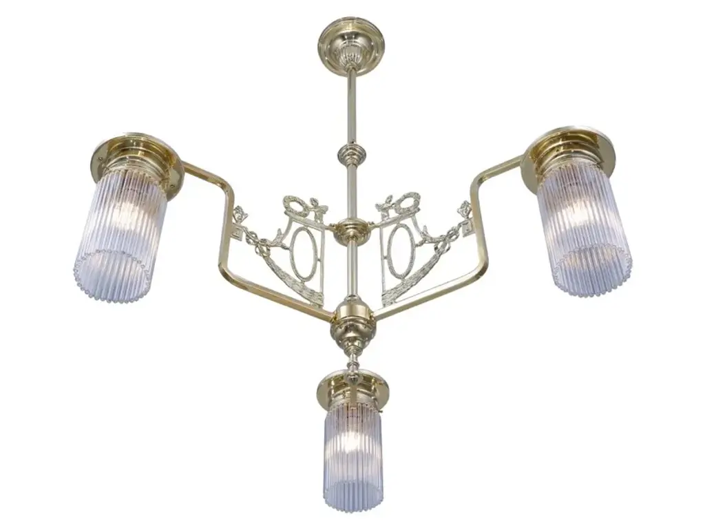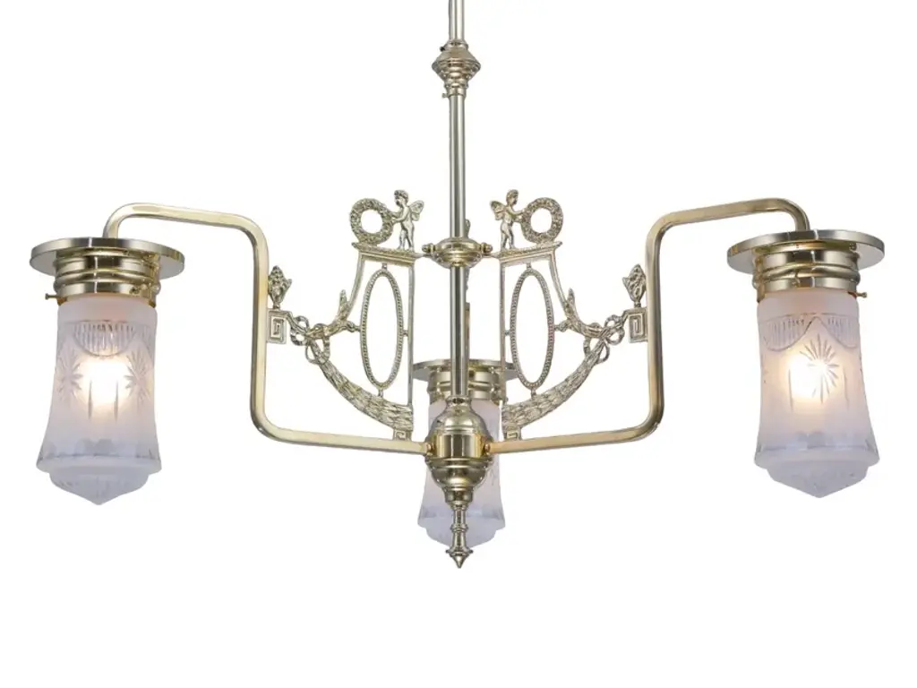 Venice 3 is a 3 armed chandelier made of brass available in different finishes.Finishes: Antique, Shiny brass, Matt brass, Shiny nickel, Matt nickelCapacity: 3x75 W E27The stunning 20 armed chandelier in this collection is pure magnificence. Its predecessor is a 5 armed modest specimen, which was „upgraded” to a grand version. The structures of all chandeliers are decorated with a charming Cupid figure.