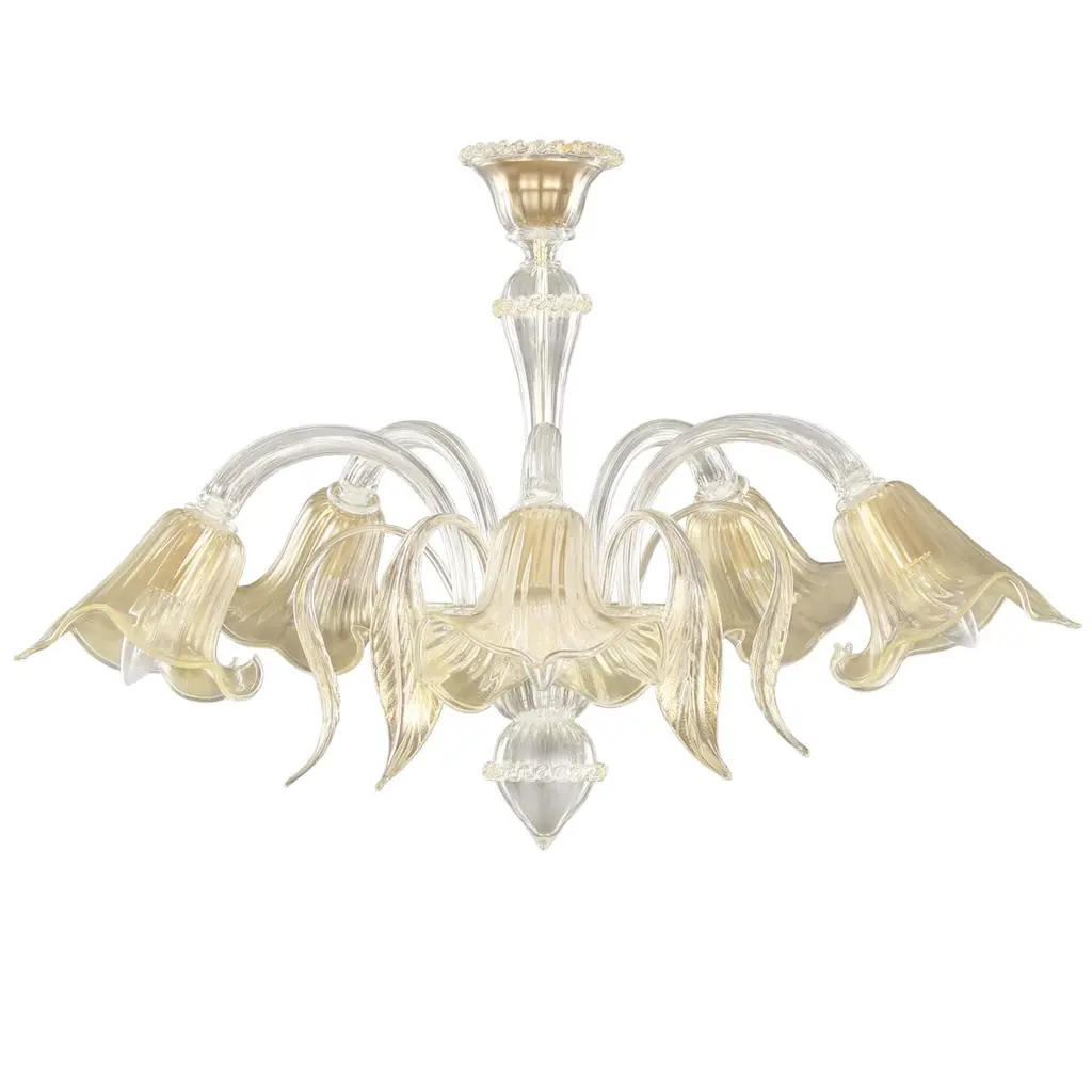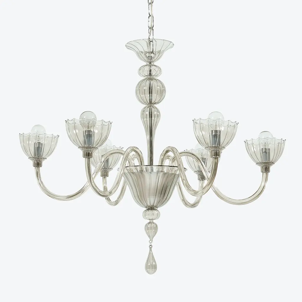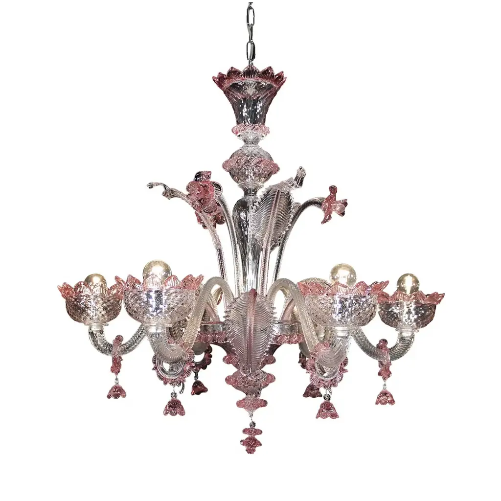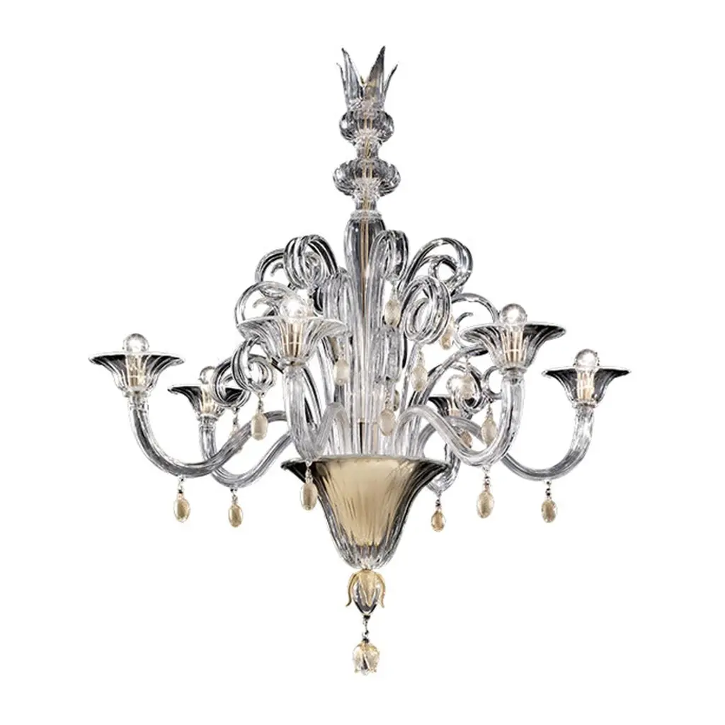 Reminiscent of classic chandeliers, this sophisticated piece brings past glamour in today's homes. The clear crystal structure has six sinuous arms and scrolls arranged to form a cascading design. Accented with ruby crystals along the scalloped-edge bobeche, ceiling cup, ornate finial, and pendants, this piece has four stemmed flowers and leaves that extend to frame the body, enhancing the aesthetic harmony of the piece. Exemplifying the precision and attention to details of the Venetian glass masters, this chandelier will complement any decor. Contact the Concierge for other available sizes.