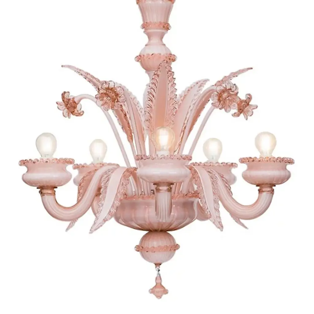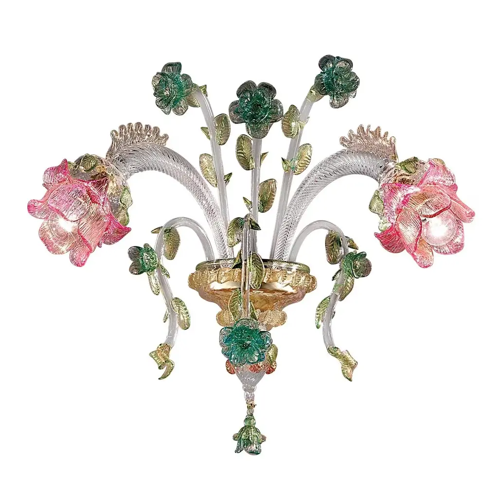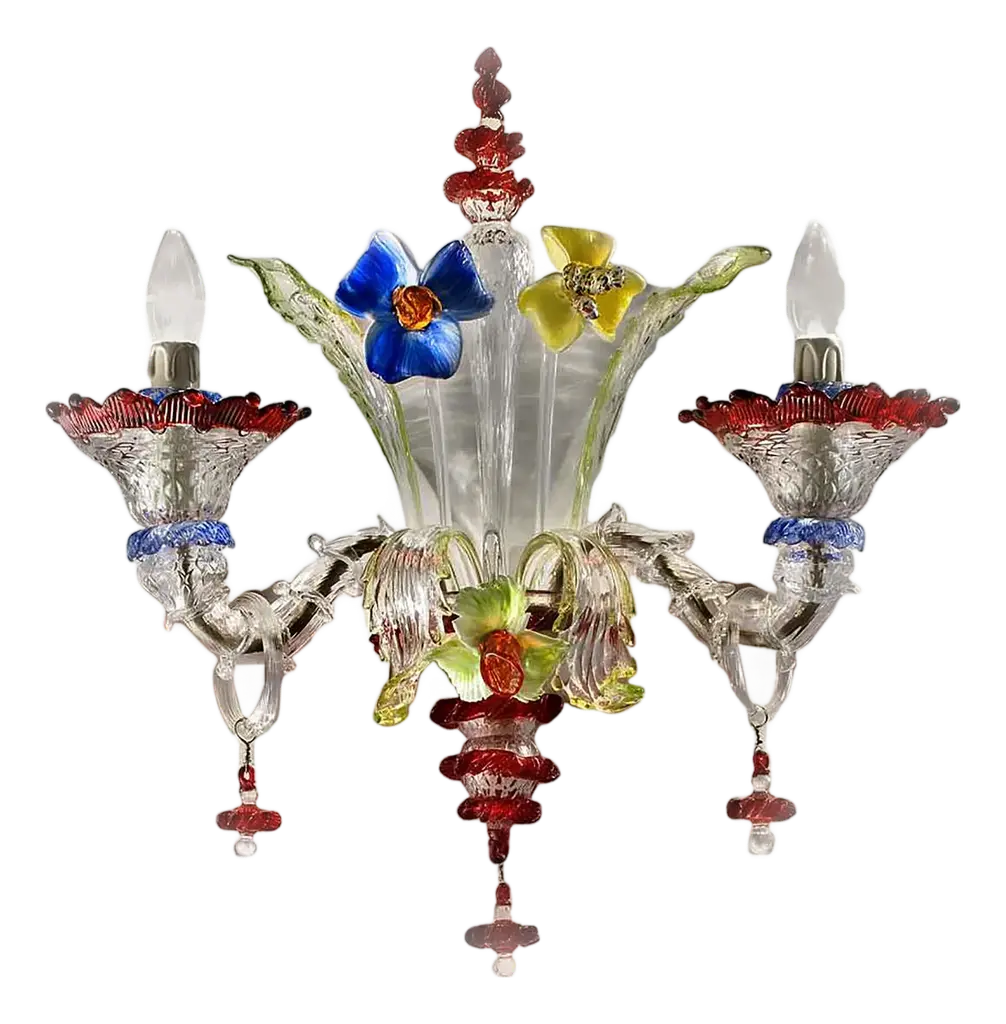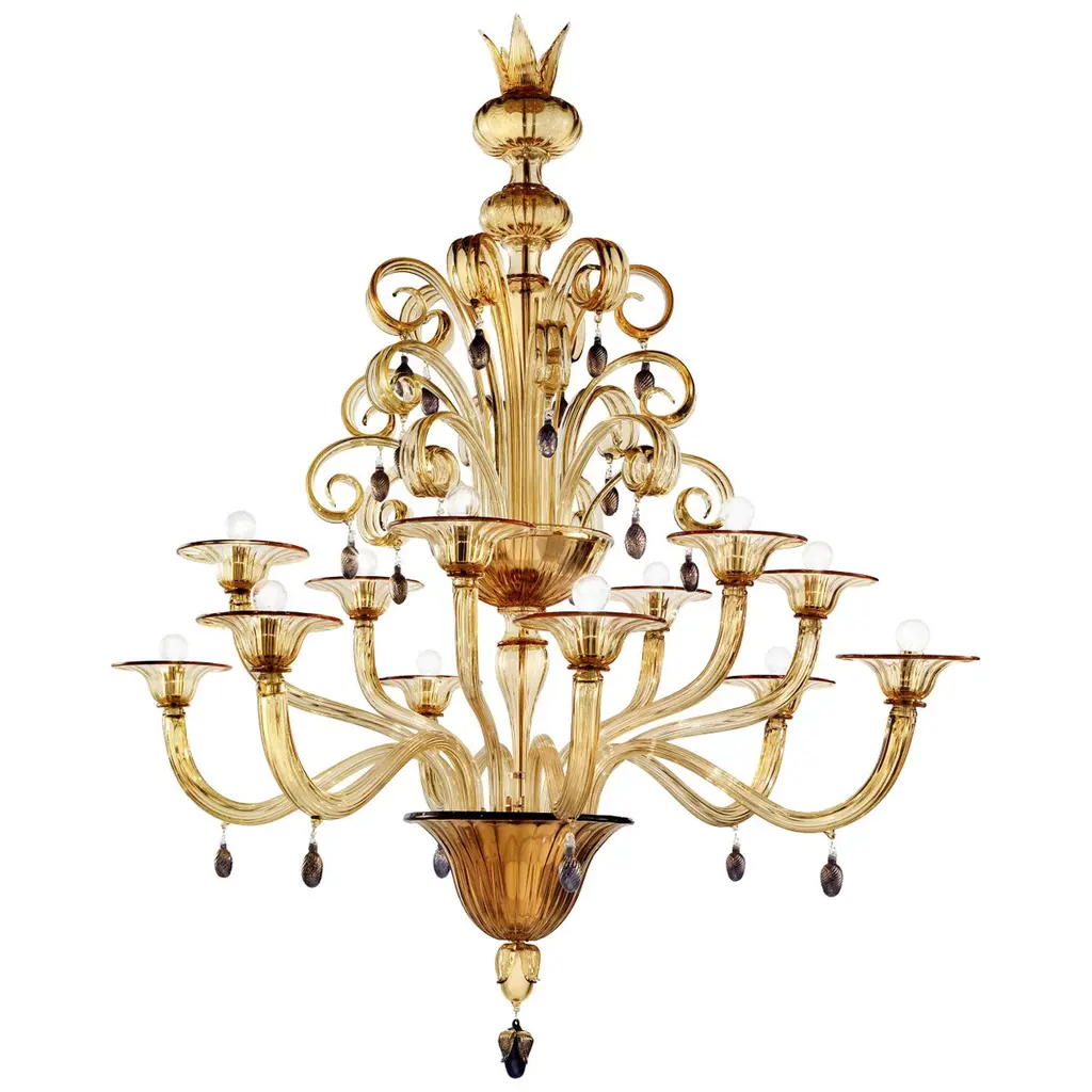 Reminiscent of classic chandeliers, this sophisticated piece brings past glamour in today's homes. The clear crystal structure has six sinuous arms and scrolls arranged to form a cascading design. Accented with ruby crystals along the scalloped-edge bobeche, ceiling cup, ornate finial, and pendants, this piece has four stemmed flowers and leaves that extend to frame the body, enhancing the aesthetic harmony of the piece. Exemplifying the precision and attention to details of the Venetian glass masters, this chandelier will complement any decor. Contact the Concierge for other available sizes.