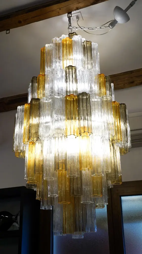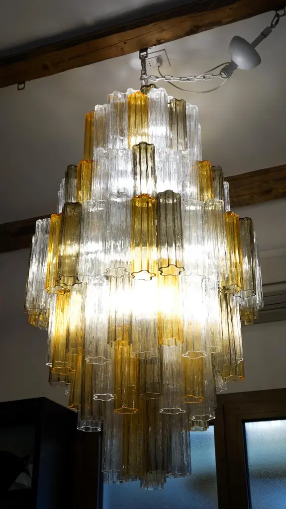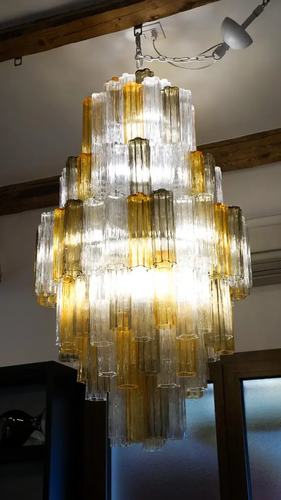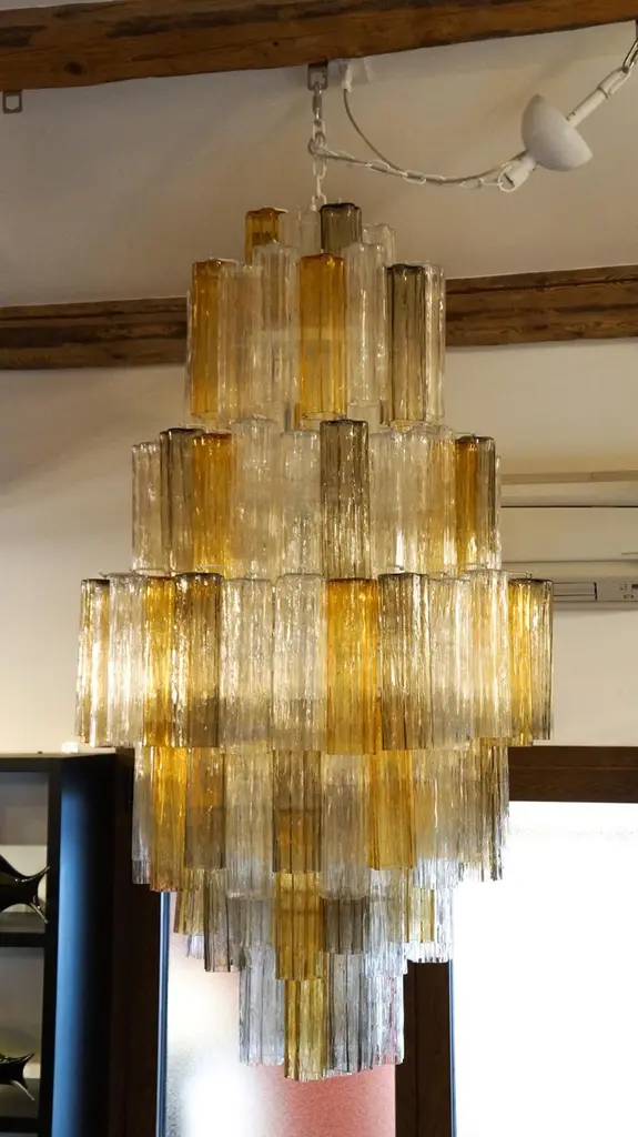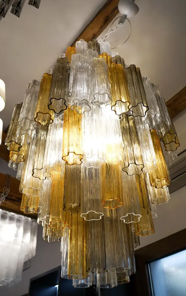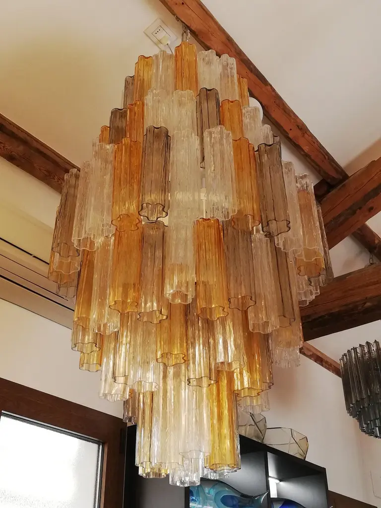 Large Murano blown glass "Tubi Tronchi" chandelier, with three color elements, crystal, gray mole and amber. This fantastic chandelier contains a total of 138 elements called Tubi Tronchi. The chandelier can be rewired according to the country of destination. This chandelier is a project Attributed to Toni Zuccheri for Venini, which in the following years Venini has continued to reproduce in various shapes and colors. This fantastic seven-level chandelier with a chrome finish contains E27 / E26 bulbs. Attributed to Venini and executed in the circa 1980s.The Murano glass chandelier is nothing like a typical fixture made simply to illuminate a room. This is not a mere decorative object, but is the subject of years of a creative journey that has its roots in Italy. The materials used in the production of original Murano glass belong to a long line of artisan tradition. Essentially, when you buy this kind of chandelier, you are becoming part of a rich history that began with Venetian glass masters with fervor and passion.The price of the item includes professional and tailored packing.Chandelier can be re wired for your country code. Replacement included."Zuccheri Toni (Antonio): Born in San Vito del Tagliamento (Pordenone - Italy) in 1936, Pierantonio "Toni" Zuccheri was the son of Luigi Zuccheri, animalist painter and nephew of Giacomo Noventa (poet and philosopher). In 1981 he designed and produced the Fenice d'oro award for the Venice Film Festival; in 1985 he exhibited his works at the Pavilion of Contemporary Art (PAC) in Milan. In 1989 he created the Reggiani Light Gallery in 800 Fifth Avenue in New York; always for Reggiani he realized the Stand at the Euroluce in Milan; in 1990 he exhibited in the New York gallery. In 1996, his works were presented at the Kunstmuseum in Düsseldorf, in the exhibition "Italienisches Glas. Murano Miland ", 1930-1970. In 1999 he exhibited his Tree of the Seasons in the hall of the greatest council of the Ducal Palace in Venice, during the international "Open Glass" exhibition. In the same year, in San Vito al Tagliamento, as part of the "Vitraria" event, he exhibited the new Tree of Life. In 2003 he received the Rotary International award. In the Nineties he participated, with works and installations, in various editions of the contemporary art exhibition "Hic et Nunc", directed by the critic Angelo Bertani. He died in San Vito al Tagliamento in 2008. His works, as well as the Murano Glass Museum, the MOMA and Guggenheim in New York, the Okkaido Museum in Sapporo, the Metropolitan Tien Art Museum in Tokyo.".
