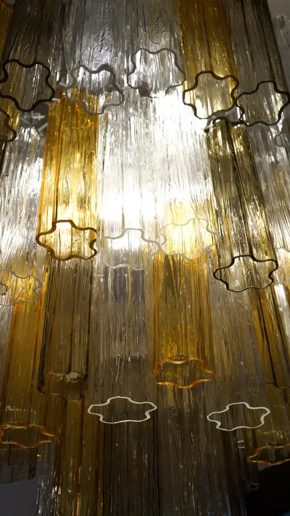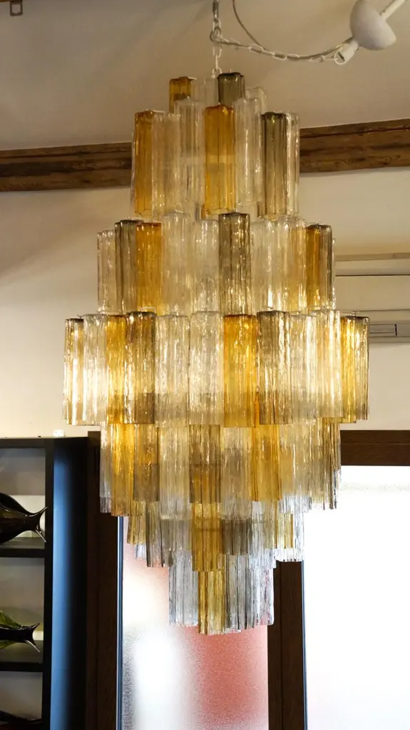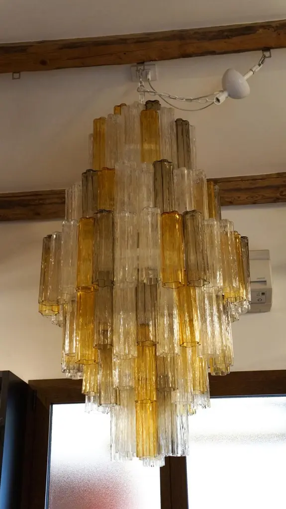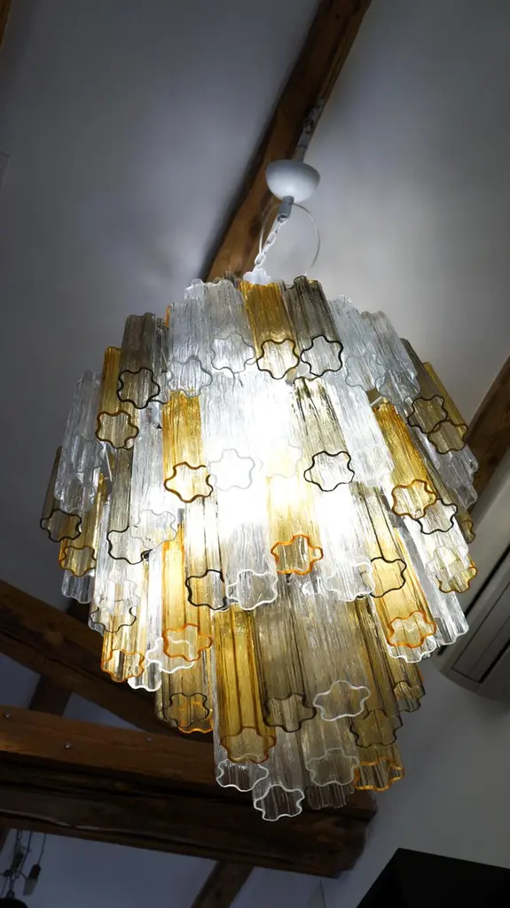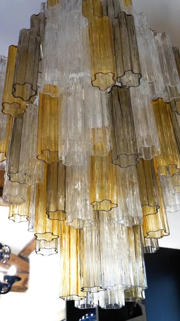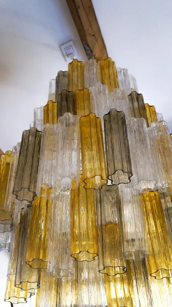Large Murano blown glass "Tubi Tronchi" chandelier, with three color elements, crystal, gray mole and amber. This fantastic chandelier contains a total of 138 elements called Tubi Tronchi. The chandelier can be rewired according to the country of destination. This chandelier is a project Attributed to Toni Zuccheri for Venini, which in the following years Venini has continued to reproduce in various shapes and colors. This fantastic seven-level chandelier with a chrome finish contains E27 / E26 bulbs. Attributed to Venini and executed in the circa 1980s.The Murano glass chandelier is nothing like a typical fixture made simply to illuminate a room. This is not a mere decorative object, but is the subject of years of a creative journey that has its roots in Italy. The materials used in the production of original Murano glass belong to a long line of artisan tradition. Essentially, when you buy this kind of chandelier, you are becoming part of a rich history that began with Venetian glass masters with fervor and passion.The price of the item includes professional and tailored packing.Chandelier can be re wired for your country code. Replacement included."Zuccheri Toni (Antonio): Born in San Vito del Tagliamento (Pordenone - Italy) in 1936, Pierantonio "Toni" Zuccheri was the son of Luigi Zuccheri, animalist painter and nephew of Giacomo Noventa (poet and philosopher). In 1981 he designed and produced the Fenice d'oro award for the Venice Film Festival; in 1985 he exhibited his works at the Pavilion of Contemporary Art (PAC) in Milan. In 1989 he created the Reggiani Light Gallery in 800 Fifth Avenue in New York; always for Reggiani he realized the Stand at the Euroluce in Milan; in 1990 he exhibited in the New York gallery. In 1996, his works were presented at the Kunstmuseum in Düsseldorf, in the exhibition "Italienisches Glas. Murano Miland ", 1930-1970. In 1999 he exhibited his Tree of the Seasons in the hall of the greatest council of the Ducal Palace in Venice, during the international "Open Glass" exhibition. In the same year, in San Vito al Tagliamento, as part of the "Vitraria" event, he exhibited the new Tree of Life. In 2003 he received the Rotary International award. In the Nineties he participated, with works and installations, in various editions of the contemporary art exhibition "Hic et Nunc", directed by the critic Angelo Bertani. He died in San Vito al Tagliamento in 2008. His works, as well as the Murano Glass Museum, the MOMA and Guggenheim in New York, the Okkaido Museum in Sapporo, the Metropolitan Tien Art Museum in Tokyo.".