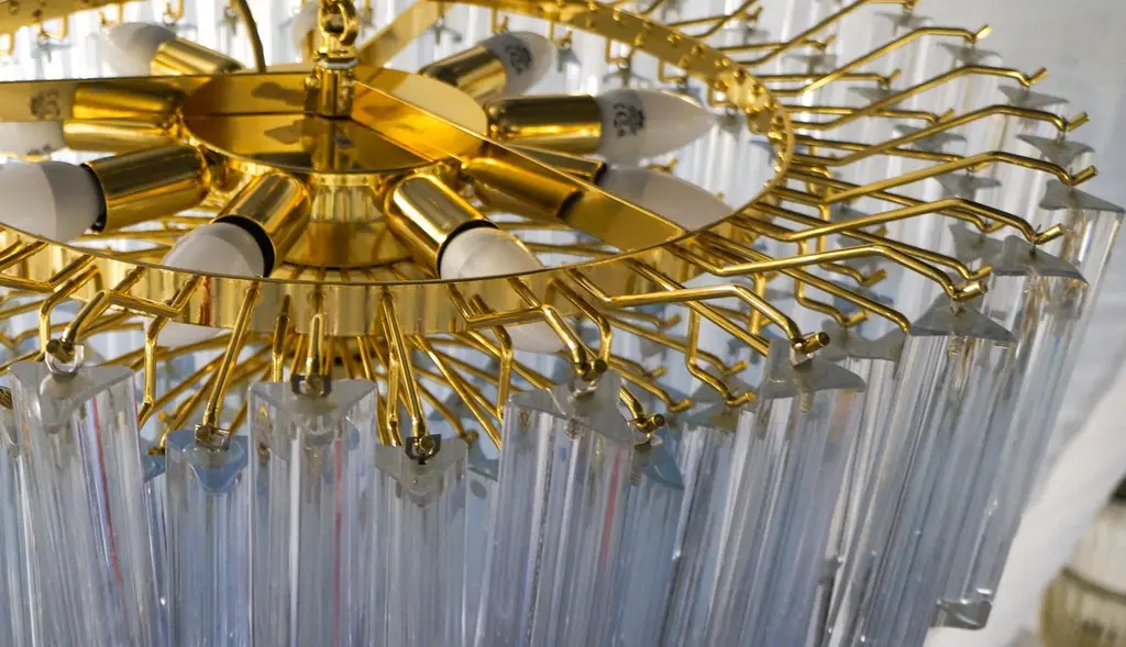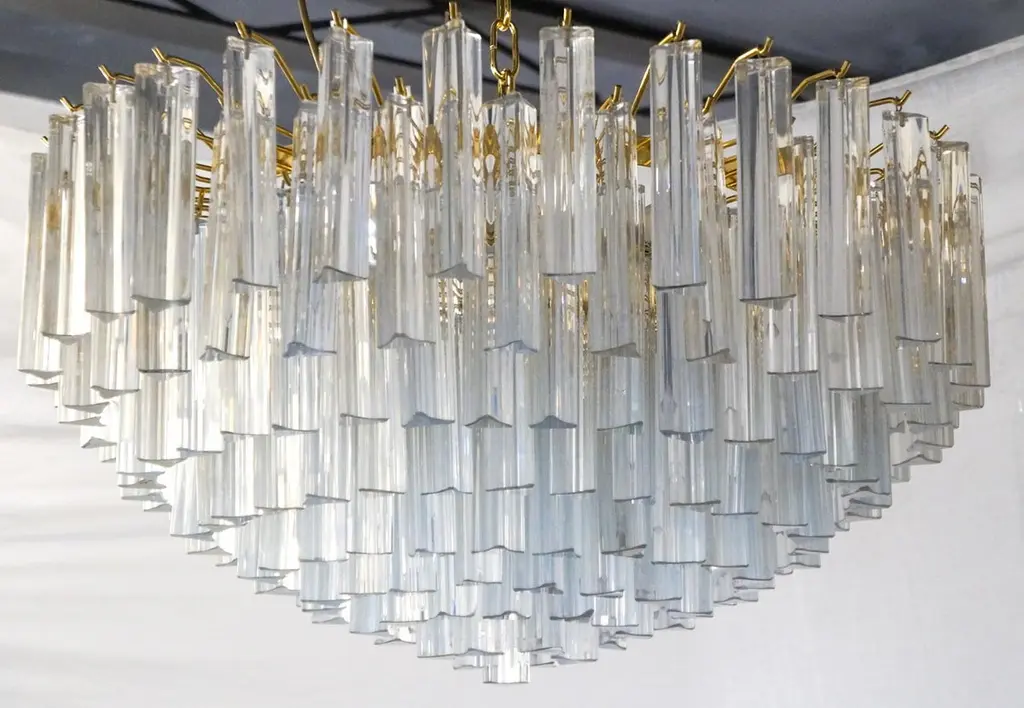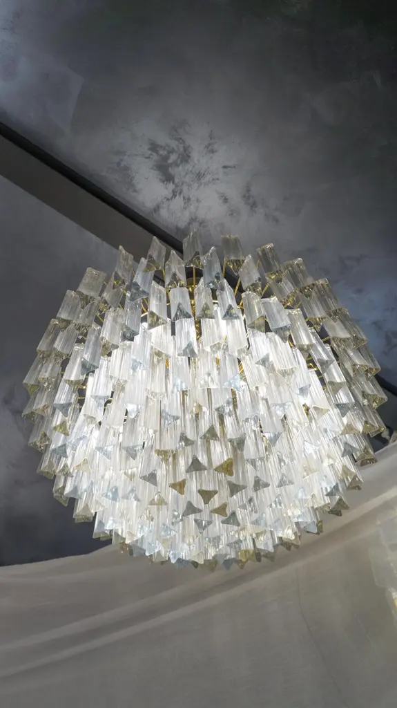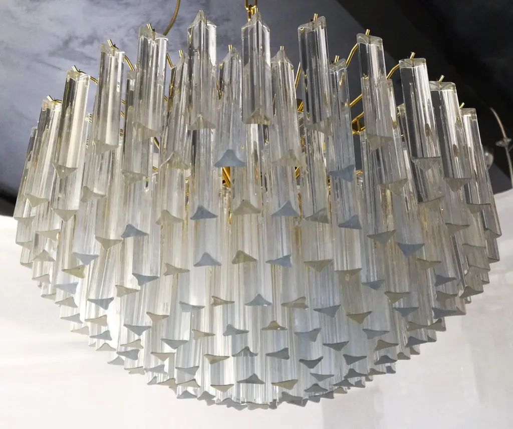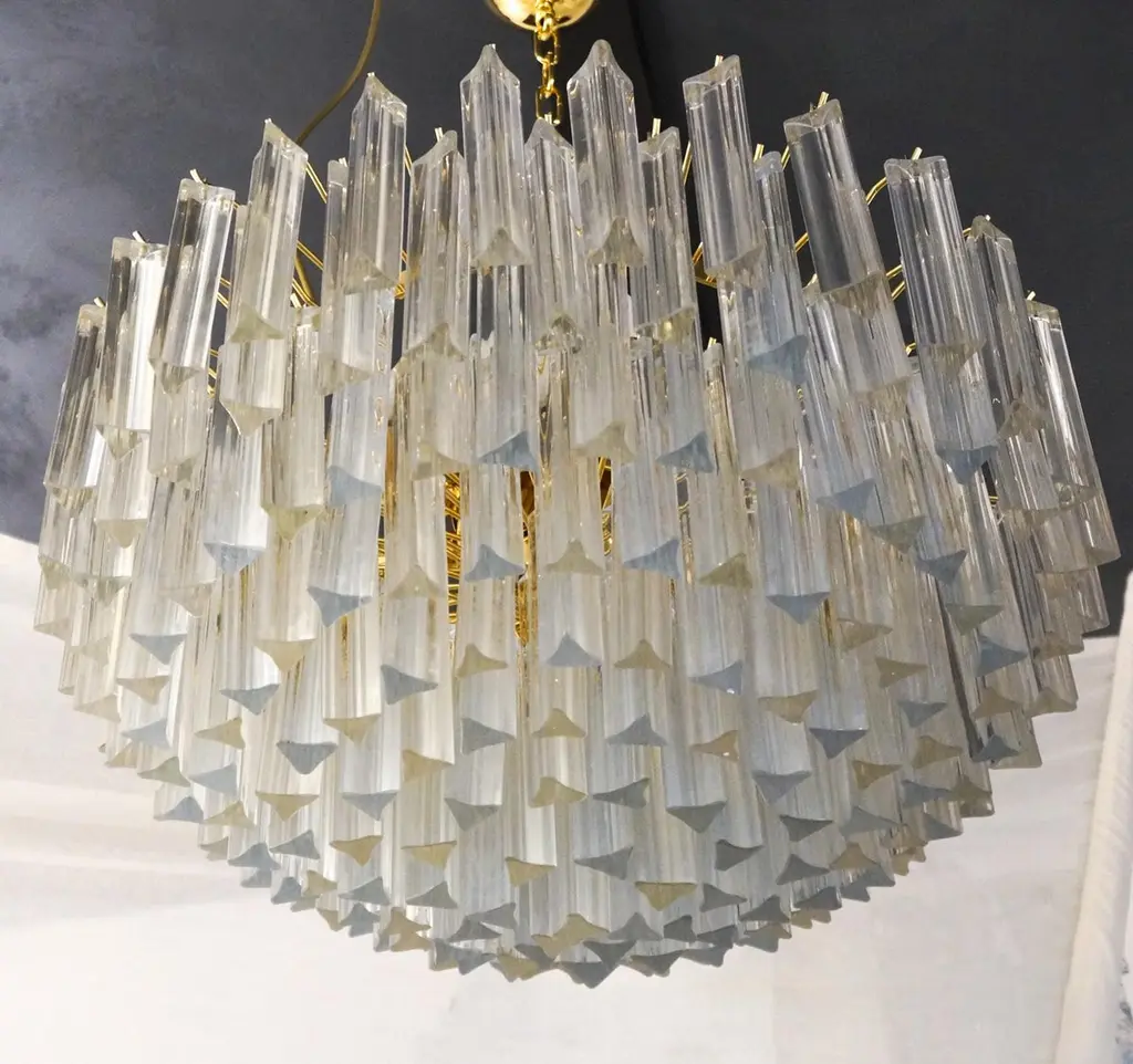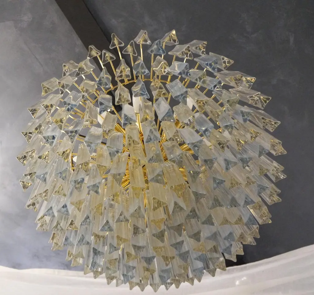 Murano blown glass chandelier with 169 elements in antique crystal, gold finish structure and 9 lights E26 / E27. The elements of this typical chandelier are called Triedri, for its triangular shape. The assistants take a small quantity of glass from the oven. Being its consistence like honey it gives the possibility to stretch and shape it. The whole sophisticated design based on the repetition of the glass elements called "Triedri". Attributed to Venini in 1980s. This magnificent work will give light to any environment, spreading elegance and warmth. The original design can create fascinating lighting.The indicated size does not include the chain, the chain will be supplied with 60/70 cm available and adjustable to your liking.The price of the item includes professional and tailored packing.Chandelier can be re wired for your country code. Replacement included.