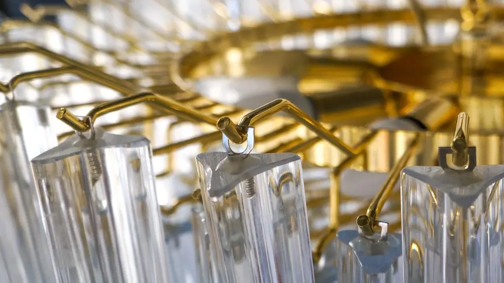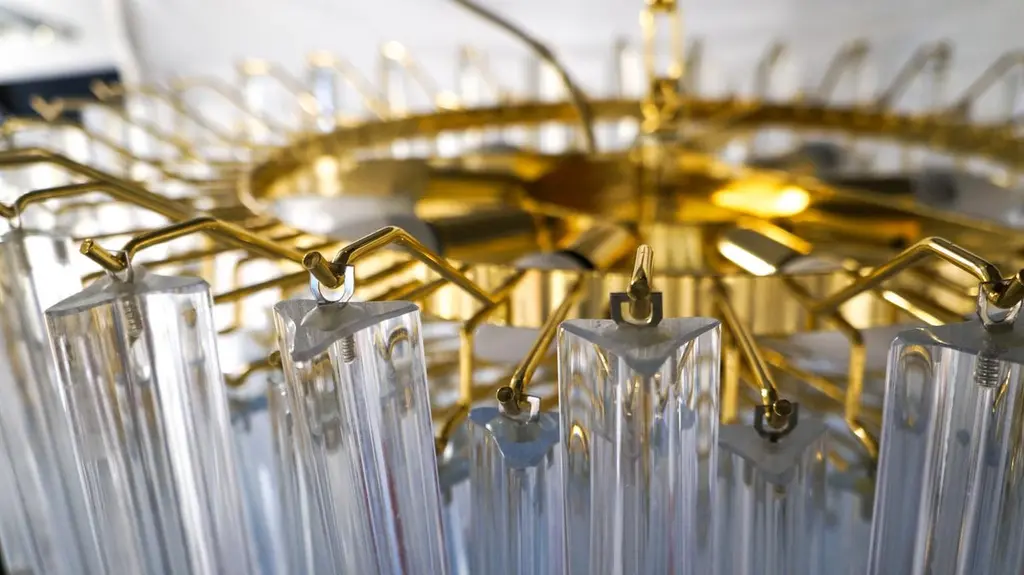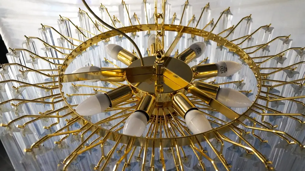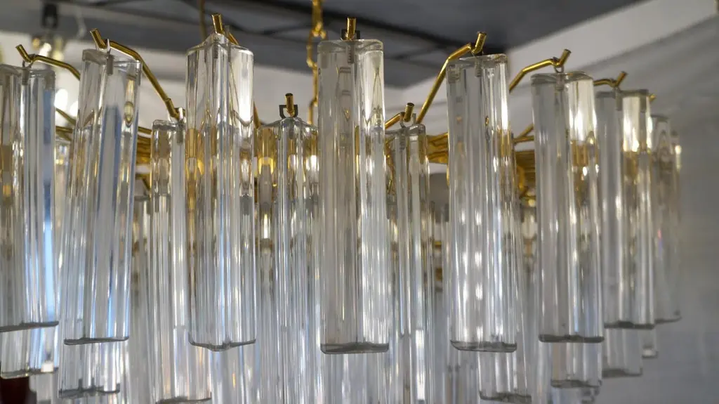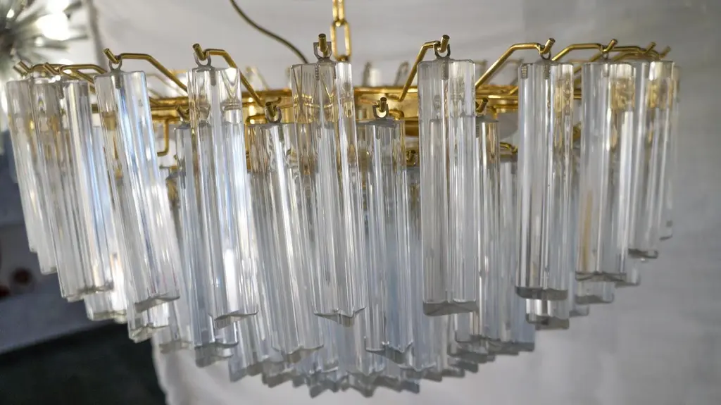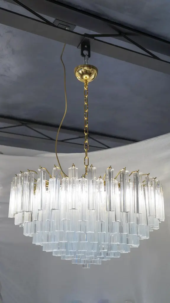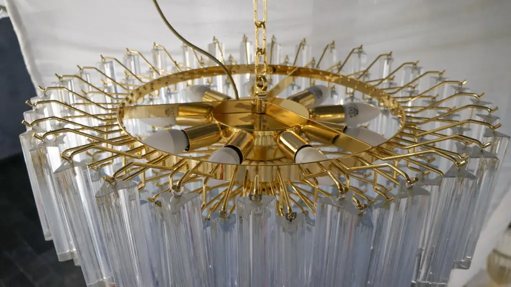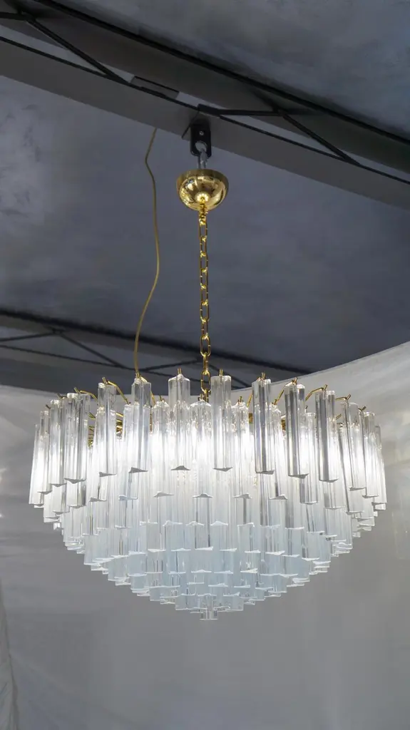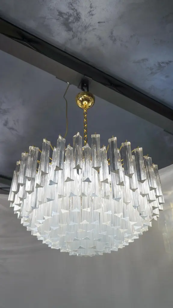 Murano blown glass chandelier with 169 elements in antique crystal, gold finish structure and 9 lights E26 / E27. The elements of this typical chandelier are called Triedri, for its triangular shape. The assistants take a small quantity of glass from the oven. Being its consistence like honey it gives the possibility to stretch and shape it. The whole sophisticated design based on the repetition of the glass elements called "Triedri". Attributed to Venini in 1980s. This magnificent work will give light to any environment, spreading elegance and warmth. The original design can create fascinating lighting.The indicated size does not include the chain, the chain will be supplied with 60/70 cm available and adjustable to your liking.The price of the item includes professional and tailored packing.Chandelier can be re wired for your country code. Replacement included.