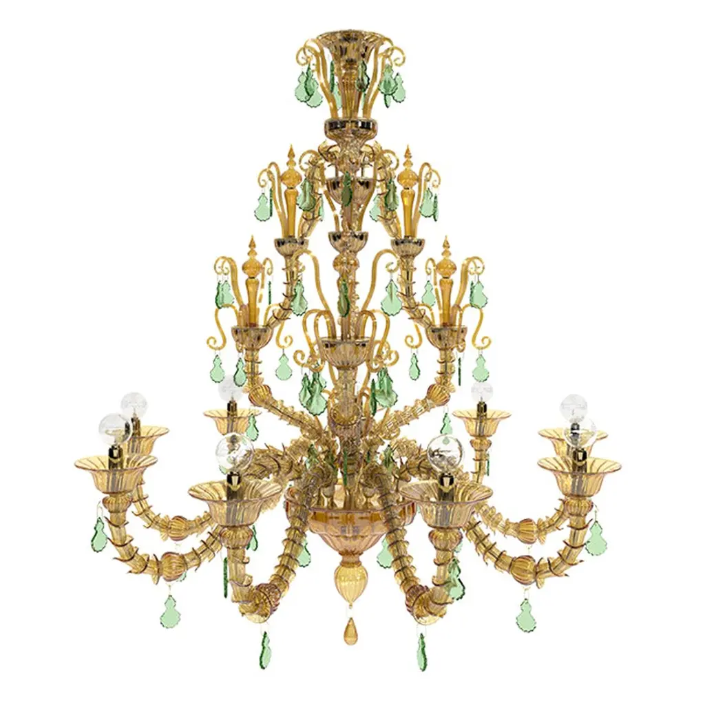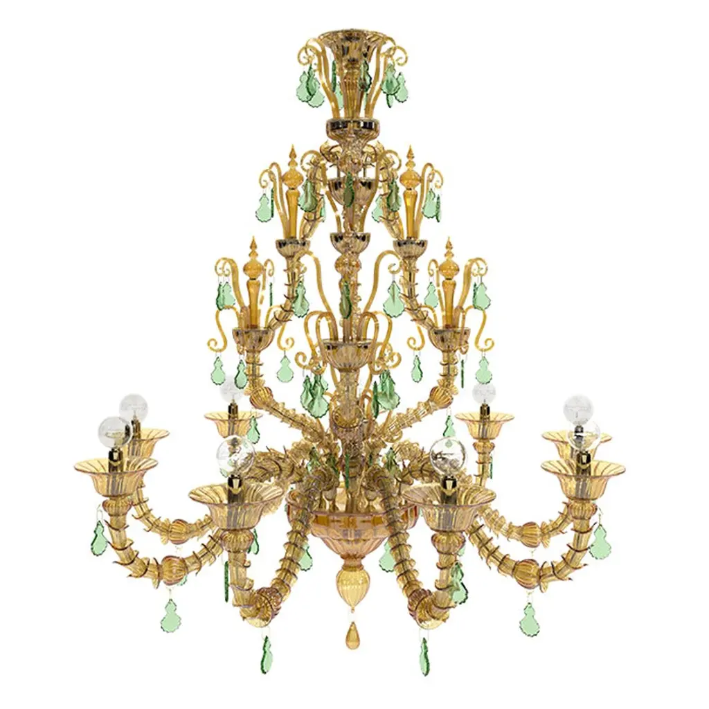 Vittoriale chandelier, designed by Napoleone Martinuzzi and manufactured by Venini, features a blown glass body with gold plated metal chain. Originally designed in 1926 is available with 6 or 12 arms. Numbered edition per year. Indoor use only.Dimensions: Ø 105 cm, H 108 cm.