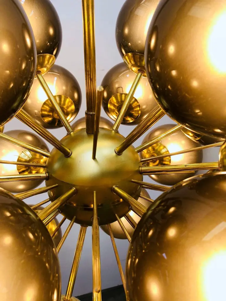 Italian sputnik chandelier with 24 Murano glass globes mounted on brass frame / Designed by Fabio Bergomi for Fabio Ltd / Made in Italy24 lights / E12 or E14 type / max 40W eachDiameter: 28 inches / Height: 39 inches including rod and canopyOrder only / This item ships from ItalyOrder Reference #: FABIOLTD VENTIQUATTRO