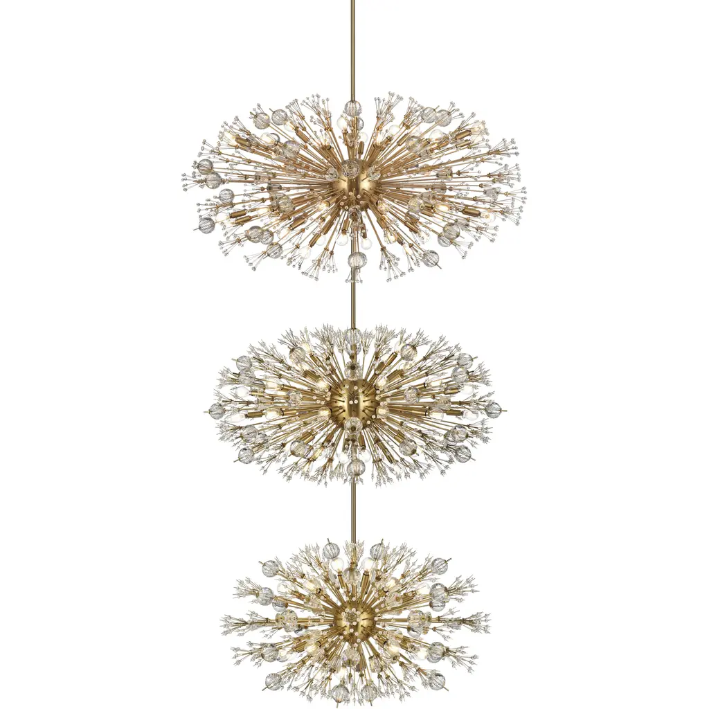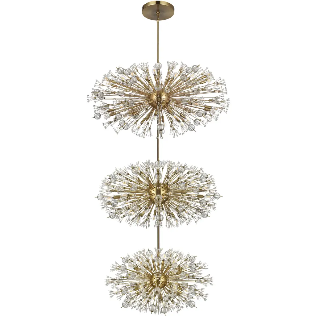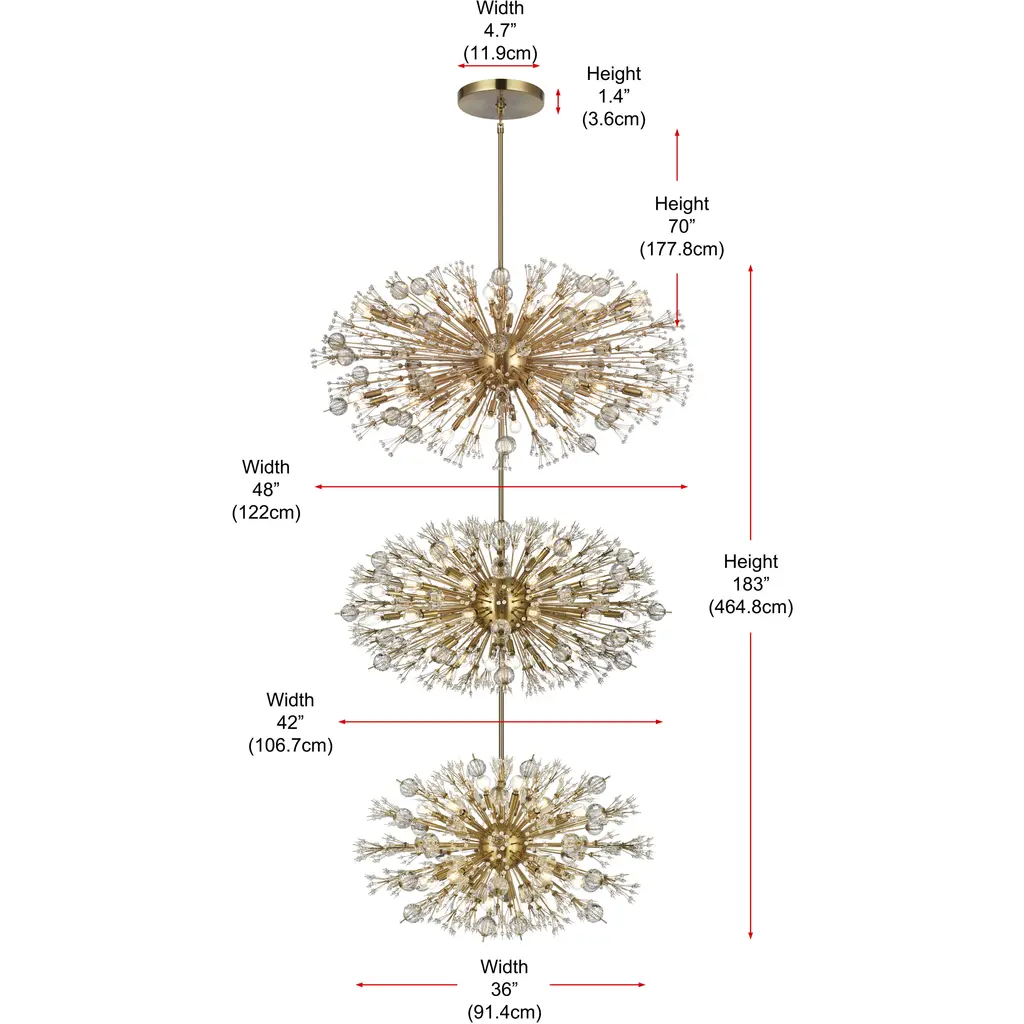 Like an explosion frozen in time, Vera collection hanging fixtures are suspended chaos. Clear large crystal balls and sprays of smaller crystals swirl amidst exposed candelabra bulbs (not included) balanced on dainty wires. A gleaming steel sphere forms the epicenter of the storm. A touch of savage beauty that easily compliments an entry or living room. Sloped ceiling adaptable with a durable swivel could be mounted on vaulted or angled ceilings. The length between each sphere can be configure to your needs as it comes with 70 inch long hanging rods. You can choose to hang the sphere from largest to smallest or vice versa.
