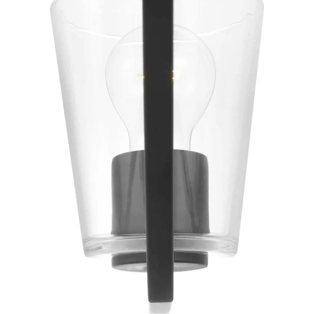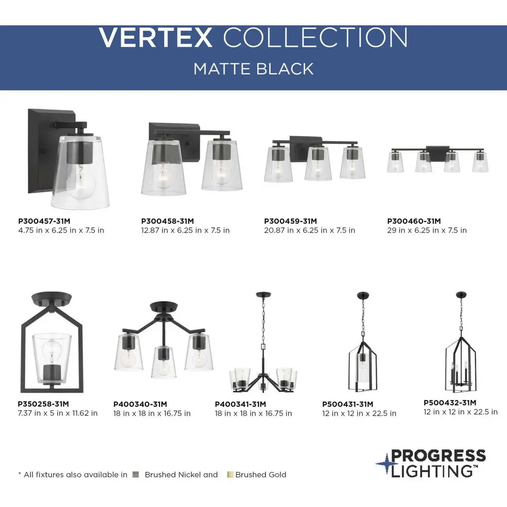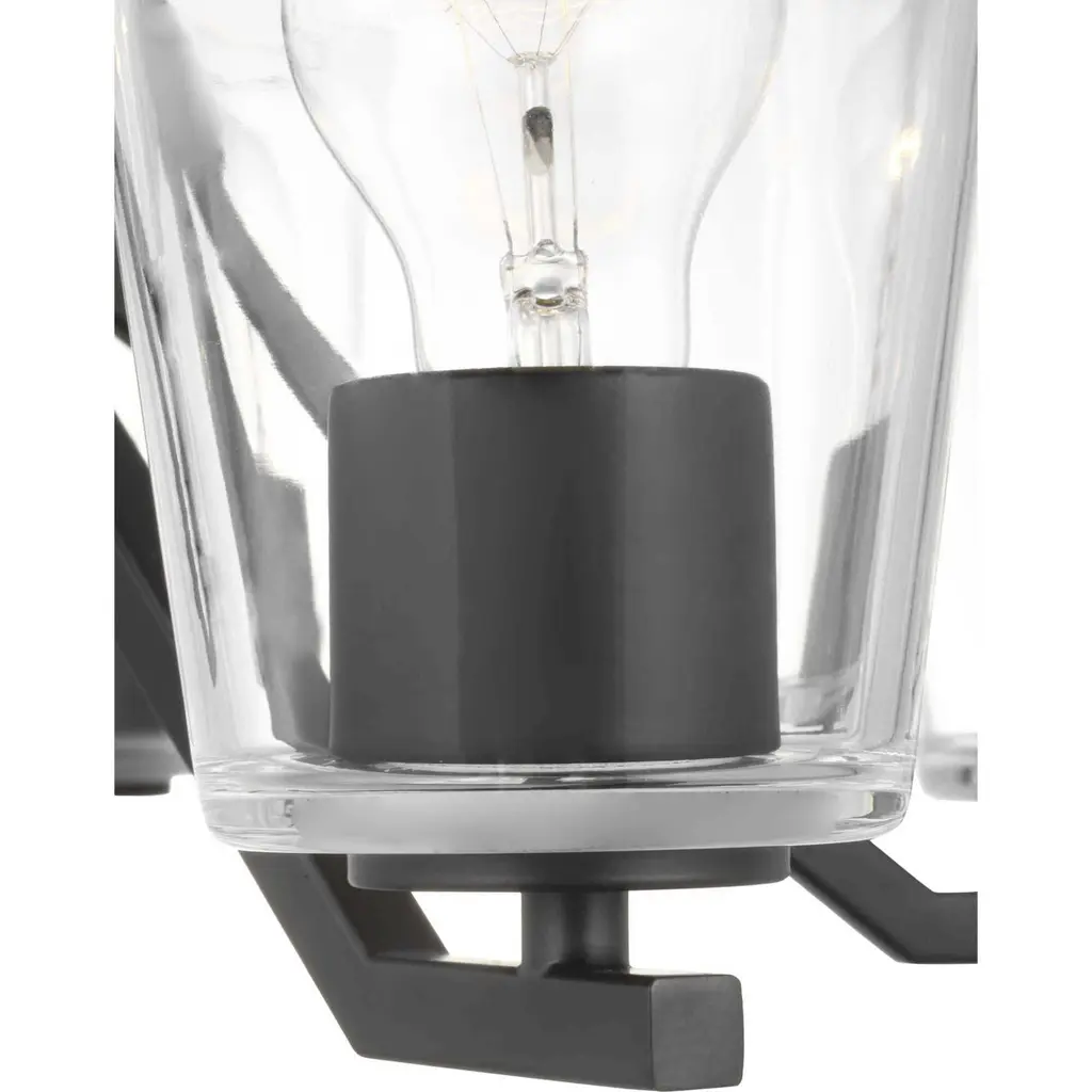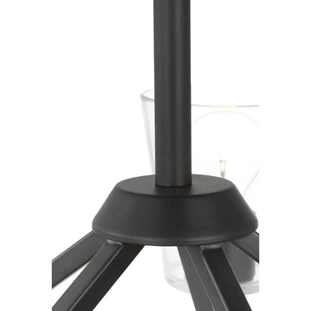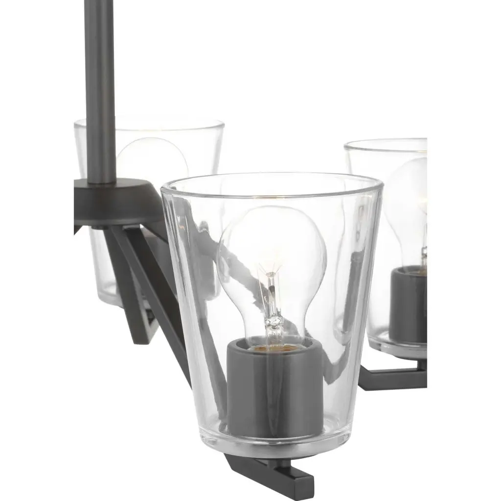 Elegantly extended, the Vertex chandelier is composed of angular forms to create a bold design that perfectly complements dining rooms and living rooms in modern interiors. Its distinctive silhouette is coated in asp matte black finish. A clear glass shade offers bright illumination to spaces below. Customize the chandelier's hanging height to your ceiling using the Included 48 in. of chain for a variety of ceiling heights and sloped ceilings.