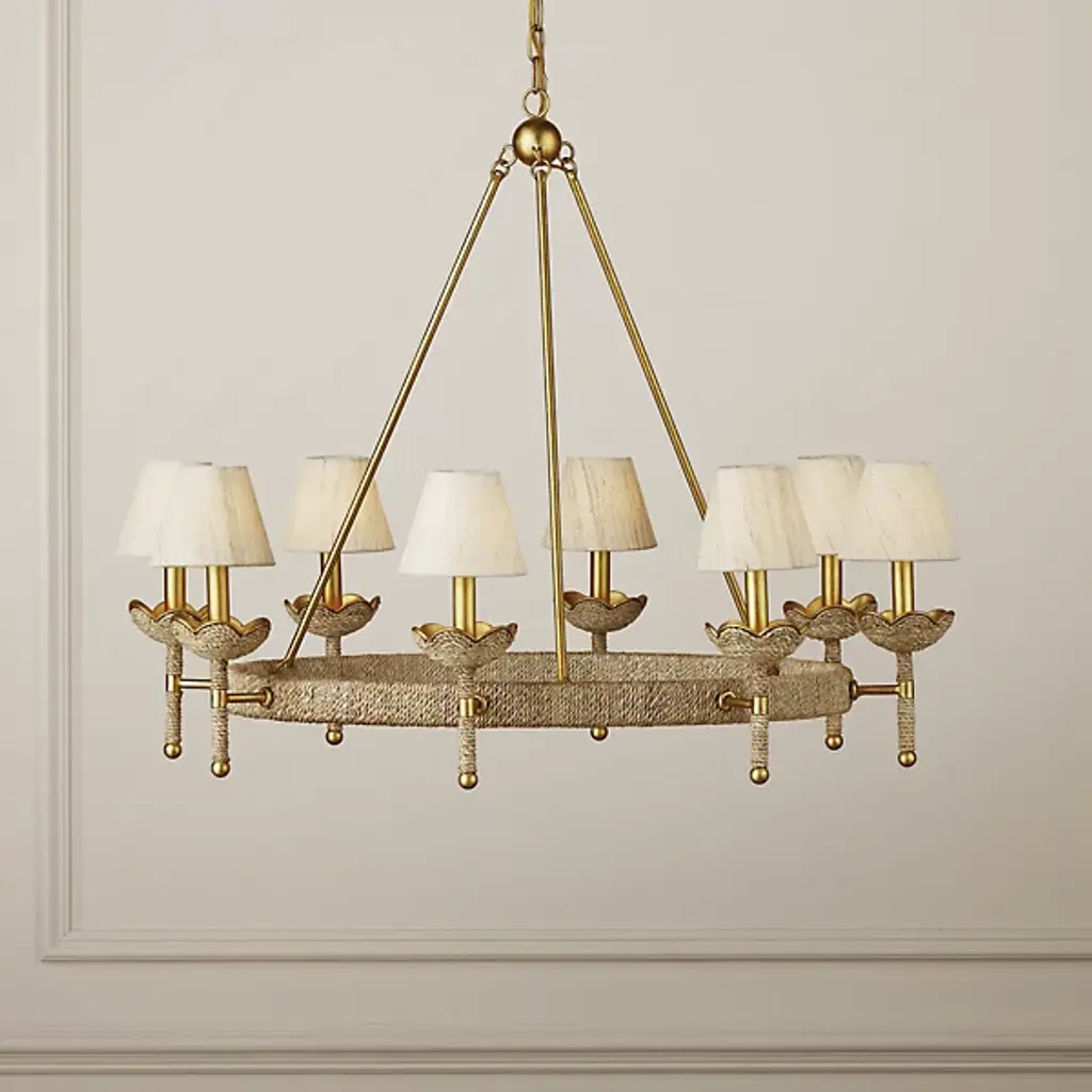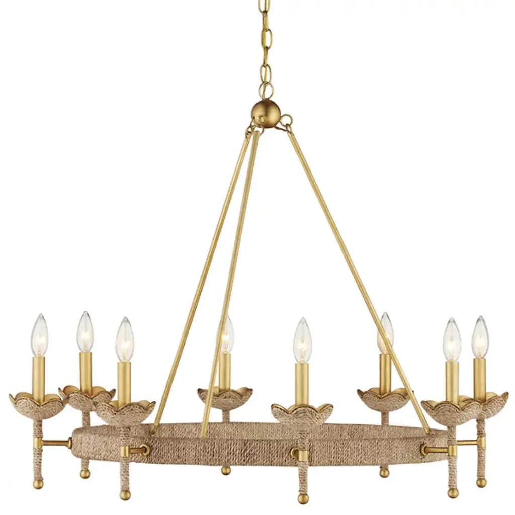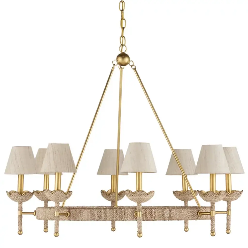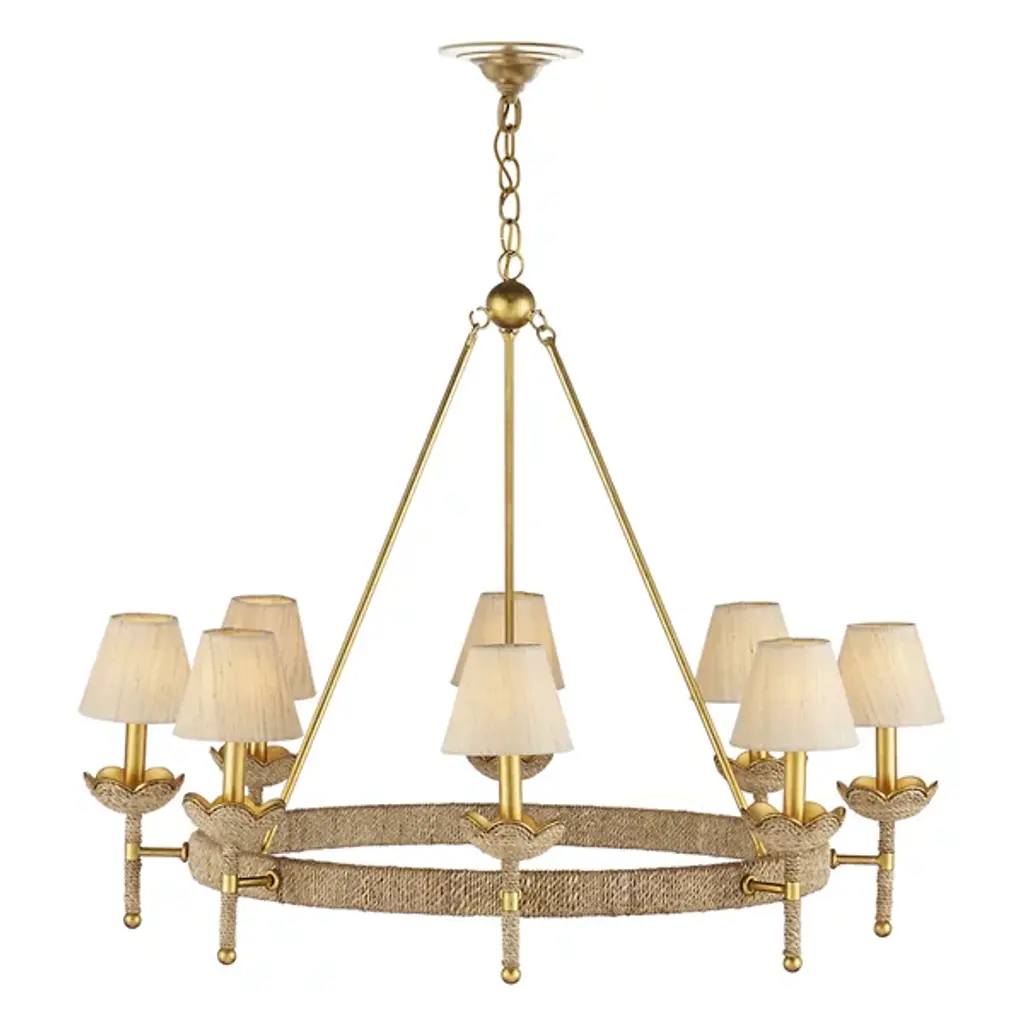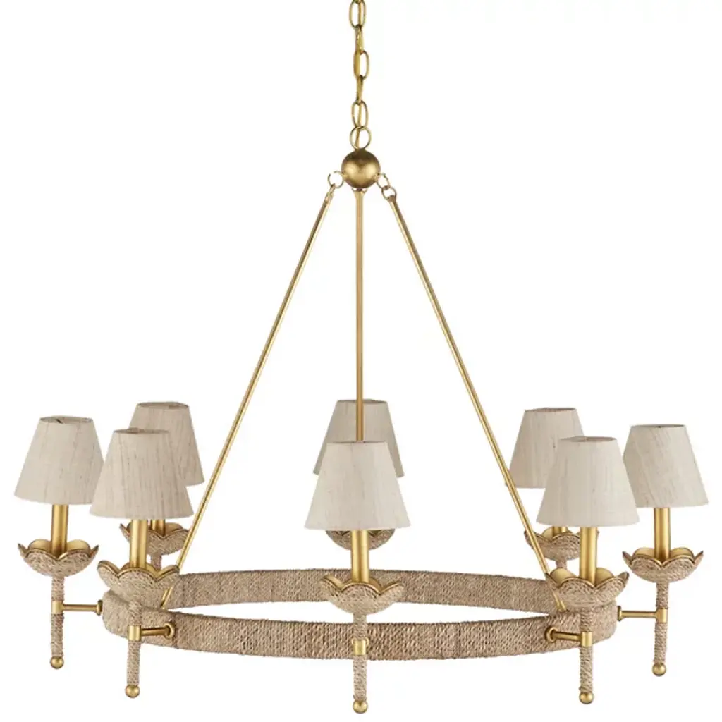 The Vichy Chandelier from Currey & Company was designed by Suzanne Duin. It seamlessly blends elegance with transitional aesthetics. The chandelier features a captivating ring-shaped framework gracefully connected to downrods, culminating in a globe suspended delicately from a linked chain. This visual intrigue of the chandelier’s design creates a sense of balance. Crafted with precision, the chandelier is made from a harmonious combination of abaca rope and wrought iron. The linen shades add a touch of refinement.