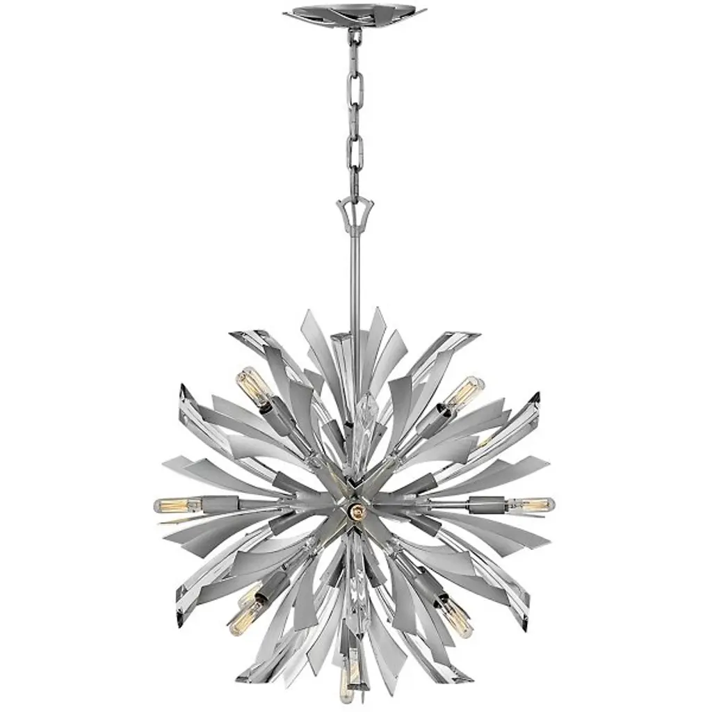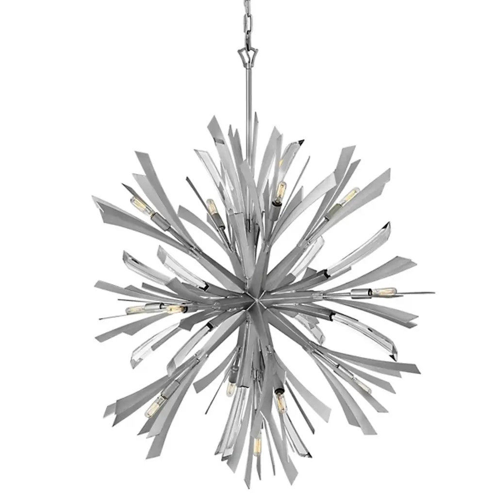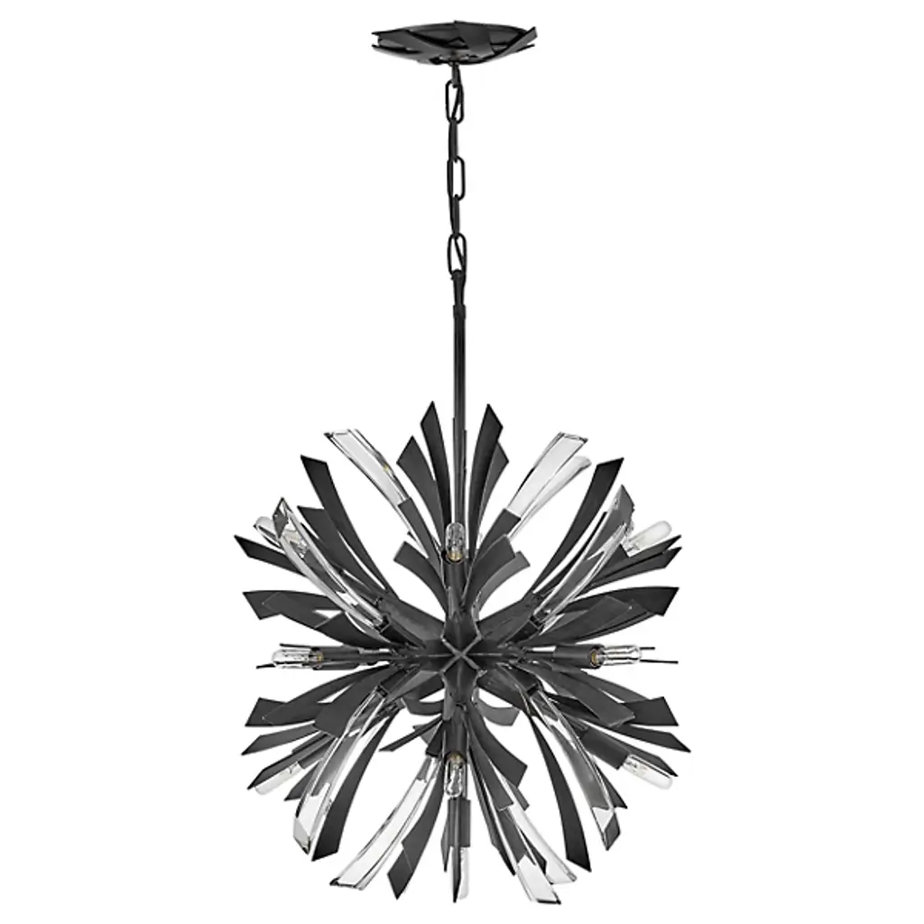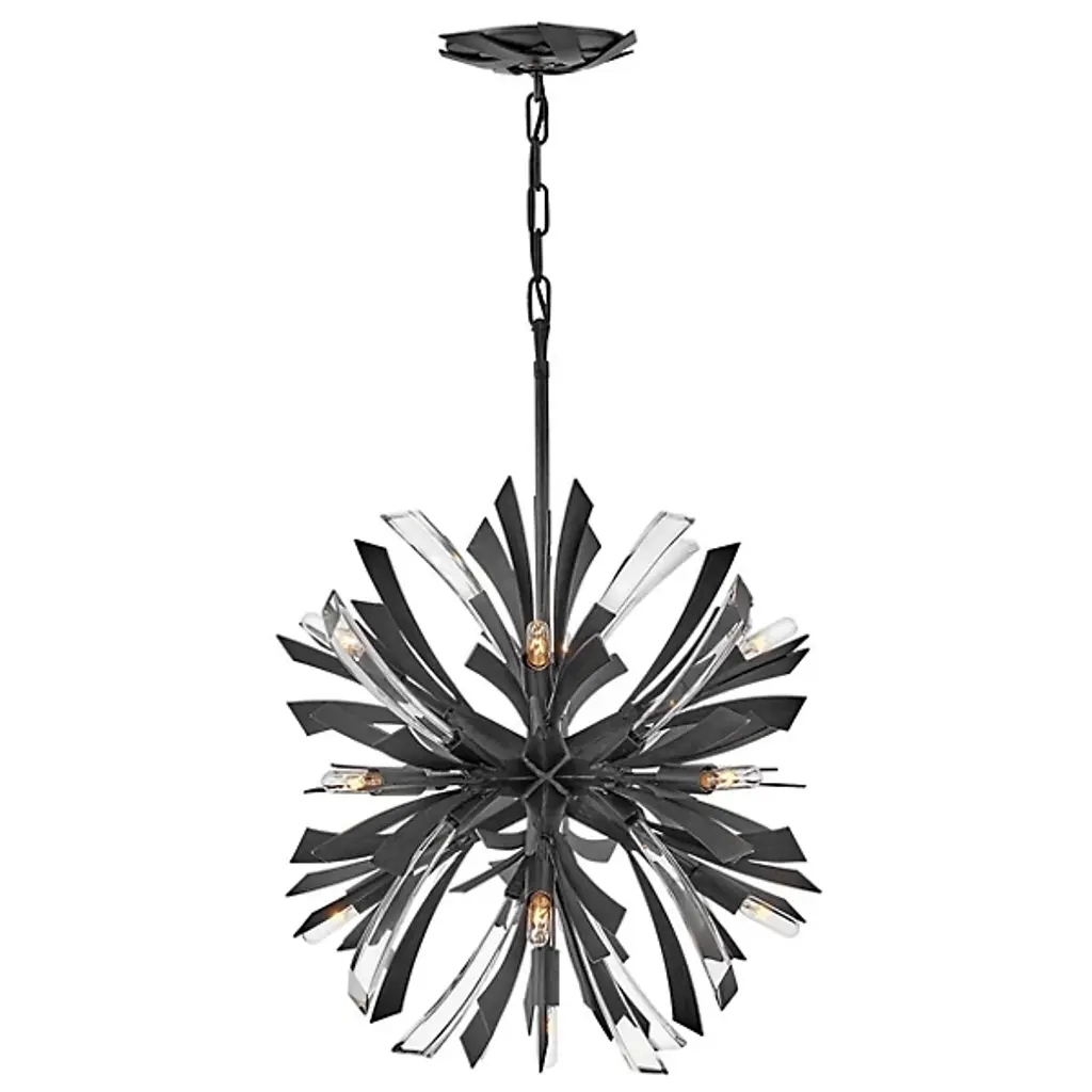 The Vida Orb Chandelier by Fredrick Ramond is an elegant and sculptural piece. Curved and sweeping steel pieces are layered with candelabras and crystal accents for a glamorous, sputnik-style fixture. Supporting this orb-like silhouette, a circular canopy with unique detailing and a decorative loop adds a finishing touch. Dramatic and statement worthy, this addition to your home lends a welcoming source of light within a layered display of mixed materials.