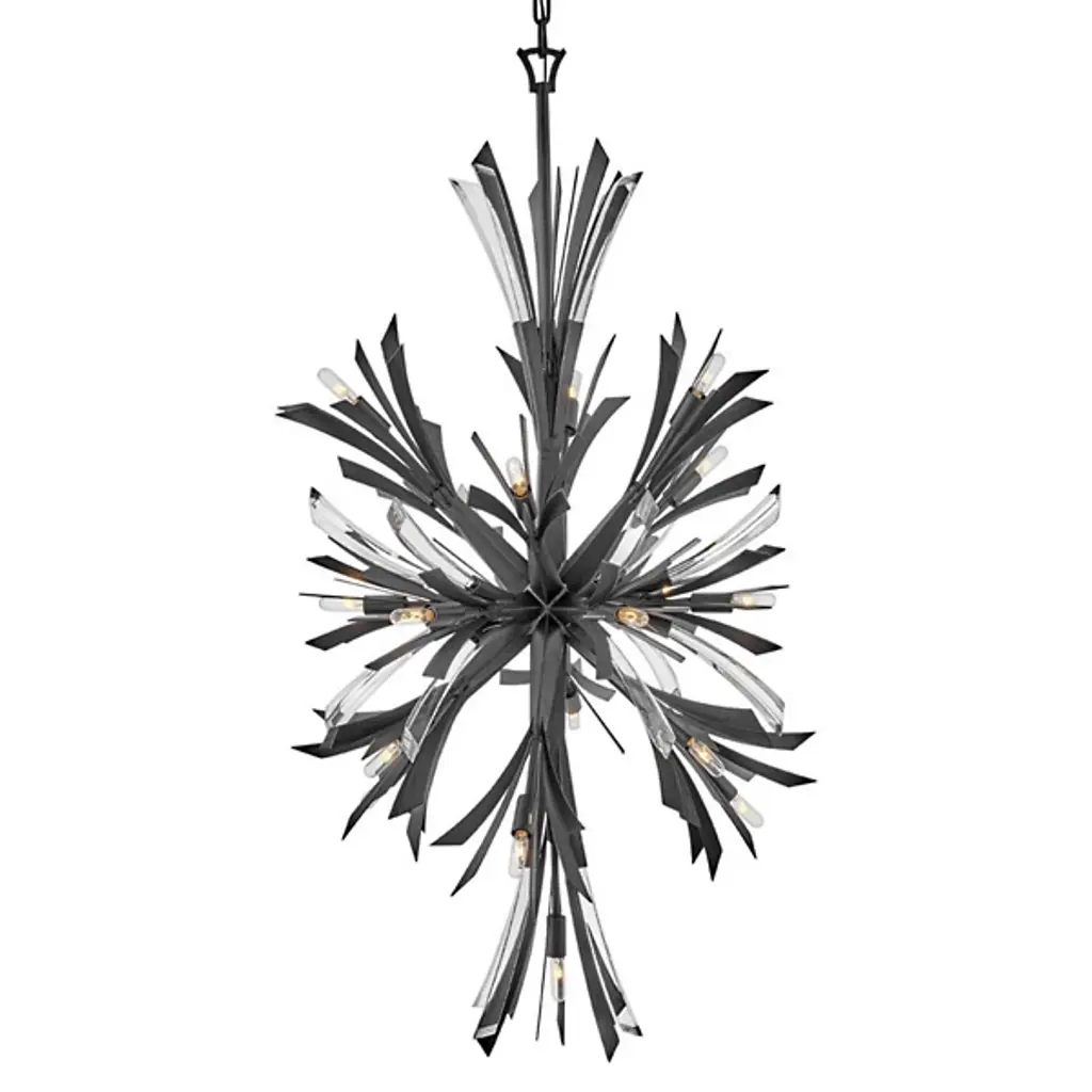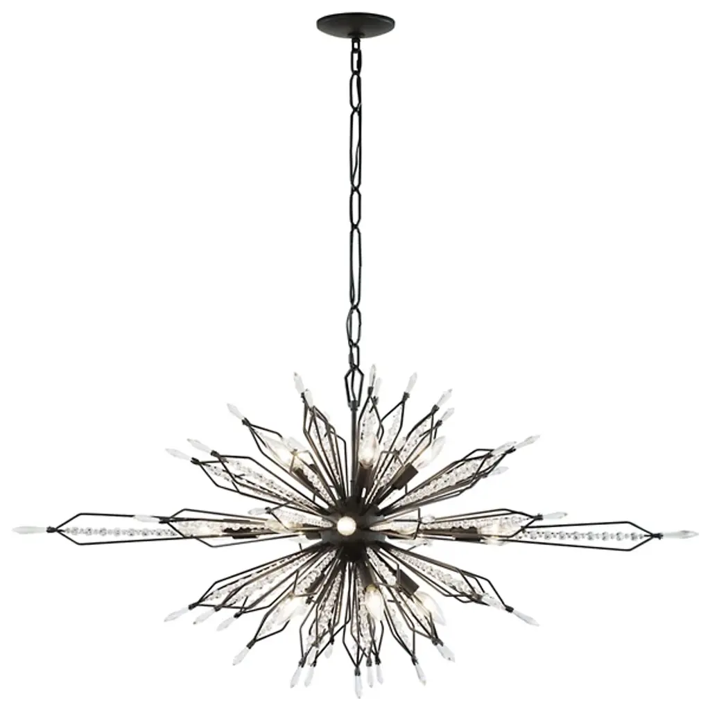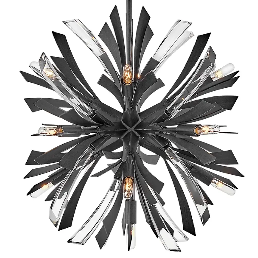 The Vida Orb Chandelier by Fredrick Ramond is an elegant and sculptural piece. Curved and sweeping steel pieces are layered with candelabras and crystal accents for a glamorous, sputnik-style fixture. Supporting this orb-like silhouette, a circular canopy with unique detailing and a decorative loop adds a finishing touch. Dramatic and statement worthy, this addition to your home lends a welcoming source of light within a layered display of mixed materials.
