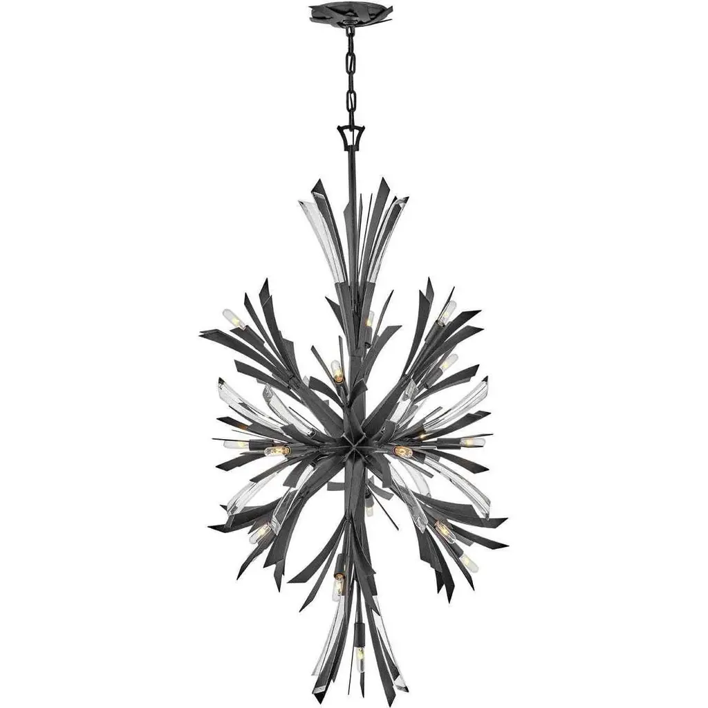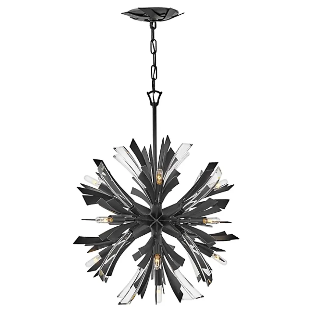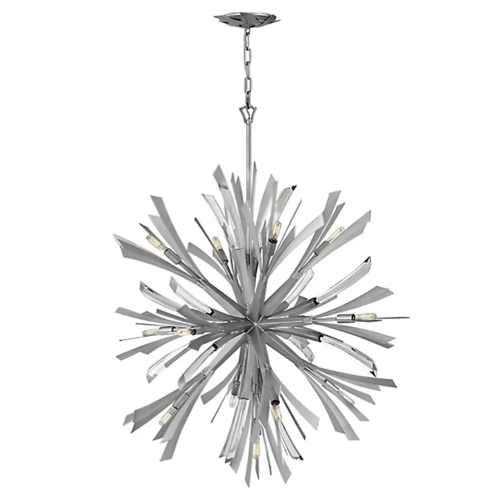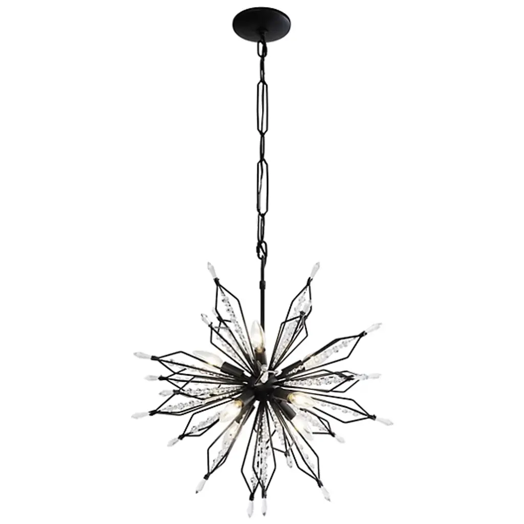 The Vida Orb Chandelier by Fredrick Ramond is an elegant and sculptural piece. Curved and sweeping steel pieces are layered with candelabras and crystal accents for a glamorous, sputnik-style fixture. Supporting this orb-like silhouette, a circular canopy with unique detailing and a decorative loop adds a finishing touch. Dramatic and statement worthy, this addition to your home lends a welcoming source of light within a layered display of mixed materials.