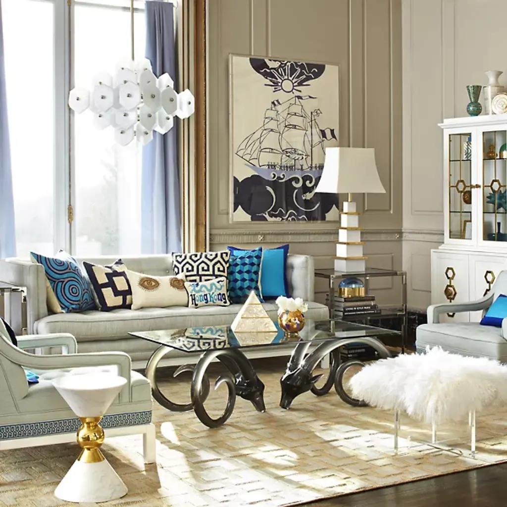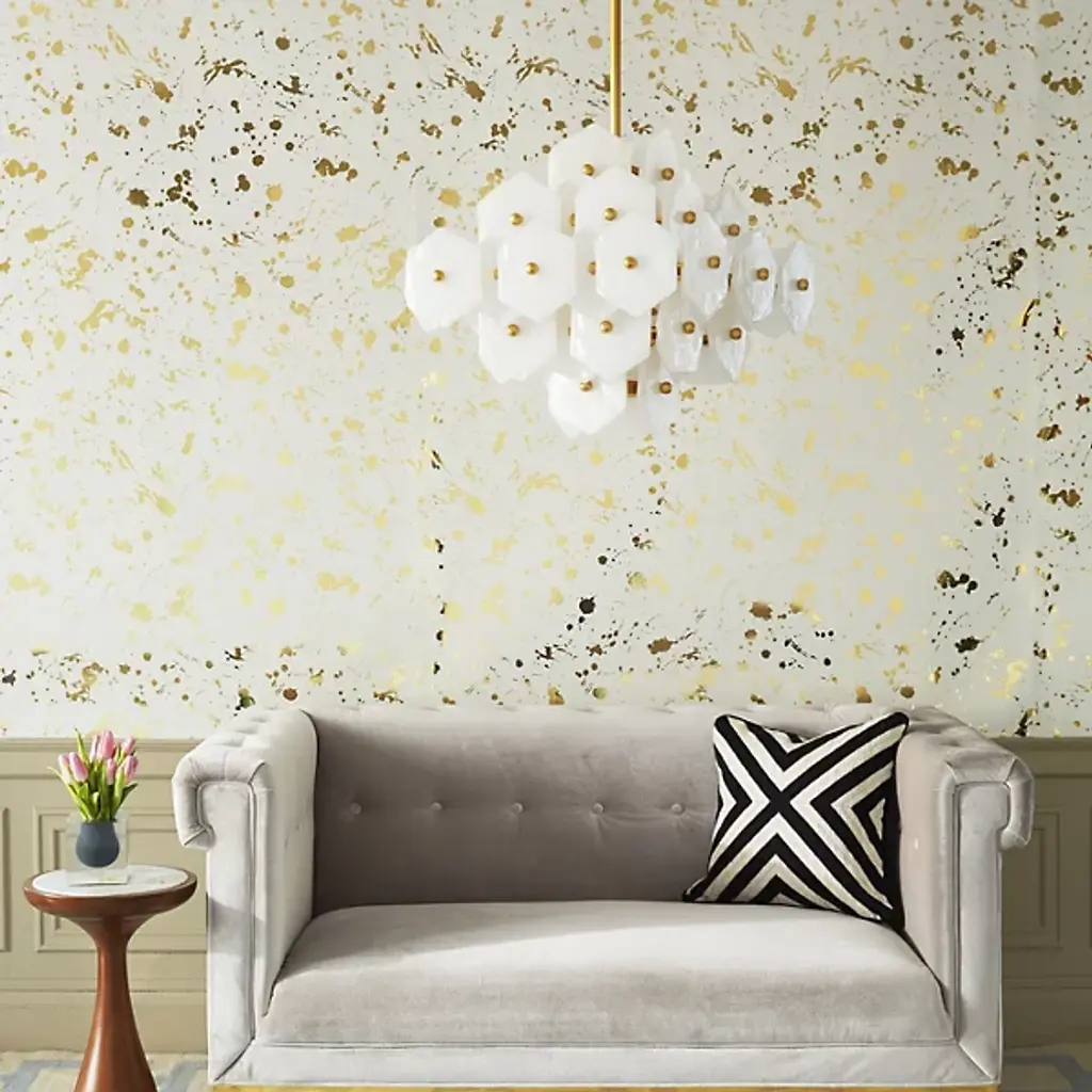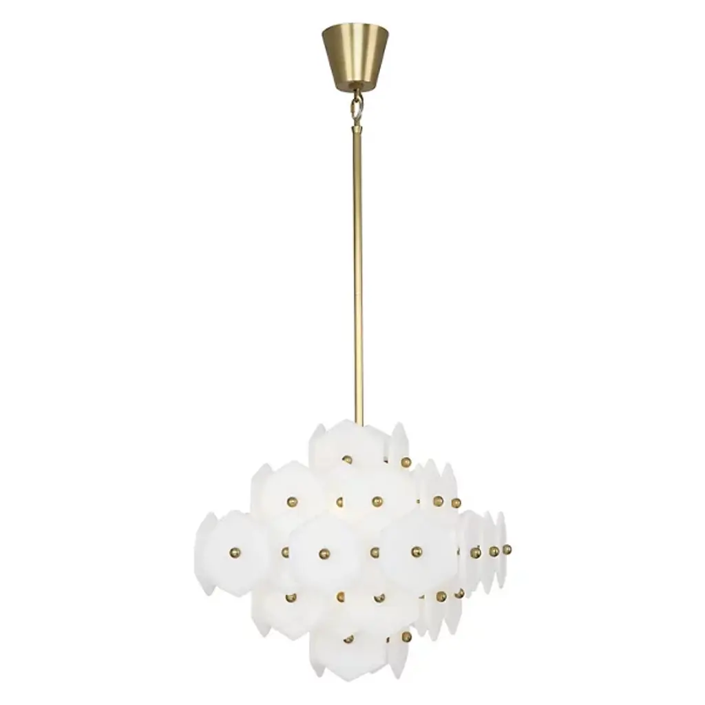 The Vienna Chandelier from Jonathan Adler is a modern tribute to the glamorous mid-century glass chandeliers, capturing their timeless elegance. This stunning piece features a dazzling array of hexagonal panels of Pulegoso glass, meticulously arranged to form a striking diamond shape. Each glass panel is securely affixed to a sturdy metal structure, enhanced with an ornamental ball for added sophistication. This chandelier effortlessly combines vintage charm with contemporary design, making it a perfect statement piece for any luxurious setting.