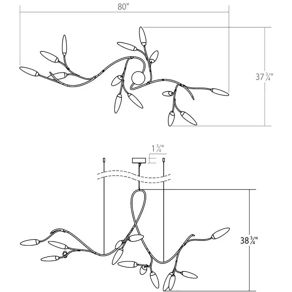 Organically sweeping curves undulate in flowing vine-like configurations on which illuminated glass seedpods extend from the softly intersecting branches. Available in several configurations as well as custom sizes, Vines can be suspended singularly or in clusters to scale into dramatically large sweeping installations of extraordinary sculptural presence.