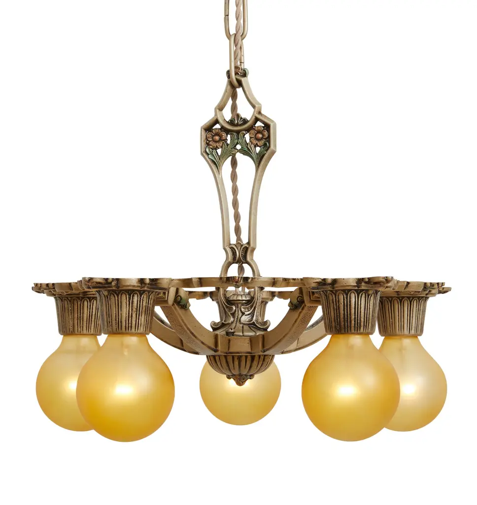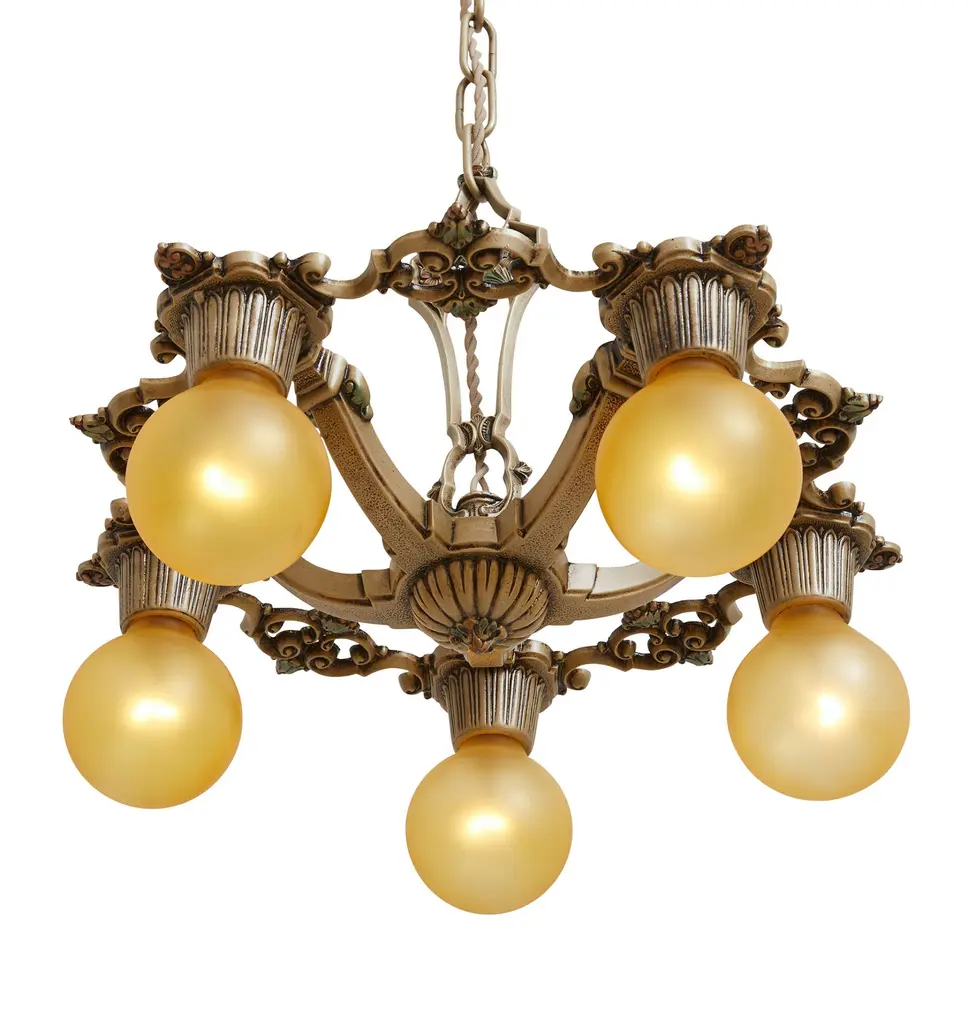 Vintage Classical Revival 5 Arm Bare Bulb Chandelier In Original Finish