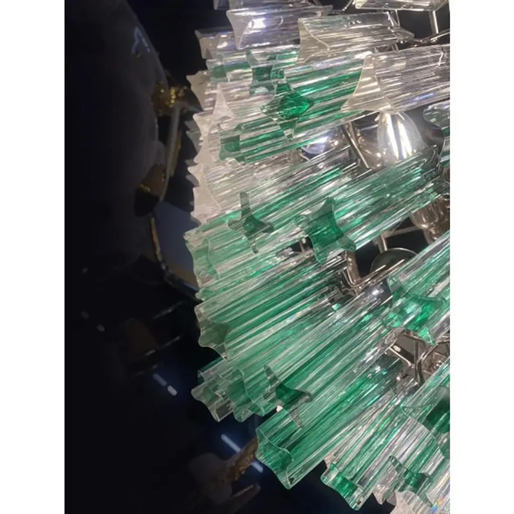 a professional electrician has confirmed this piece is in working order. vintage green “quadriedro” and clear triedro murano glass chandelier luxury murano glass chandelier. made with transparent triedro and old green quadriedro murano glass. limited edition. Exclusive design by simoeng all quadriedro, elements of murano glass are very old. They are handmade and all are different size, shape and inside the color is green. metal frame in chromed plating bath. spare parts are included. Bulbs not included, they are compatible with led sustainability. entirely made in italy,made in murano glass fruit of of high italian know-how. dimensions (cm/in): d 70 cm h 40 cm/ d 27.5″ h 15.7″ finiture: chromed brass metal frame chain 19.7″ more canopy up to 250v (europe/uk standard).