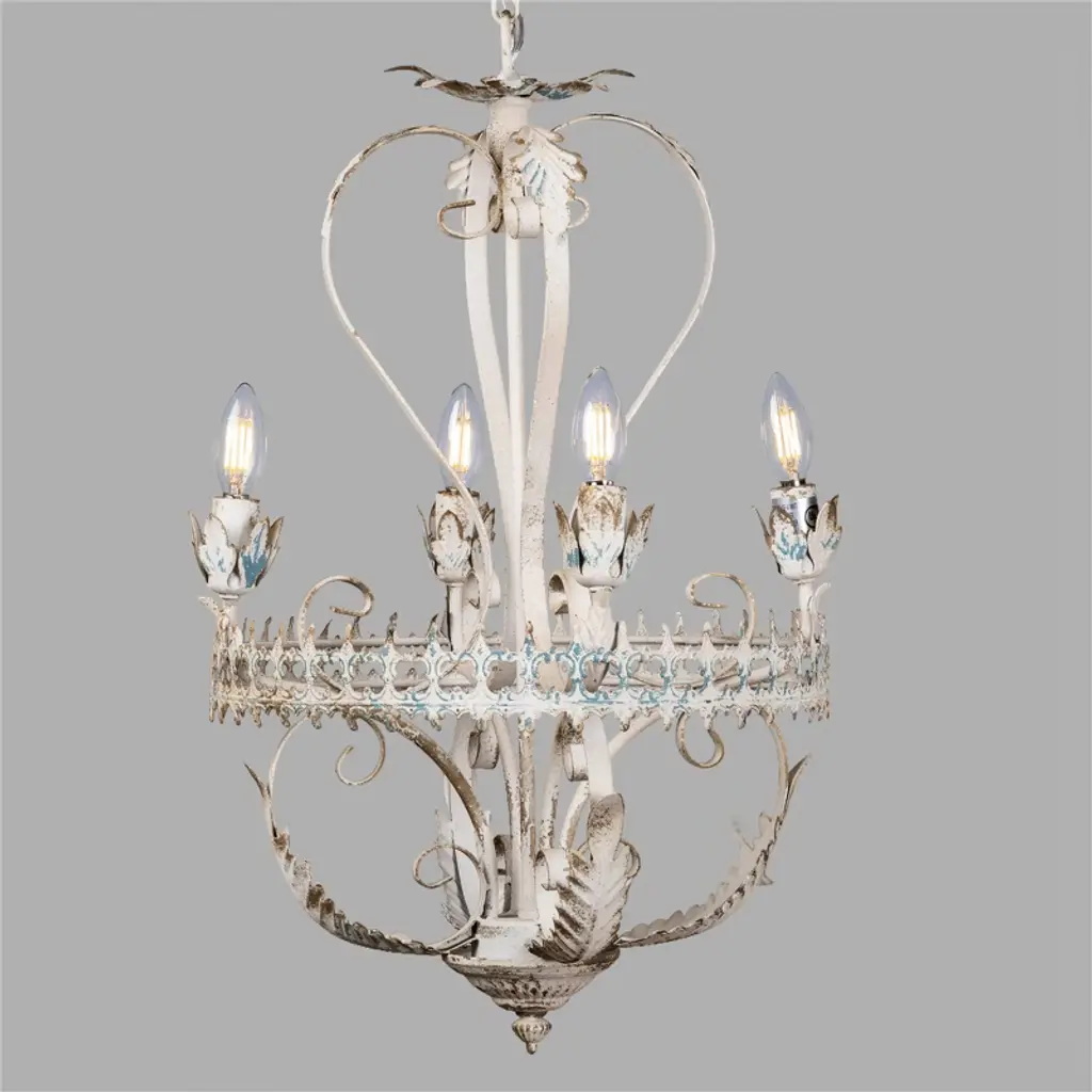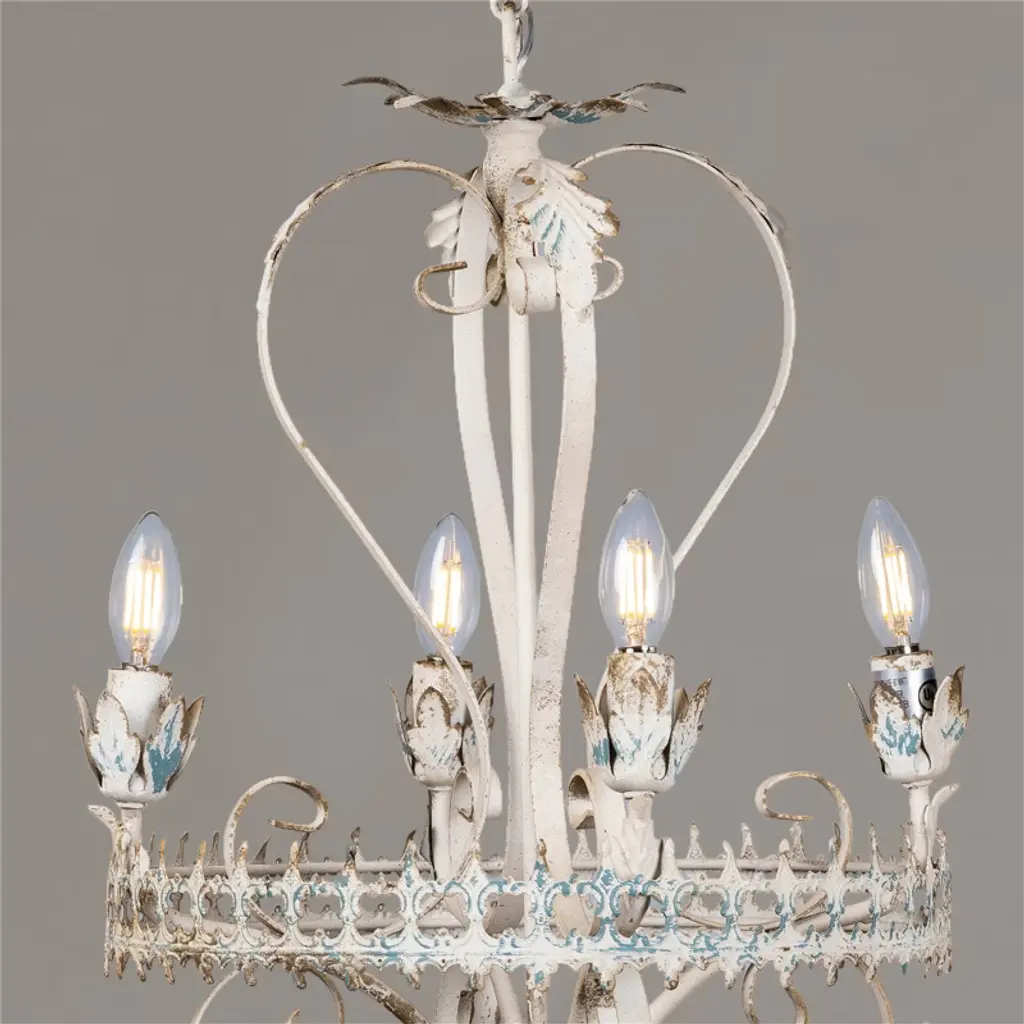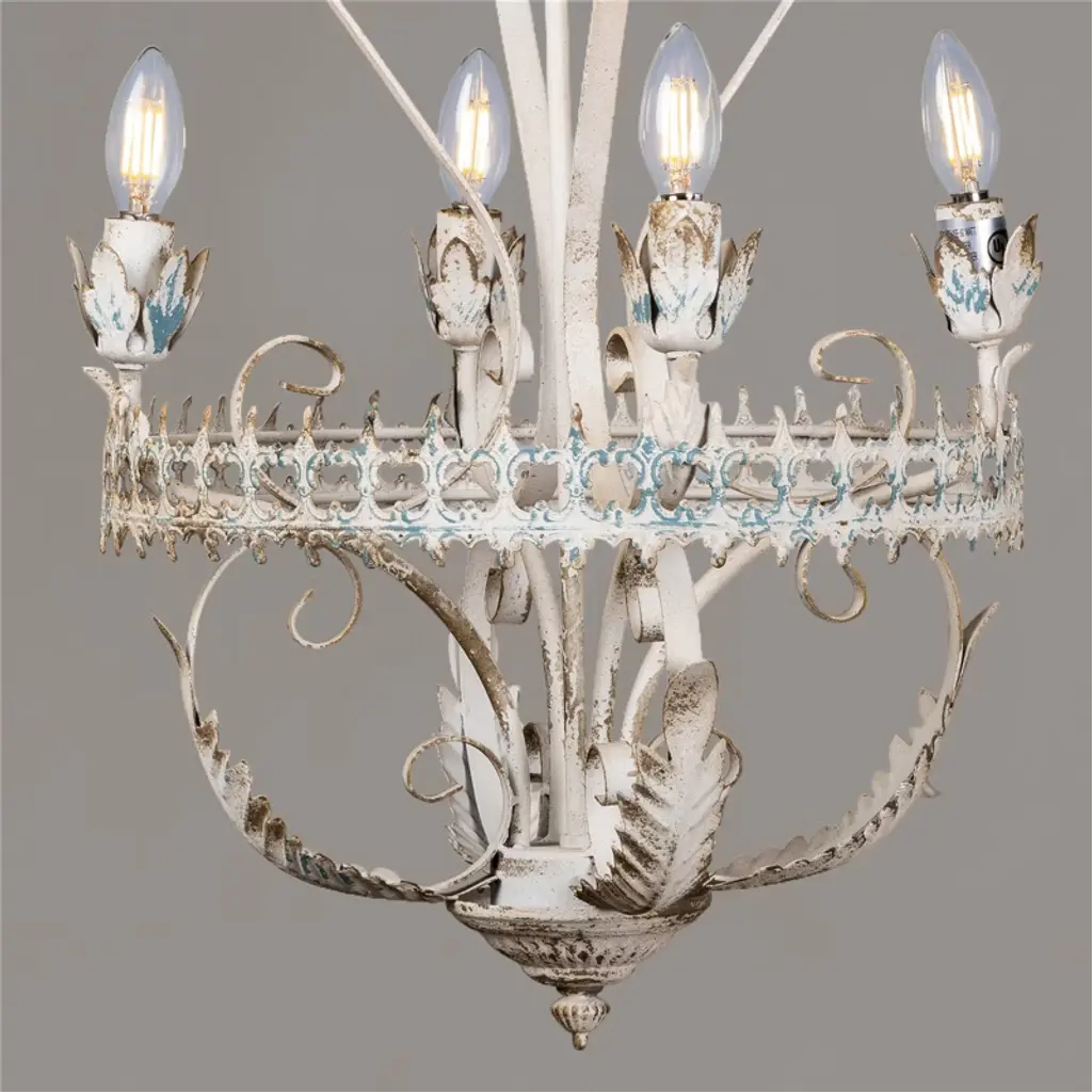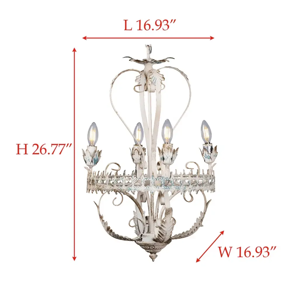 This chandelier has a vintage, shabby chic design with a distressed white finish, giving it a rustic yet elegant appearance. It features ornate, curving metalwork with intricate floral and leaf motifs, creating a romantic and delicate aesthetic. The chandelier holds four candle-style light bulbs, further enhancing its antique appeal. Its overall shape and decorative details make it an ideal centerpiece for a romantic dining room, a cozy living space, or a charming entryway, adding a touch of vintage elegance and warmth to any decor.