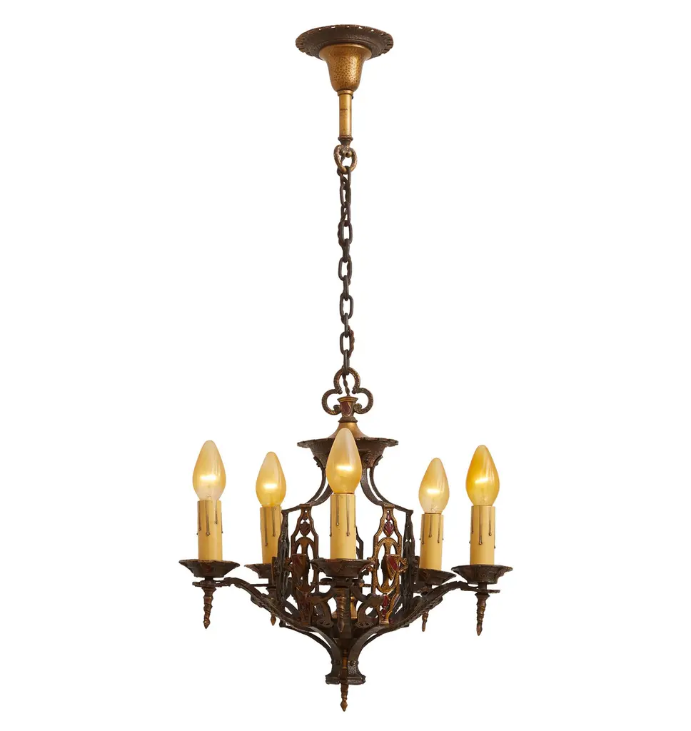 Defining a period from the 1920s and 1940s, Romance Revival design blends an unexpected mix of styles, including Spanish, Tudor, Gothic, Medieval, Moorish, and Hollywood glamour. Elaborate and warm, Romance Revival lighting is often brightly painted with polychrome finishes and capped with artistic flourishes, such as faux rivets and hammering that appear as though they were handcrafted.