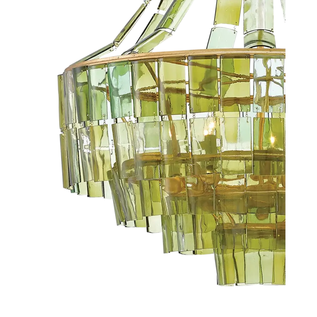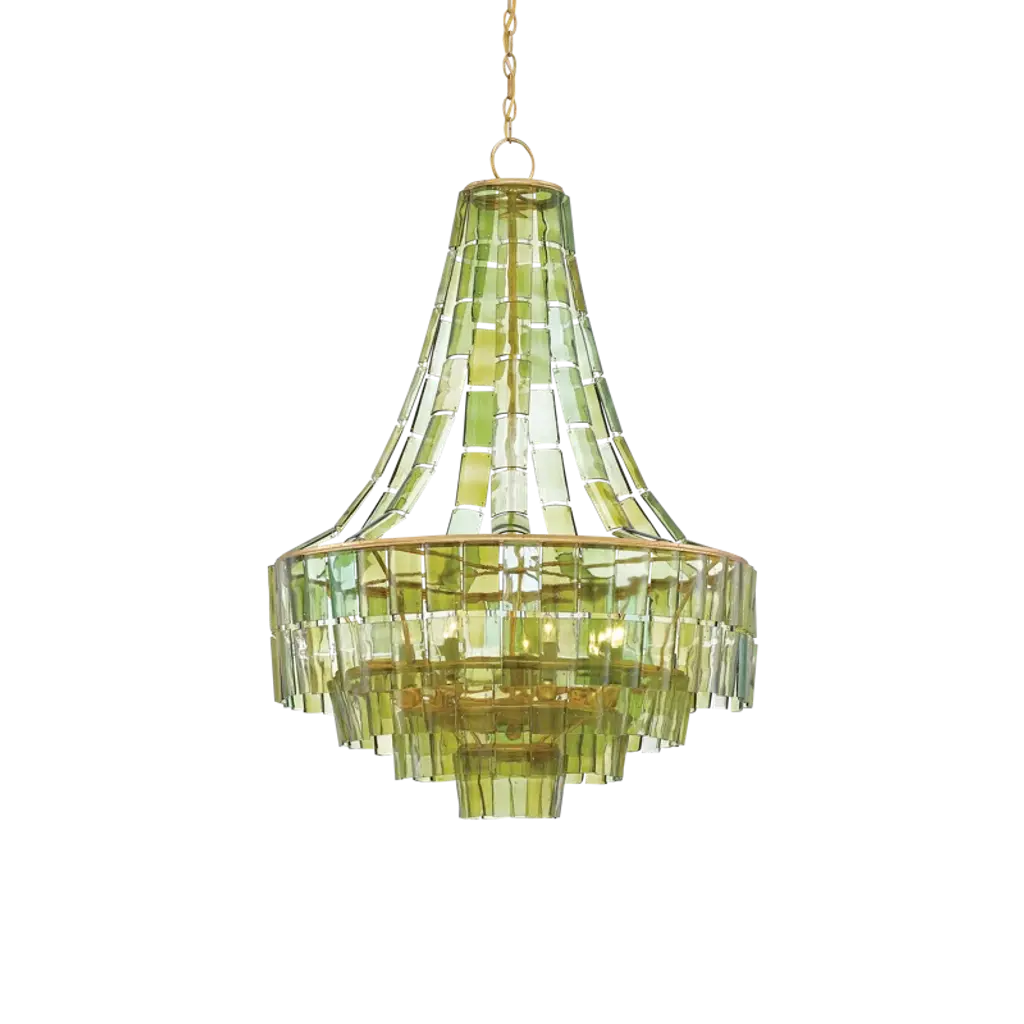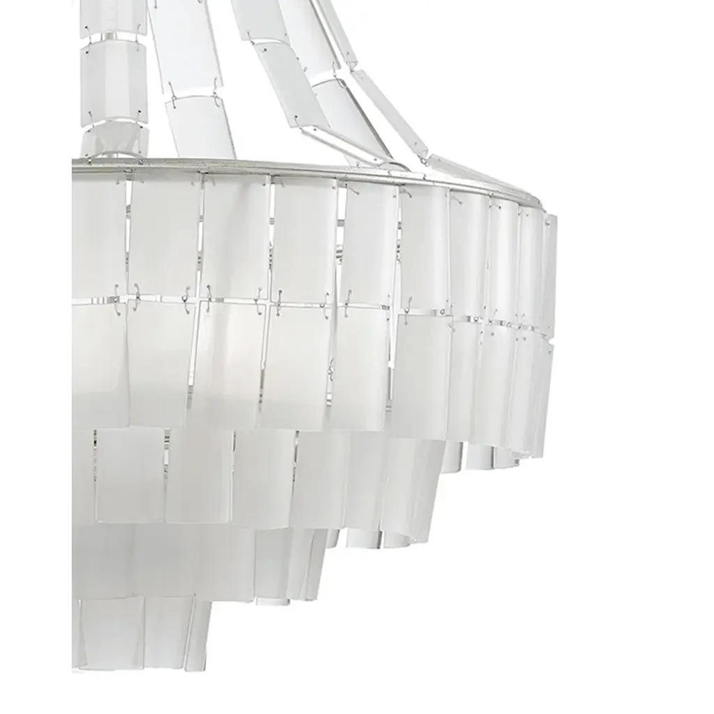 Cascading from the circular frames of the Vintner Blanc Chandelier are individually-cut pieces of glass made from recycled bottles. The texture of the surfaces beautifully complements the contemporary finish on the wrought iron frame.