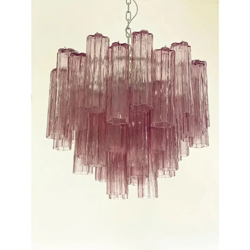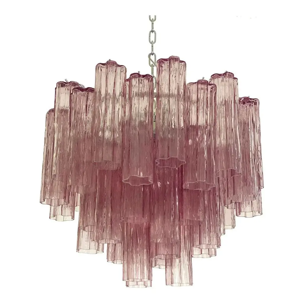Contemporary violet “tronchi” chandelier very rare violet-ametista color tronchi murano glass. “tronchi”are blown inside a wooden mold, into which the hot glass slides. linear metal frame all tronchi are in the same line for three levels. metal frame in chromed plating bath. spare parts are included. Bulbs not included, they are compatible with led sustainability. entirely made in italy, made in murano glass fruit of of high italian know-how. dimensions(cm/in): d 60 cm h 50cm/ d 23.6″ h 19.7″ finiture: krome metal frame chain 19.7″ more canopy up to 250v (europe/uk standard).