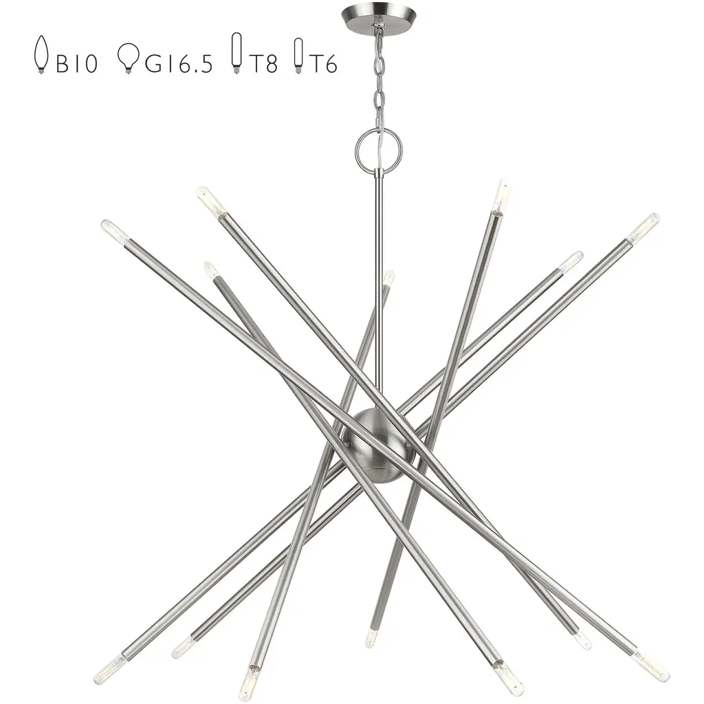 A bold focal point for the entryway or dining room, this chandelier is crafted of steel with a polished nickel finish. We especially love how the arms adjust, allowing you to create intersecting lines and angles as you see fit. Hardwired. Bulbs not included.