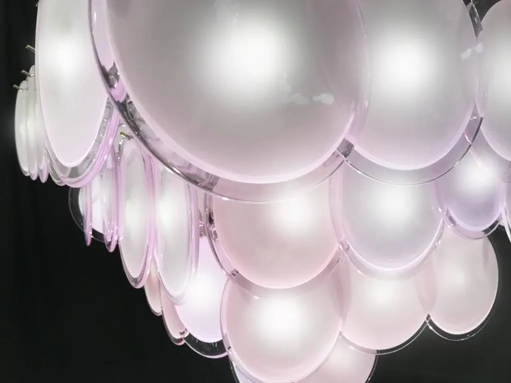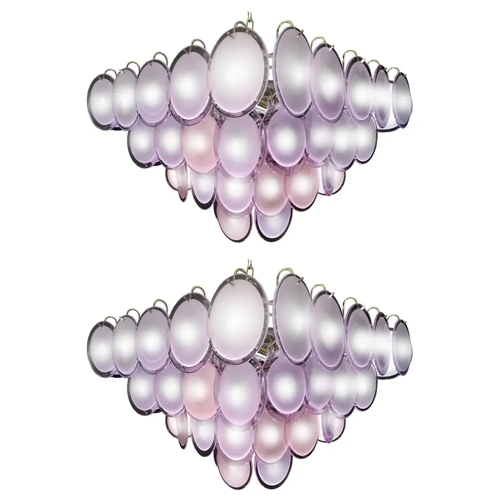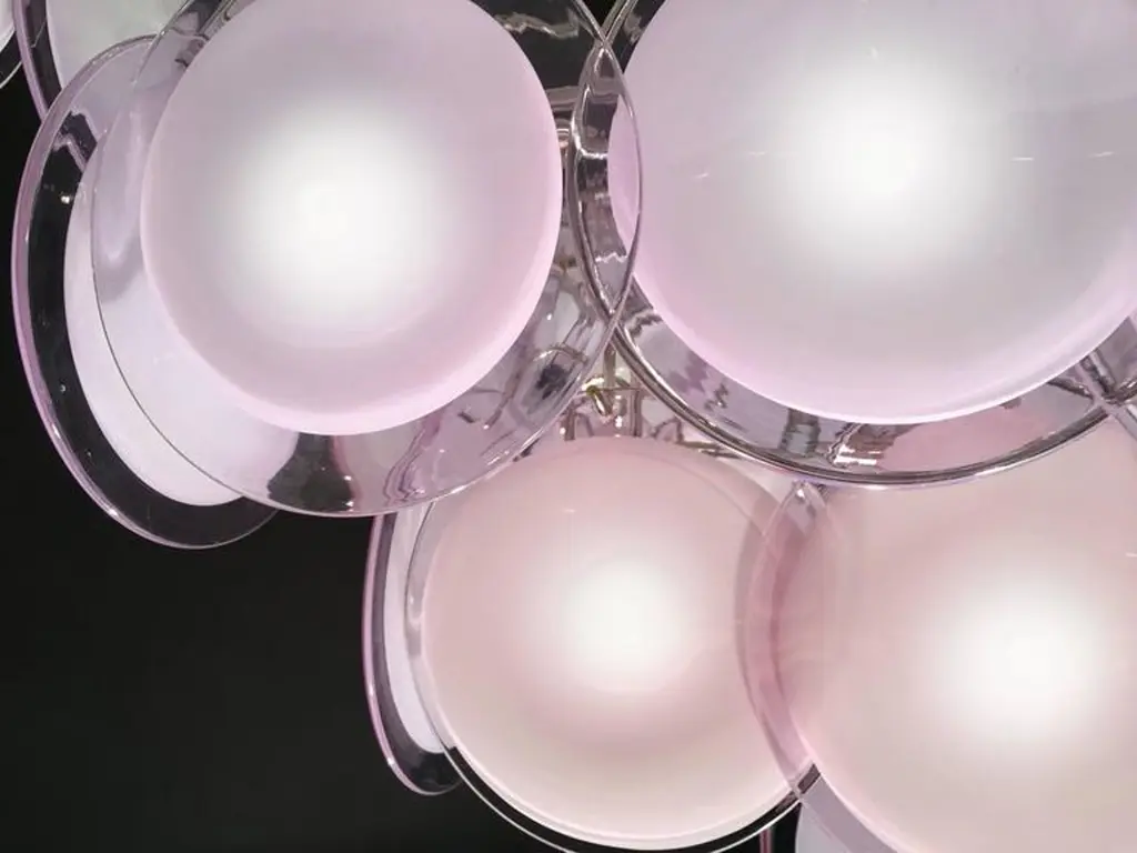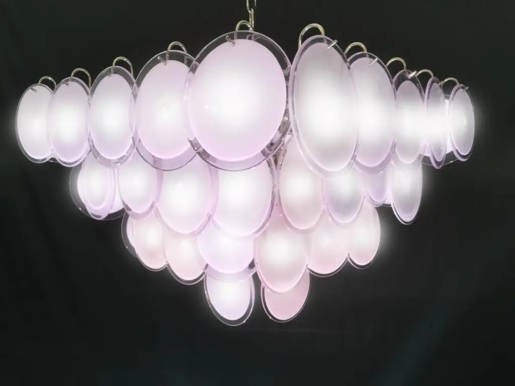 The chandelier is made of 52 discs of precious Murano glass are arranged on four levels. Nine lights.Available four Chandeliers.