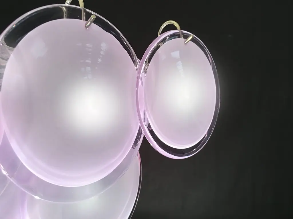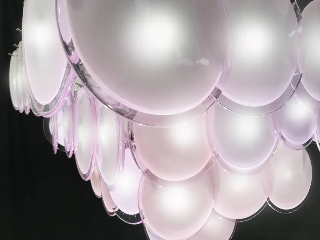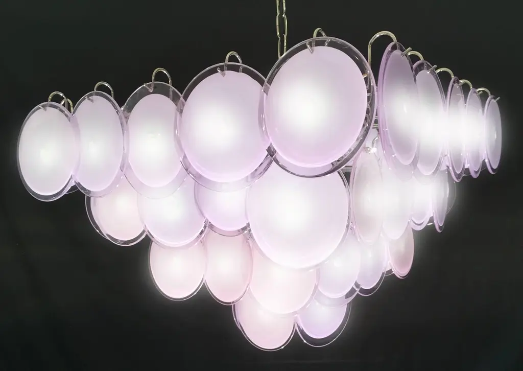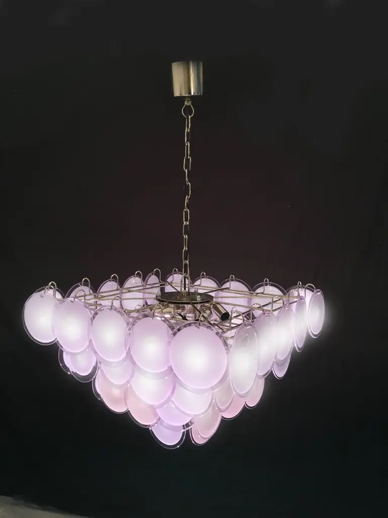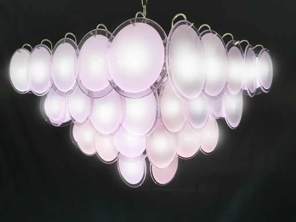 The chandelier is made of 52 discs of precious Murano glass are arranged on four levels.Nine E14 lights.Available four chandeliers.