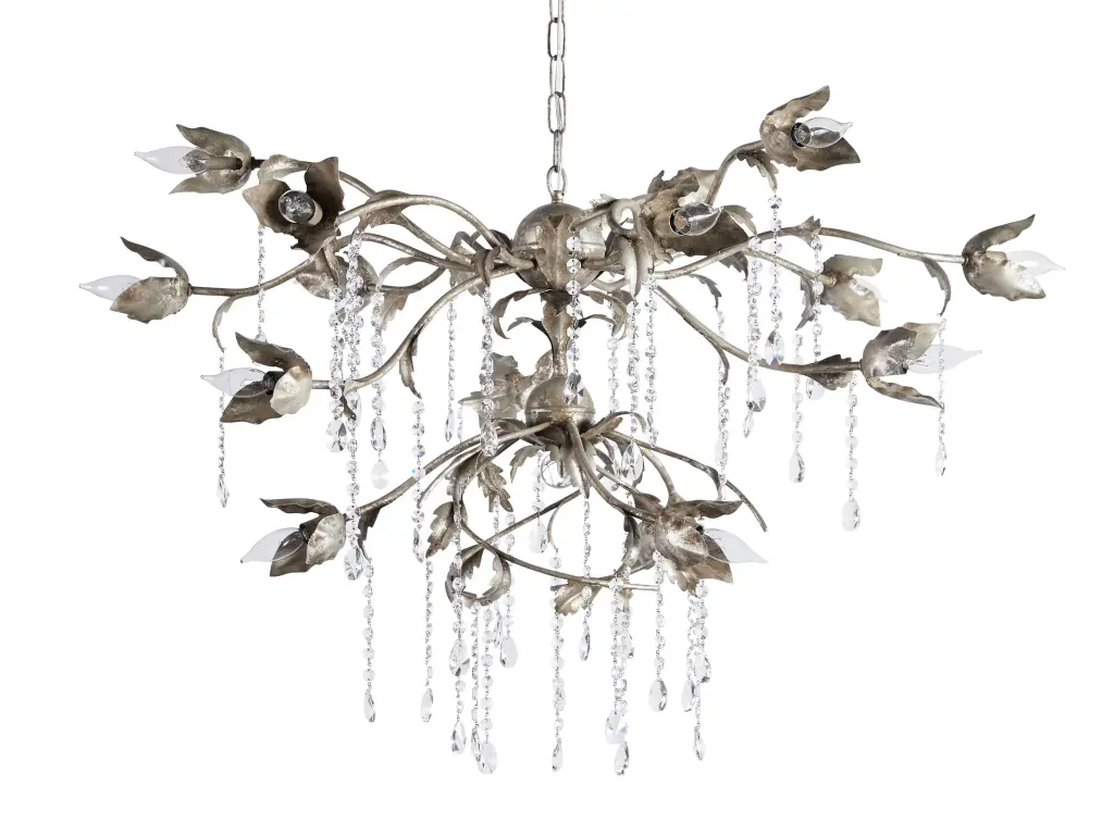 Like freshly fallen rain on draped garden vines, our Viticcio Lighting Collection is hand-moulded by Italian artisans from solid iron. Floral flourishes are elegantly accentuated by a hand-applied silver finish, and hand-strung crystals dangle to scatter drops of light around your space.