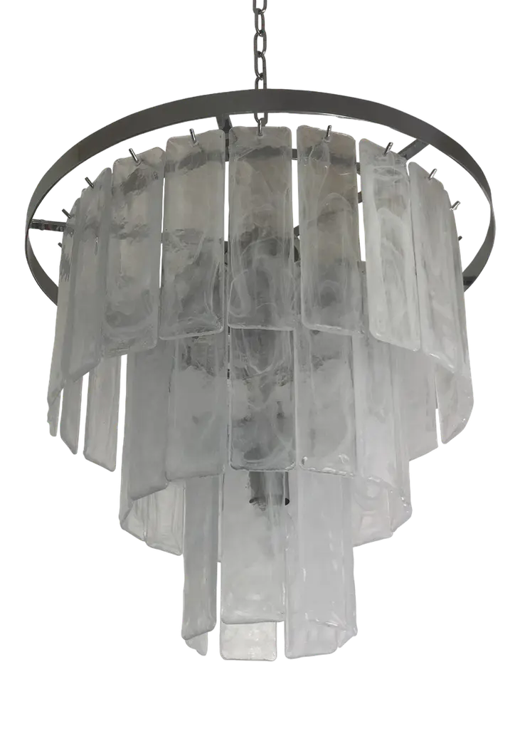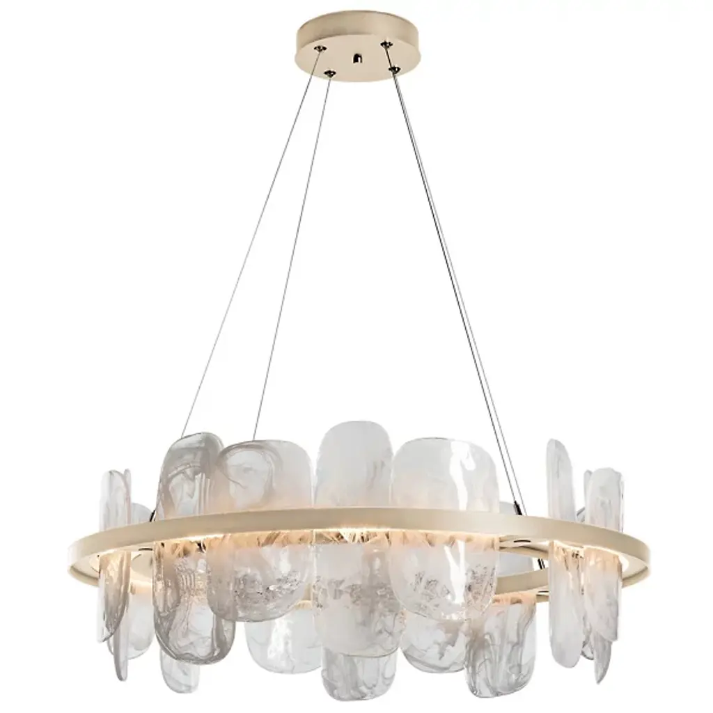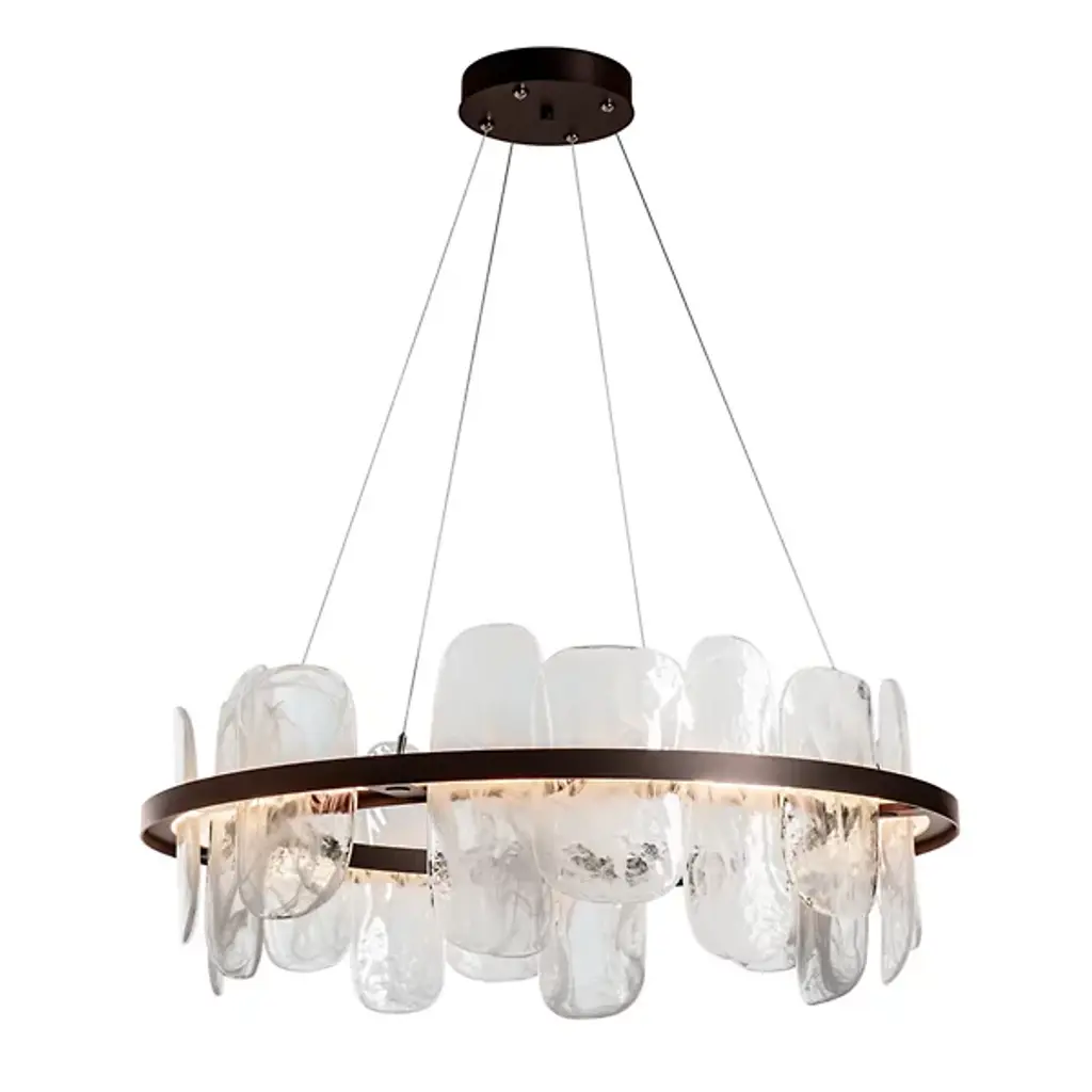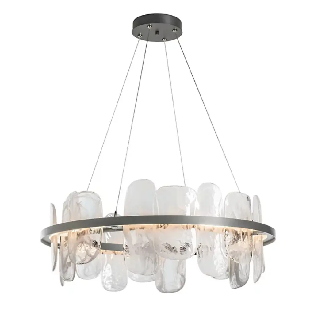 The Vitre Circular LED Chandelier by Hubbardton Forge is a bold and beautiful design. Set within a handcrafted metal halo that is effortlessly suspended, a series of handmade slabs of clear glass with abstract swirls captured in their forms are set vertically within this frame. Each softly shaped slab is slightly different in size and contains its own unique pattern variation, bringing an organic touch to this design as an LED light guide within the round frame casts a layer of illumination both up and down over these elements and onto surroundings.