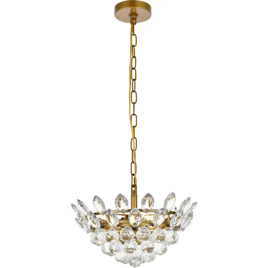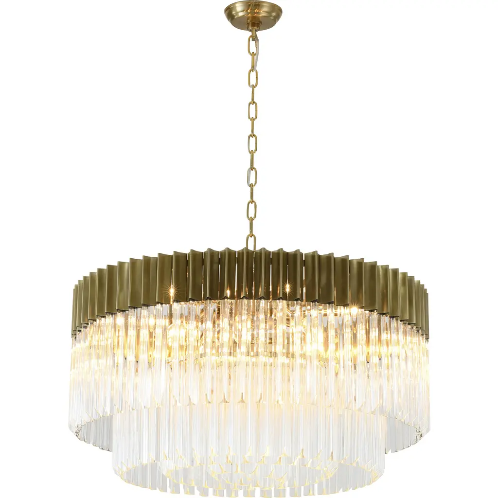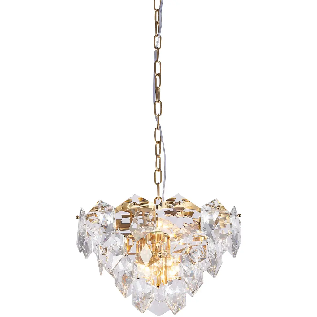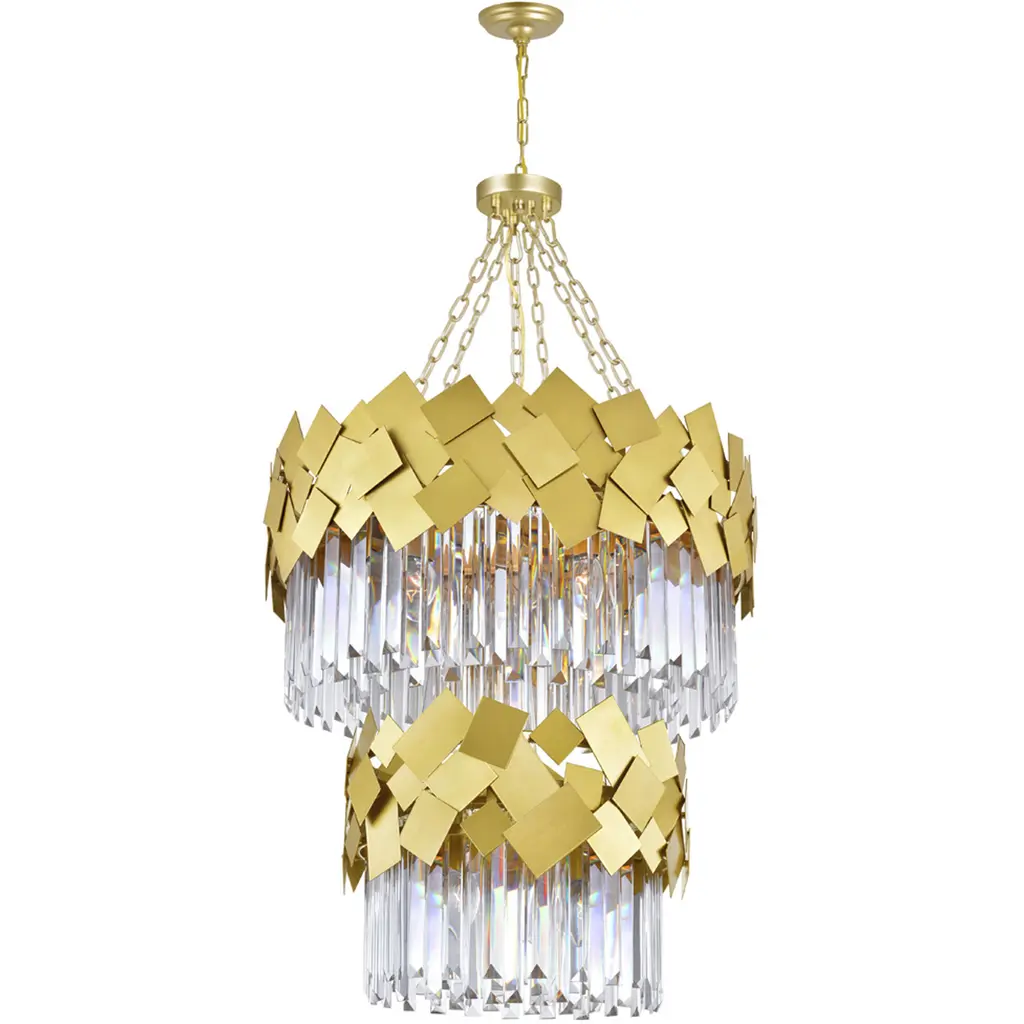 Elegant tiers of sparkling hand-cut Craquelle Crystal create this highly textural and romantic fixture. Reminiscent of a peacock, the crystals are suspended within a Gold Leaf framework that brings a sparkling, luxurious quality to any space. The interplay of shapes and light from the layered silhouette, coupled with the elegant materiality, creates a striking visual display overhead. Available as a semi-flush or chandelier in two sizes.