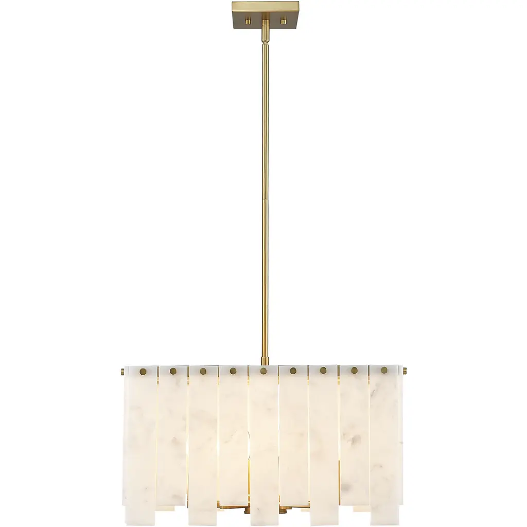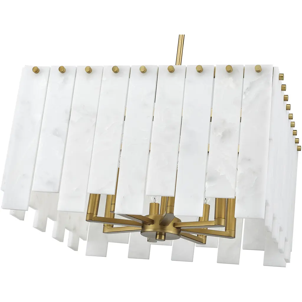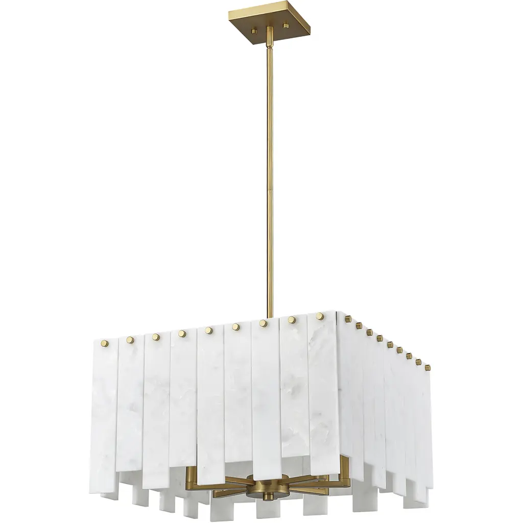 The retro feel of Art Deco style is evident in the styling of a classic fixture with promise. Choose this decadent eight-light pendant from the Viviana collection to deliver impacting ambiance with alabaster-like strips alternating in length and arranged around a squared rubbed brass finish steel frame. Whimsical rivot detailing adds an industrial feel to this pendant that goes with the flow as it complements a gritty rendition of toned-down glam in a kitchen or entryway.