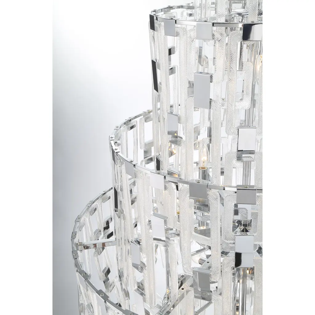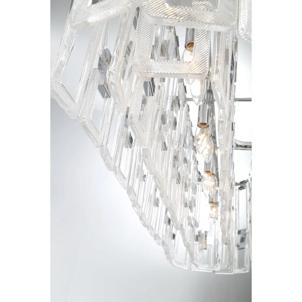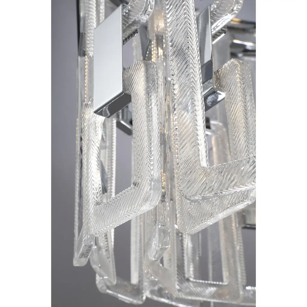 Links of patterned pressed glass cupped by polished chrome clips create a magnificent chain. The textured curtain drapes around the light to capture an opulent glow.