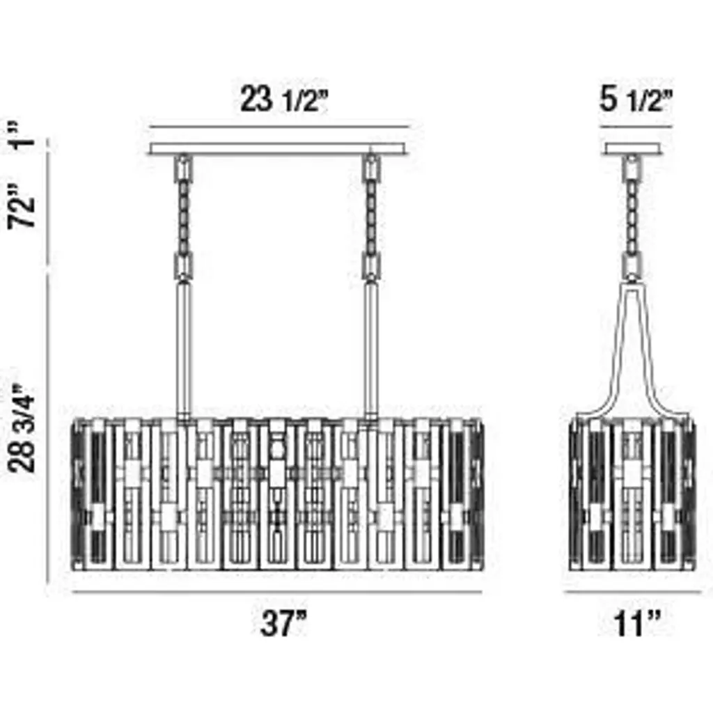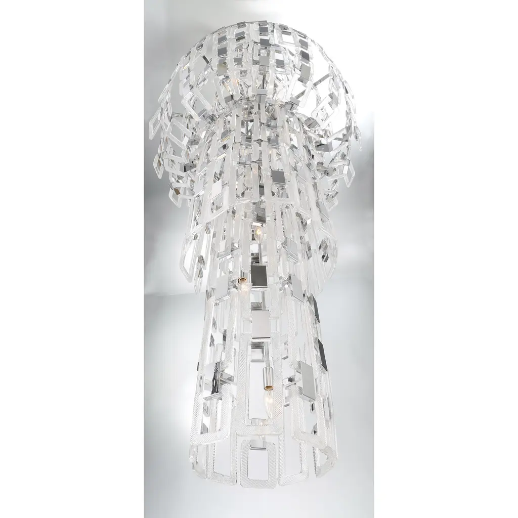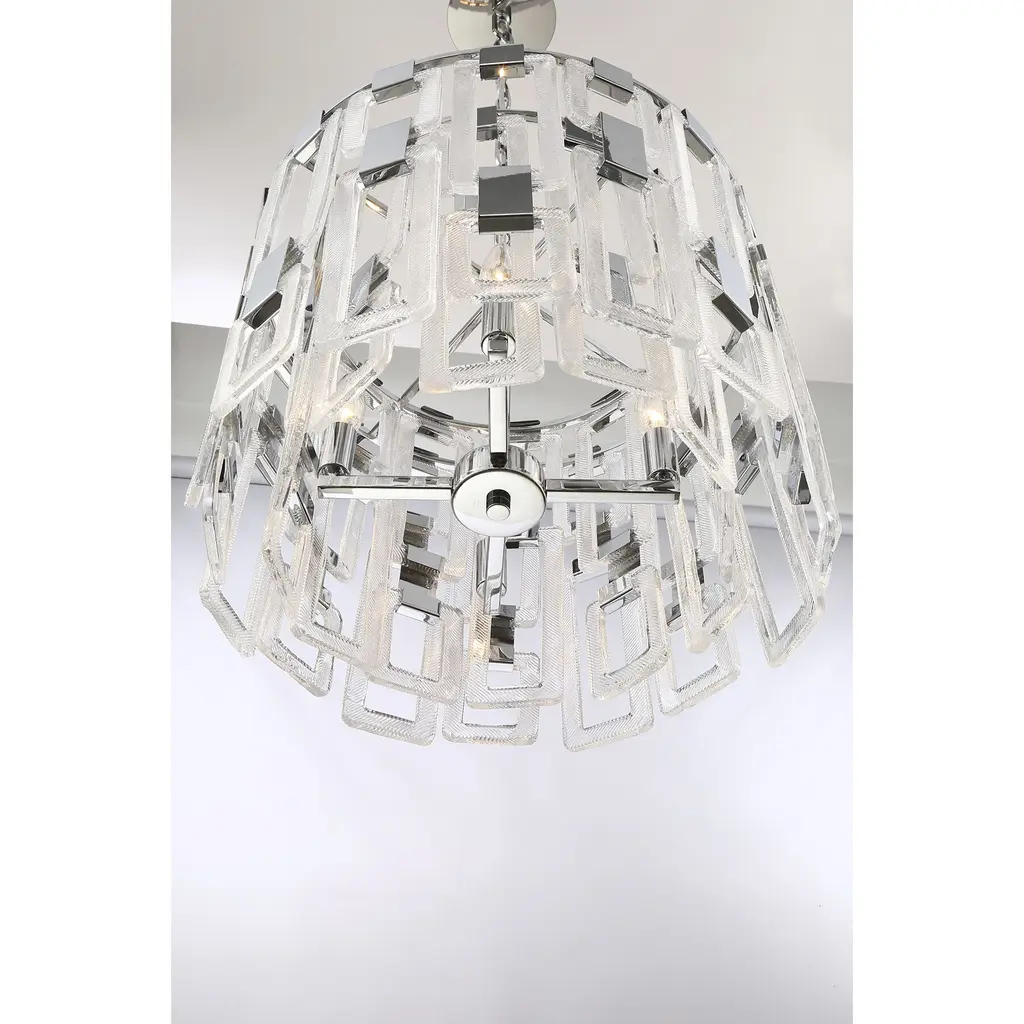 Links of patterned pressed glass cupped by polished chrome clips create a magnificent chain. The textured curtain drapes around the light to capture an opulent glow.