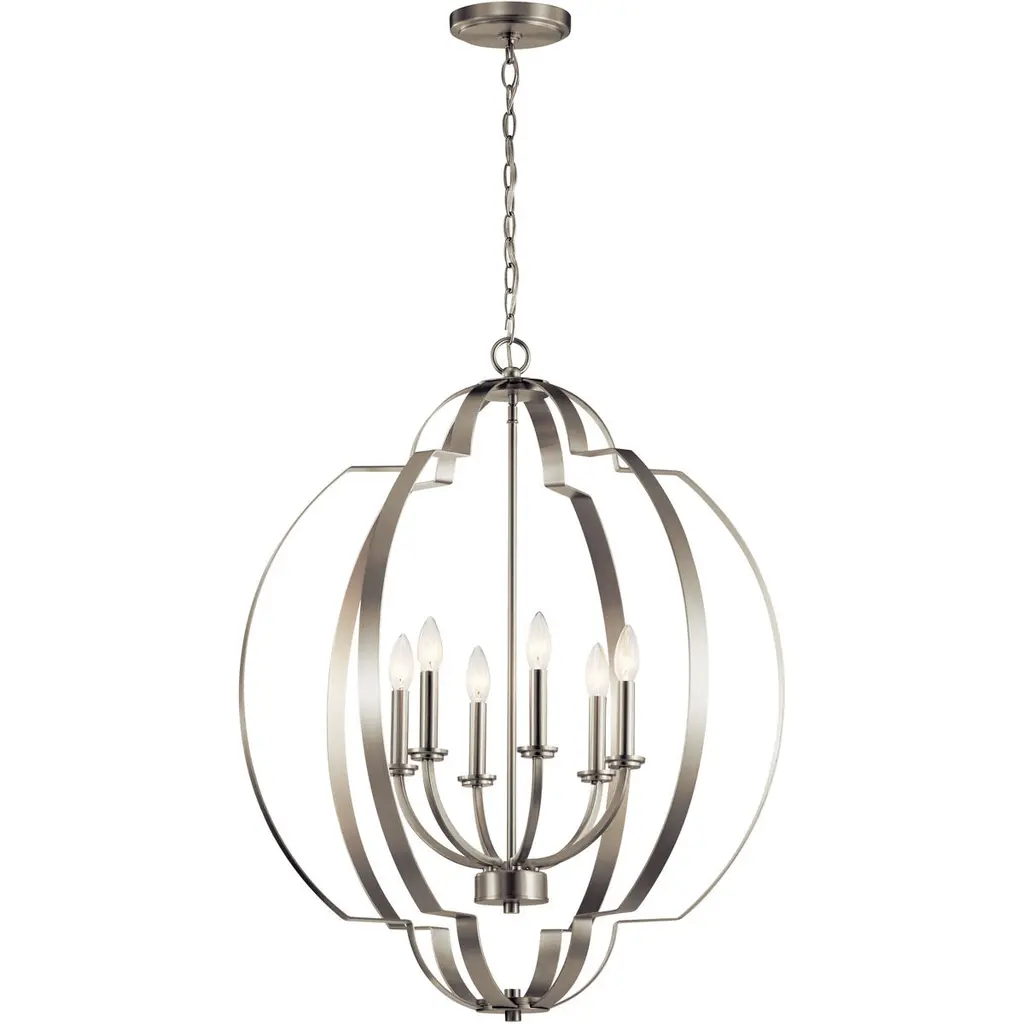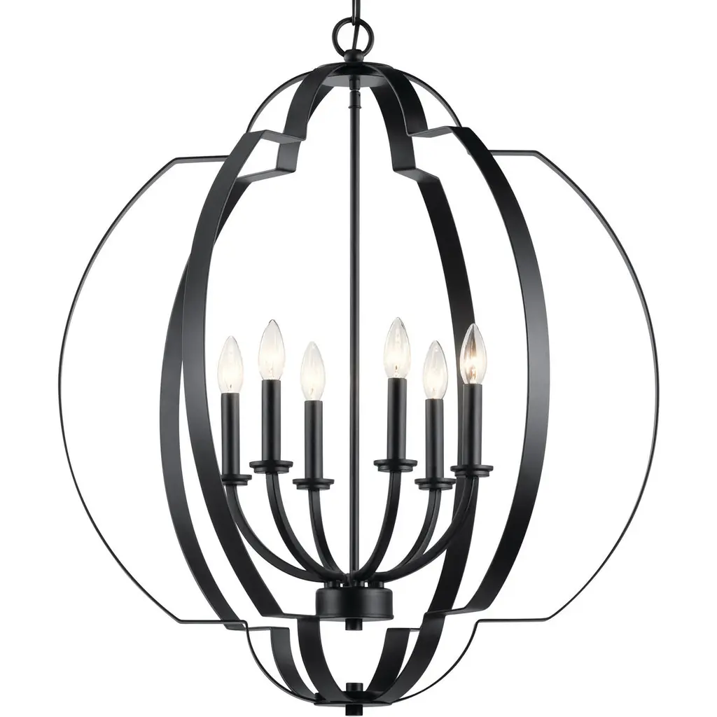 Designed with an intertwined spherical shape and geometrical details, the Voleta(TM) 6-light foyer chandelier with Black finish makes a great statement piece, adding visual interest to any room.