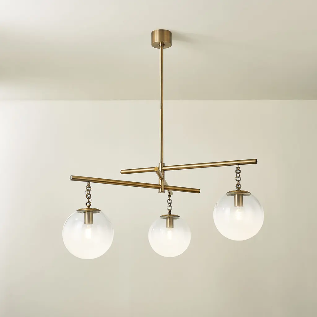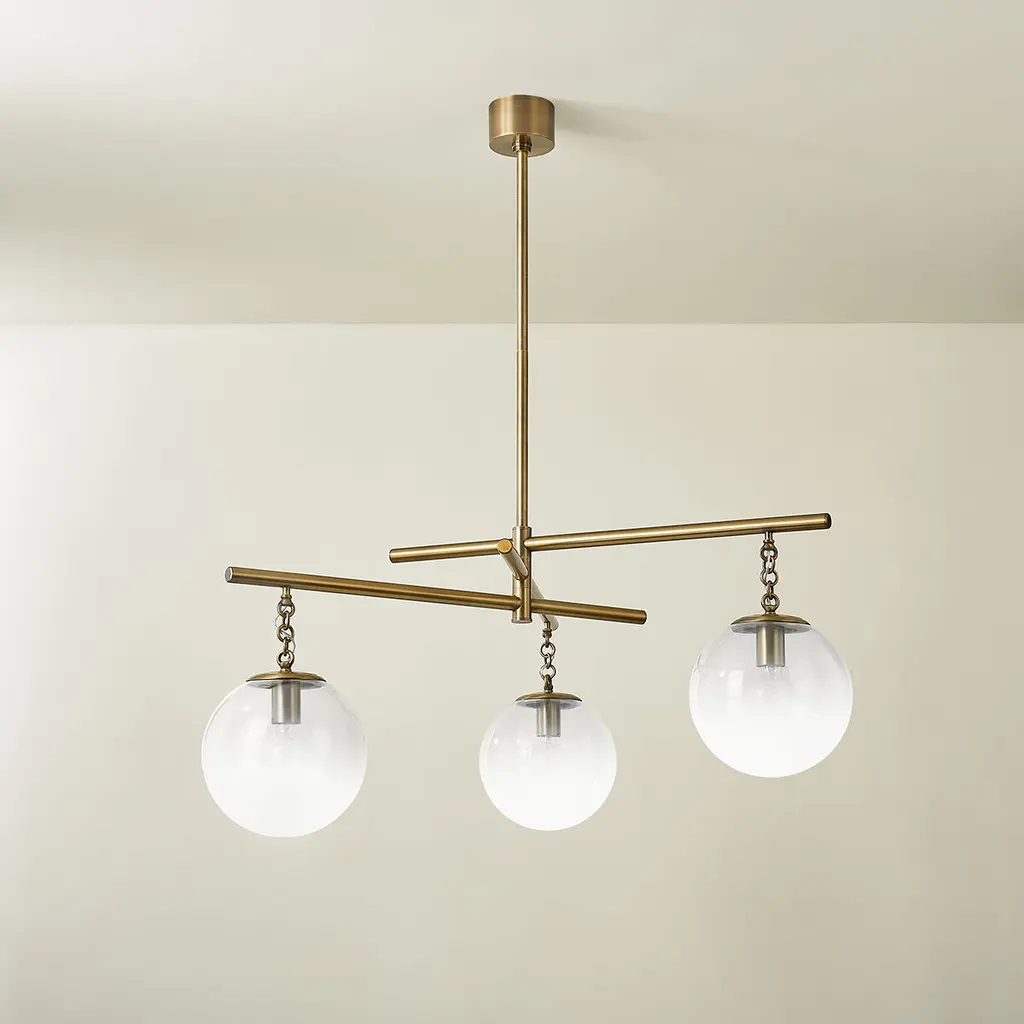 Inspired by the cosmos, Wade features large Sfumato glass spheres that orbit the mobile-like structure. A substantial jewelry-like chain and artful geometry add to the design of this chandelier. Available in two sizes in a Patina Brass finish, Wade introduces a moment of contemplation to modern spaces.
