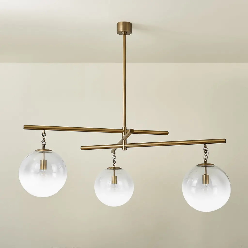 Inspired by the cosmos, Wade features large Sfumato glass spheres that orbit the mobile-like structure. A substantial jewelry-like chain and artful geometry add to the design of this chandelier. Available in two sizes in a Patina Brass finish, Wade introduces a moment of contemplation to modern spaces.