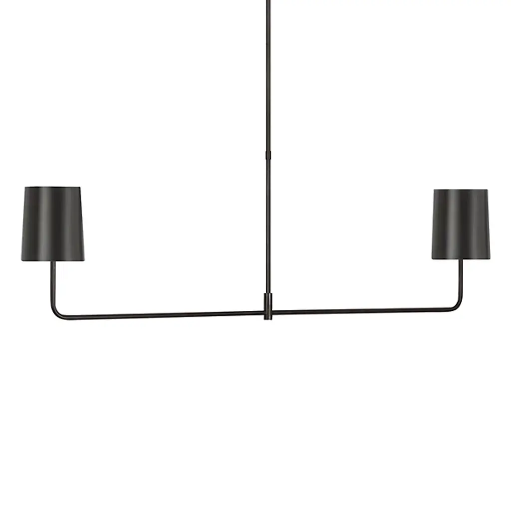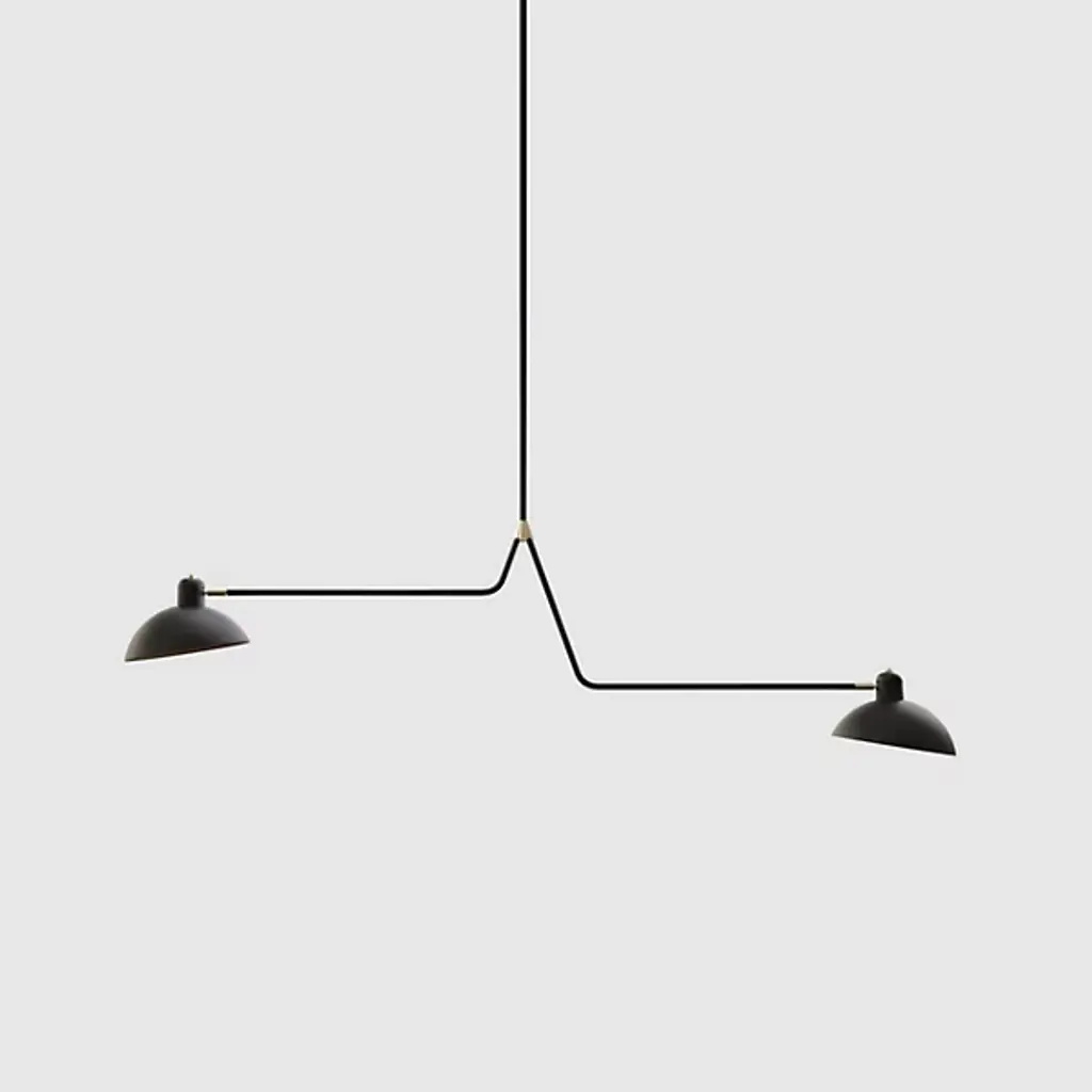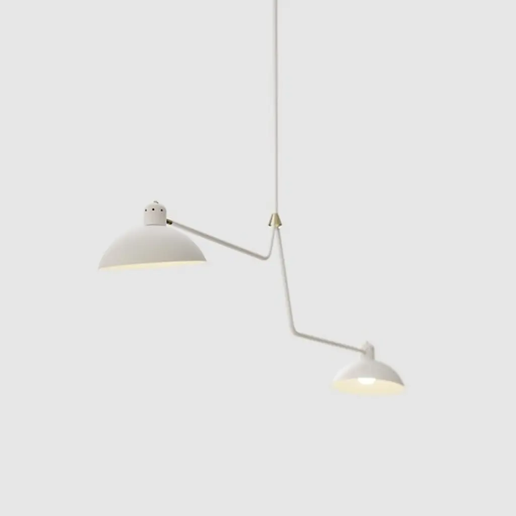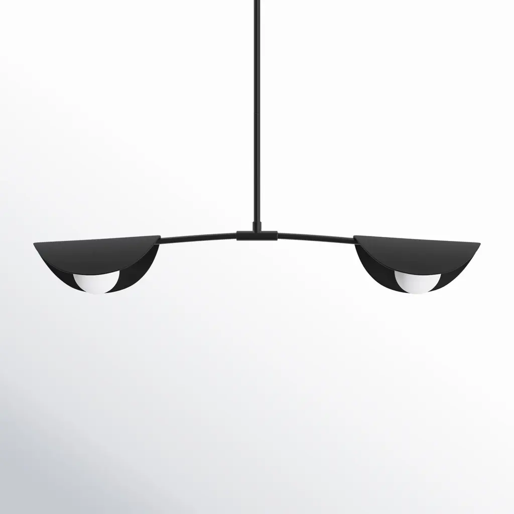 A simple and sleek modern piece, the Waldorf Double Chandelier from Lambert & Fils uses an appealing minimalist silhouette to match with and elevate a range of home styles. A single thin downrod drops from the ceiling, splitting at a contrasting bracket into a pair of gently curving arms that end with dome-shaped shades. The light from the shades filters from glass globes and integrated LEDs as a bright and even layer of light.