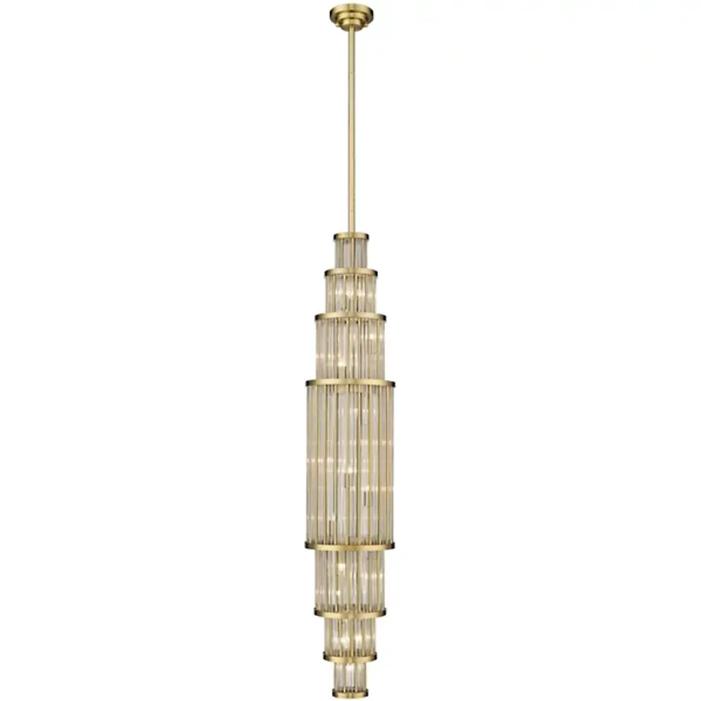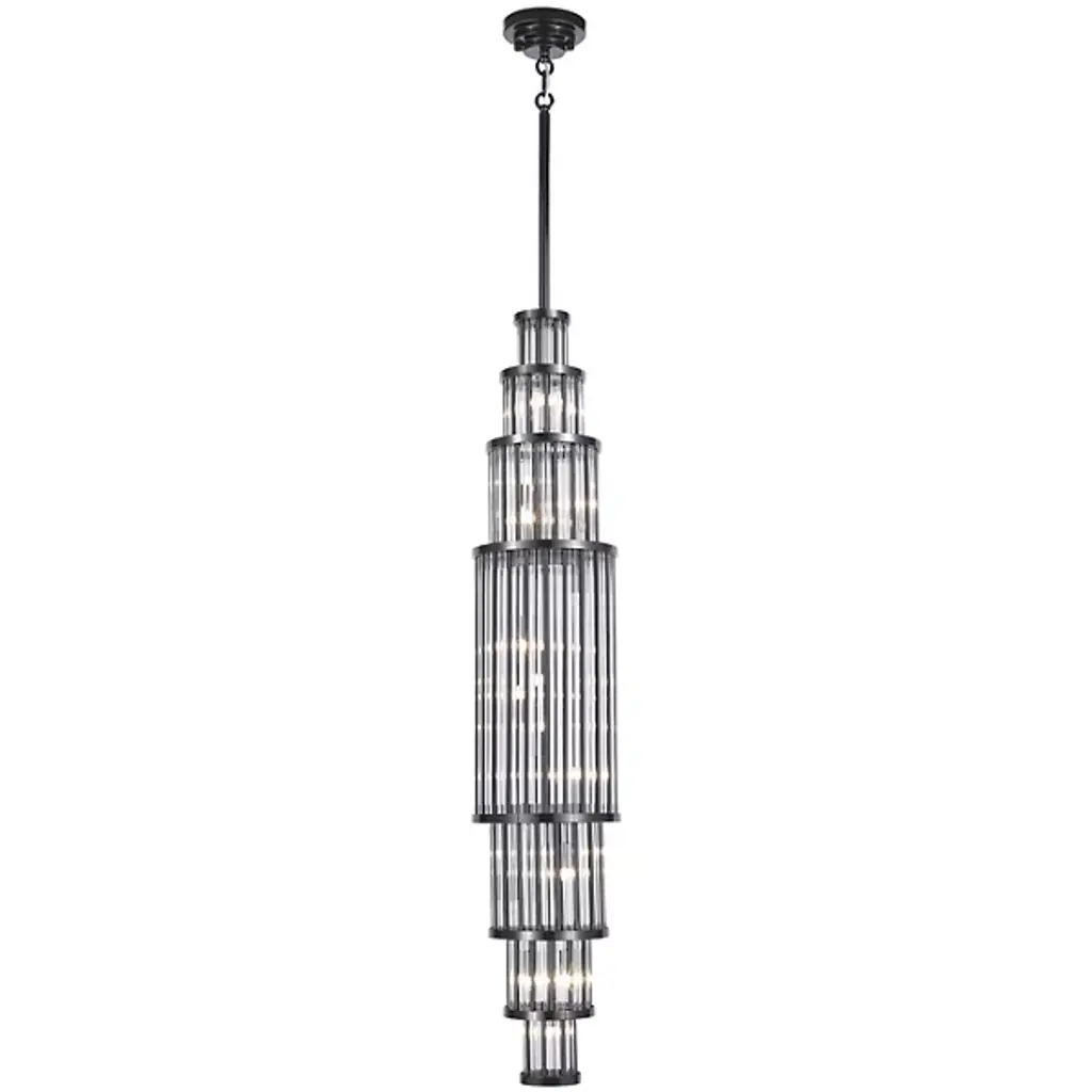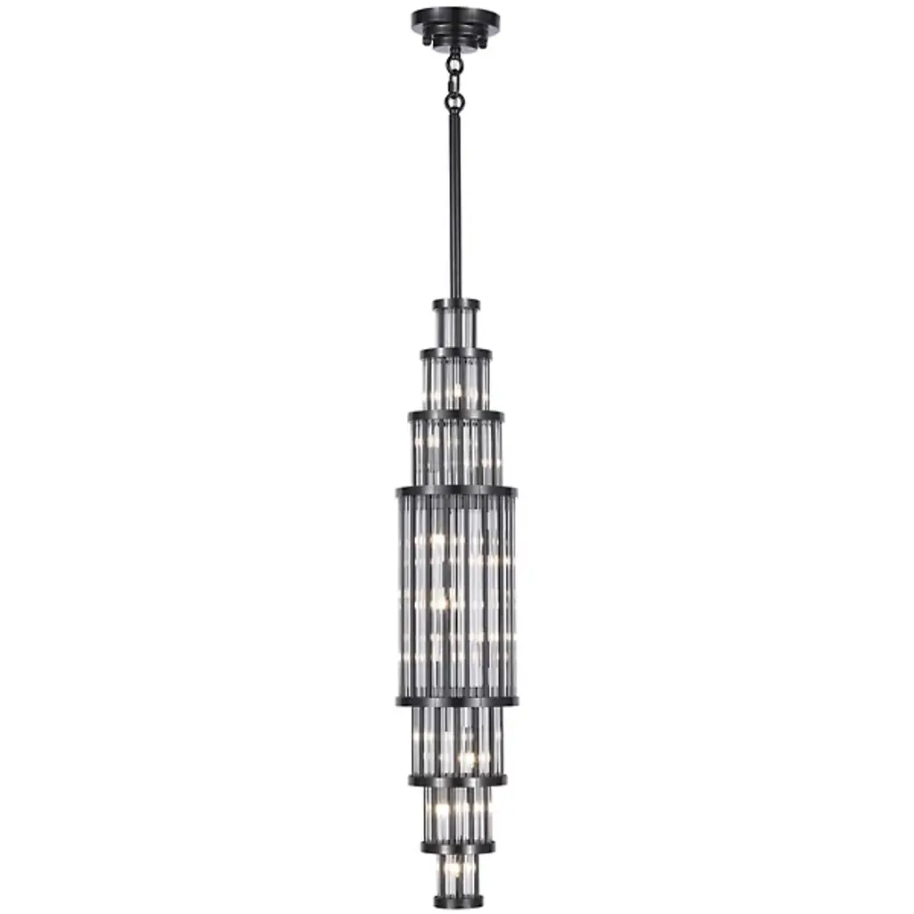 The Waldorf Foyer Chandelier from Avenue Lighting is a dazzling embodiment of the glamorous spirit of the roaring 20s. Crafted from durable steel and adorned with streamlined, clear glass cylinders, Waldorf exudes a sense of opulence and refinement. Its tiered presentation adds depth and dimension to any space, creating a captivating focal point that evokes the grandeur of the Art Deco period. This sloped ceiling adaptable chandelier provides ample illumination and offers versatility in installation.