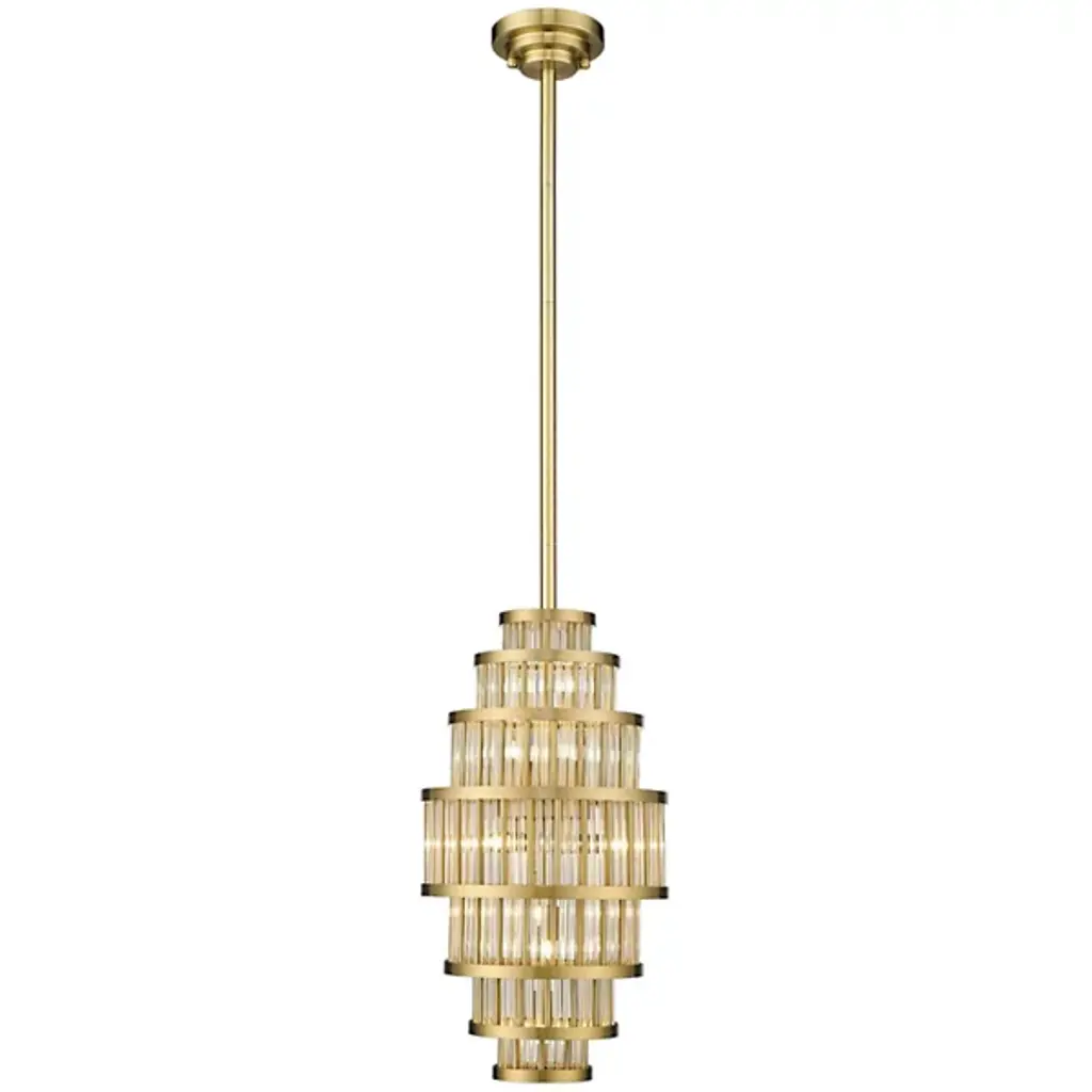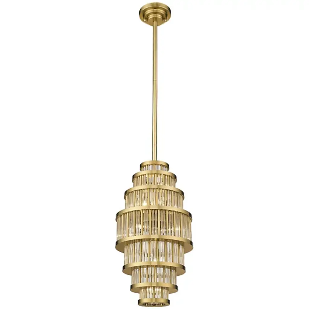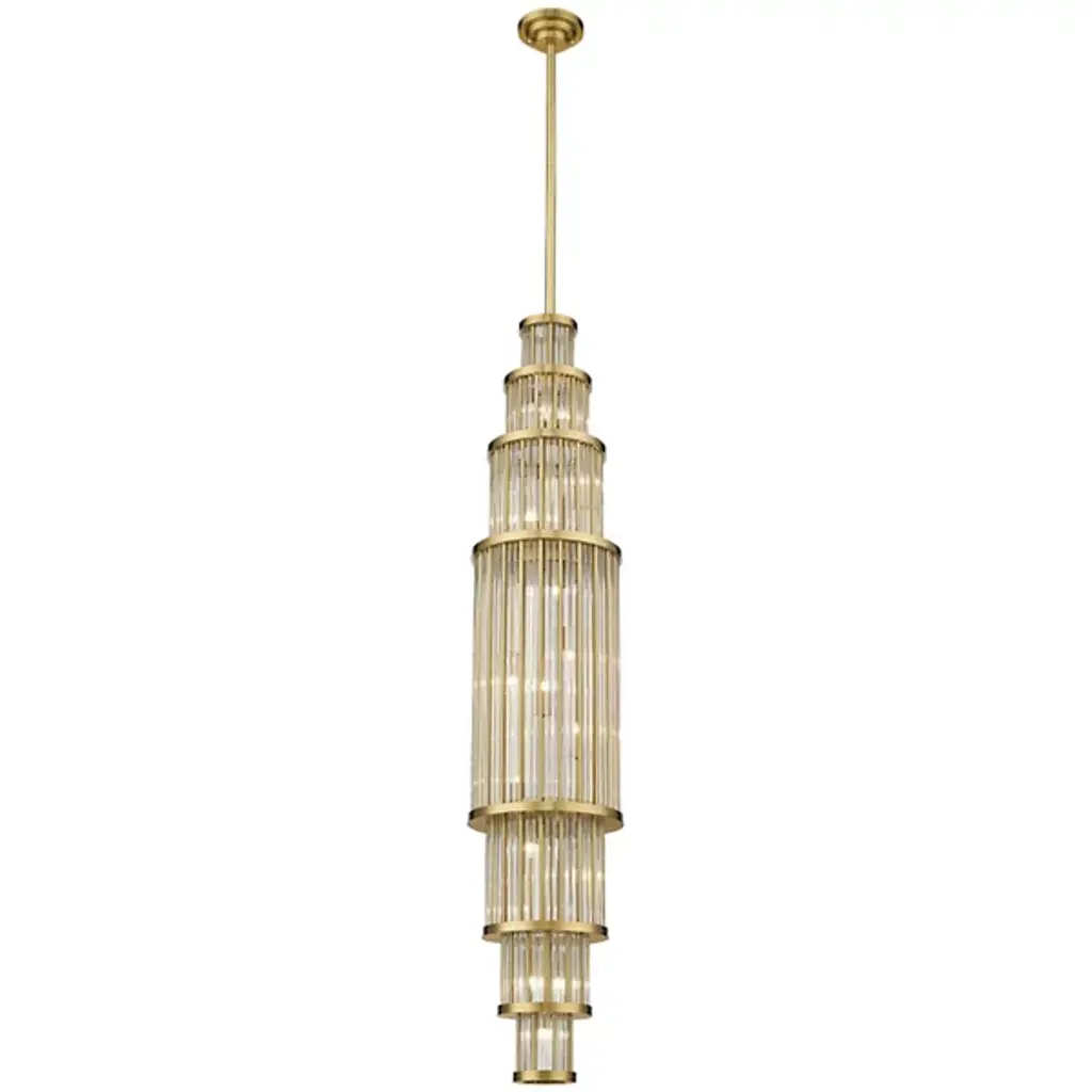 The Waldorf Foyer Chandelier from Avenue Lighting is a dazzling embodiment of the glamorous spirit of the roaring 20s. Crafted from durable steel and adorned with streamlined, clear glass cylinders, Waldorf exudes a sense of opulence and refinement. Its tiered presentation adds depth and dimension to any space, creating a captivating focal point that evokes the grandeur of the Art Deco period. This sloped ceiling adaptable chandelier provides ample illumination and offers versatility in installation.