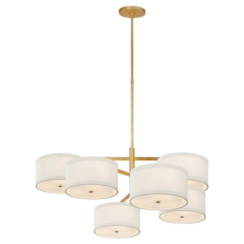 Six arms of varying heights and depths give this chandelier a sense of movement and whimsy. Each arm accommodates three candelabra bulbs; diffusers within each linen shade ensure a warm, flattering glow.