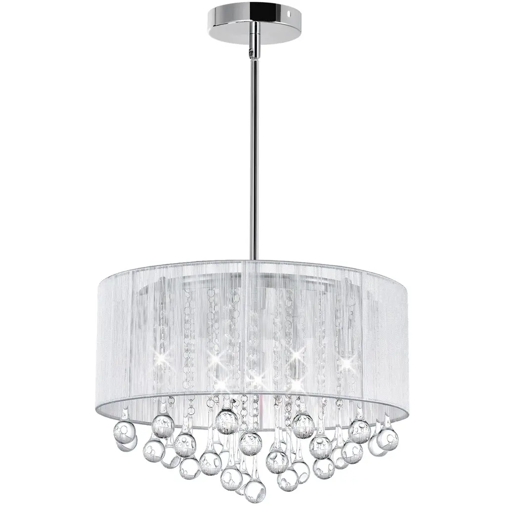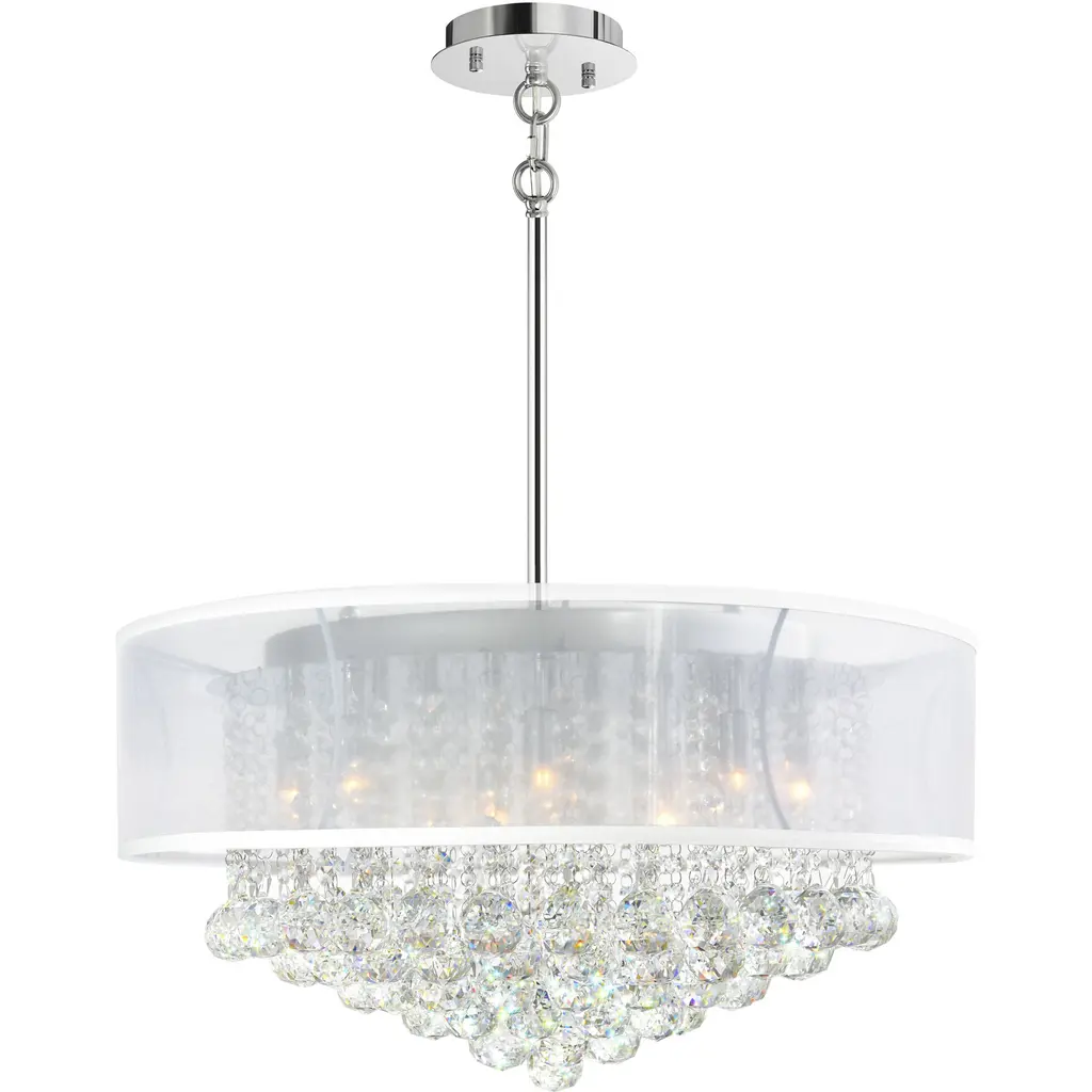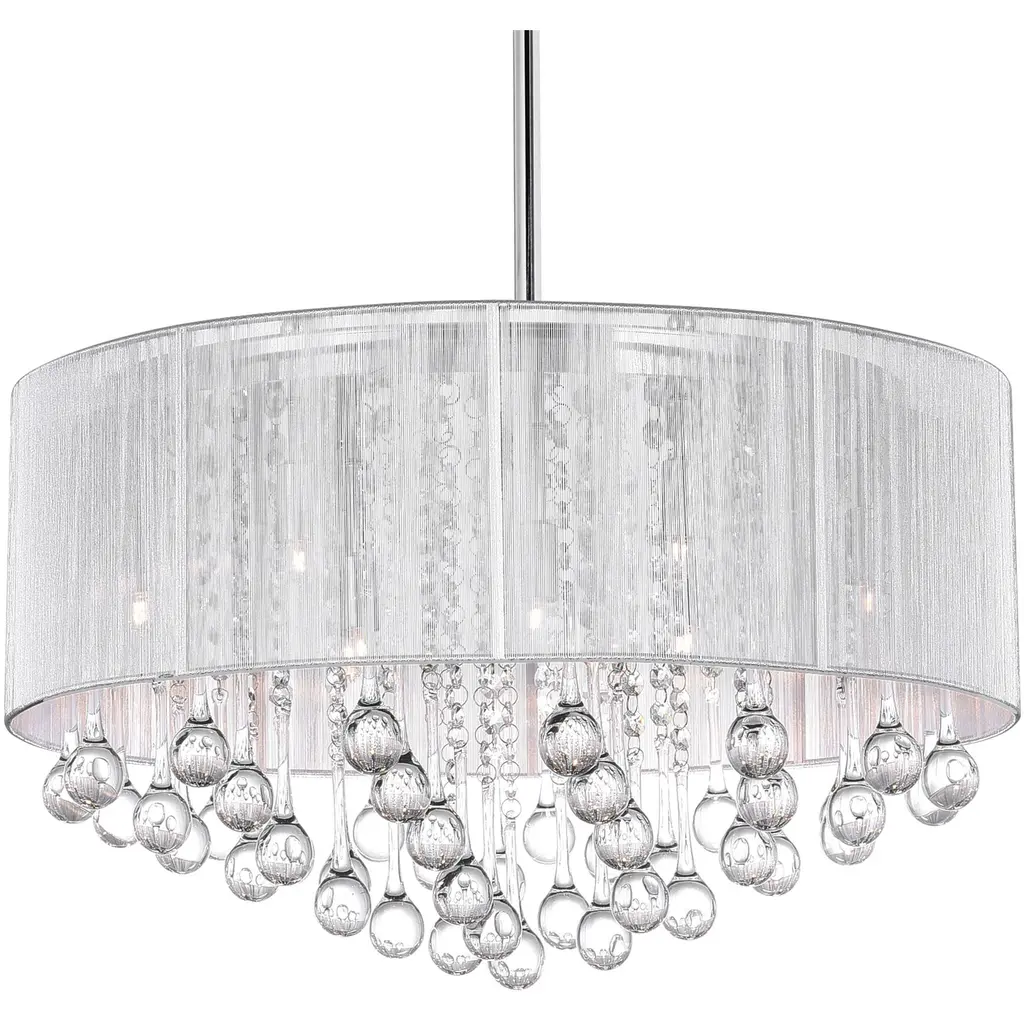 Indulge in the perfect blend of elegance and romance with the Water Drop 9 Light 22in Chandelier, a stunning drum shade chandelier designed to create an intimate and enchanting ambiance. Crafted with both magic and sophistication in mind, this 22-inch fixture provides just the right amount of soft, inviting light while adding a touch of whimsical beauty to any space. The elegant white shade enhances its classy and pure aesthetic, making it a timeless addition to your home decor. Whether illuminating a dining room, bedroom, or entryway, this chandelier effortlessly elevates your space with its delicate charm and refined glow.