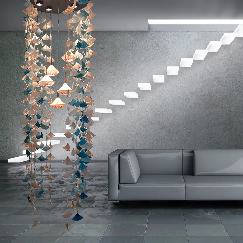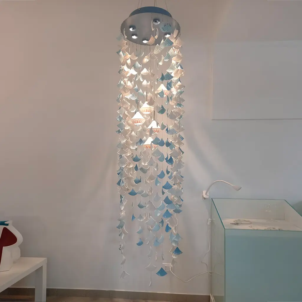 The Water Garden chandeliers is an elegant masterpiece composed of a ceiling plate that houses 6 LEDs, an external cascade of porcelain triangles with shades of color from white to turquoise, and 5 internal arms, each of which supports a piece of porcelain inlaid with colored mosaic, each with an internal led. The metal structure can be chosen in the desired color as well as the colors of the porcelain pieces. This version of the Chandelier is in matt grayish-blue metal.