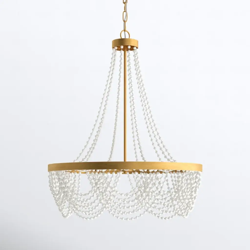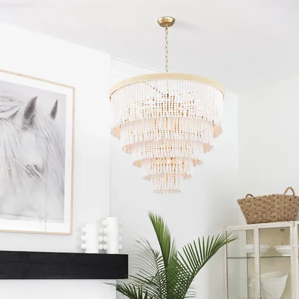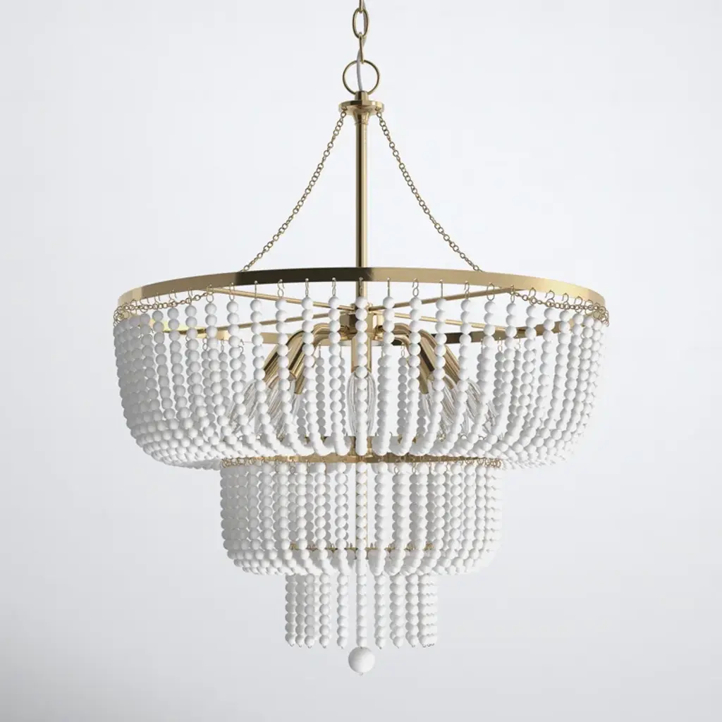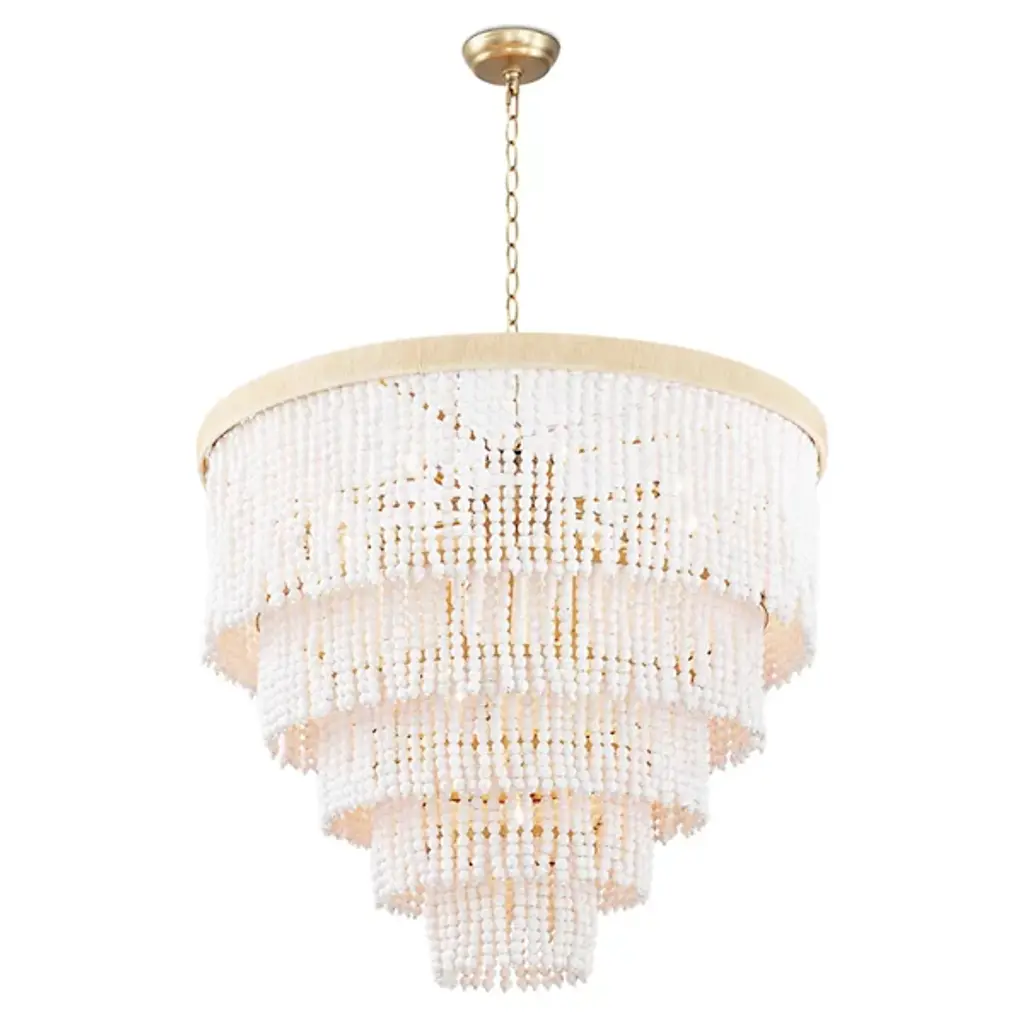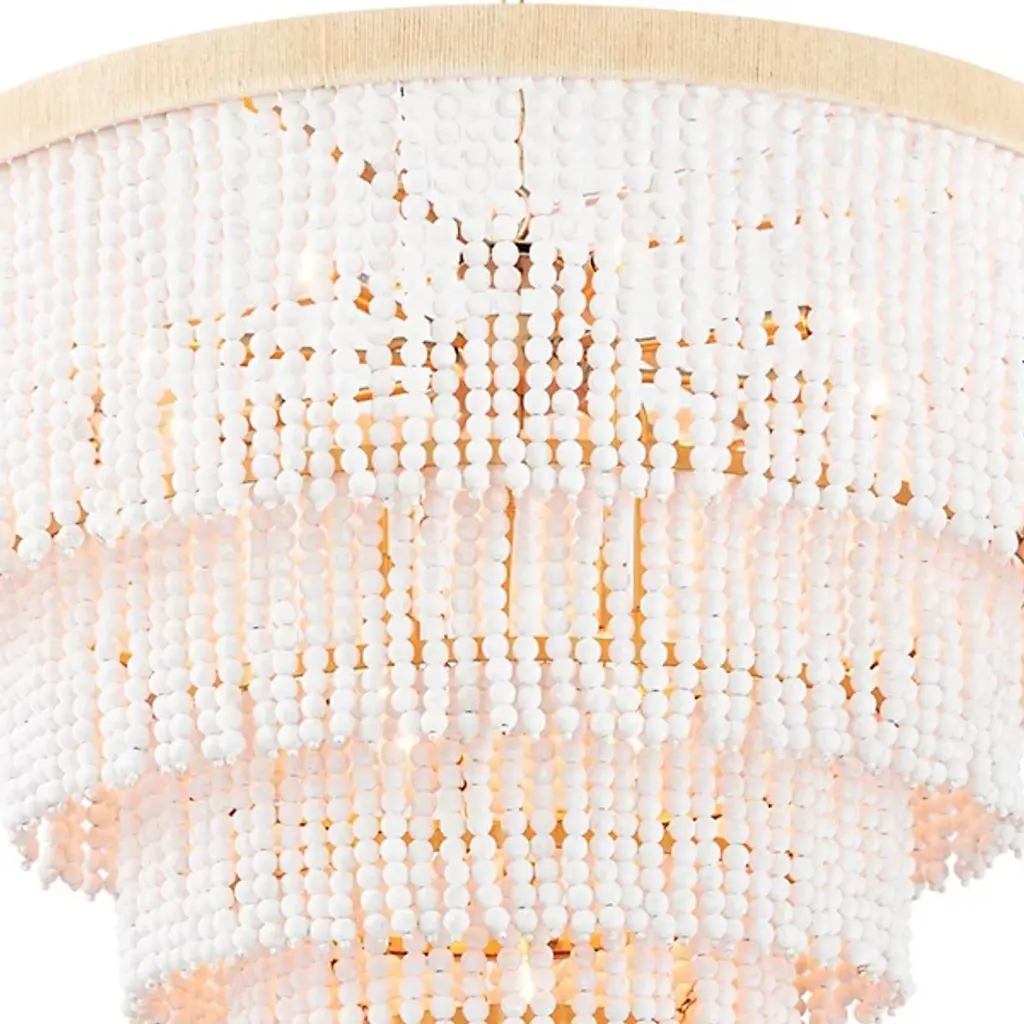 Effortless yet elegant. The Waterfall Chandelier is a magnificent piece of lighting design presented by Regina Andrew. The descending tiers of the chandelier are adorned in strands of white beads. There is also a notable woven rattan detailing around the crown. It hangs from an adjustable chain link to a canopy attached to the ceiling. The composition evokes the feeling of a coastal cottage, even if you happen to be far from the ocean.