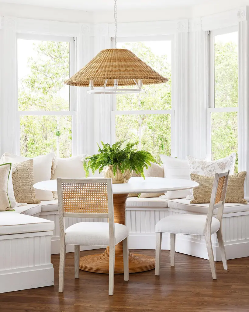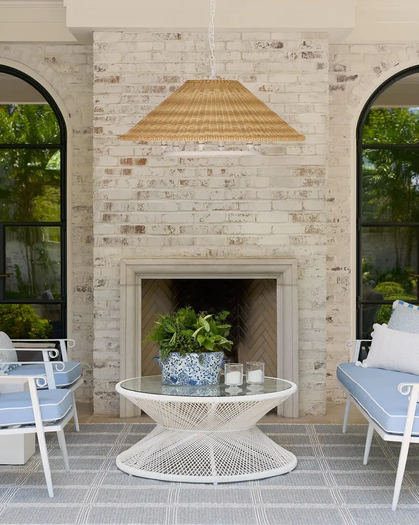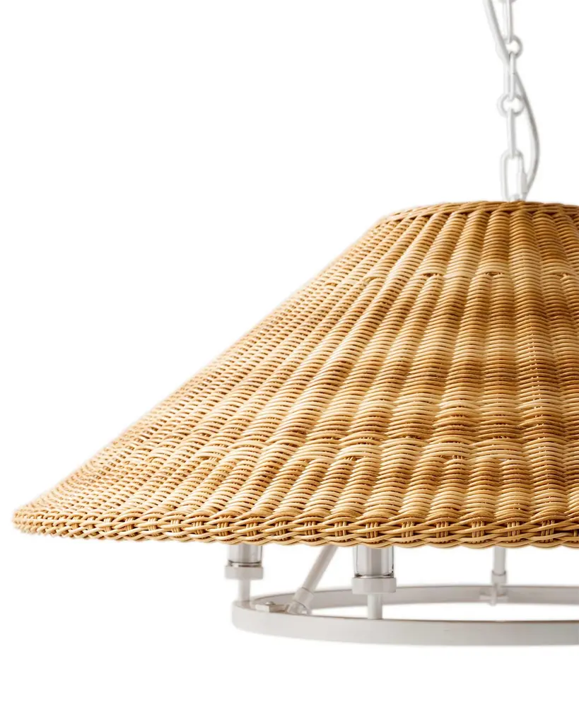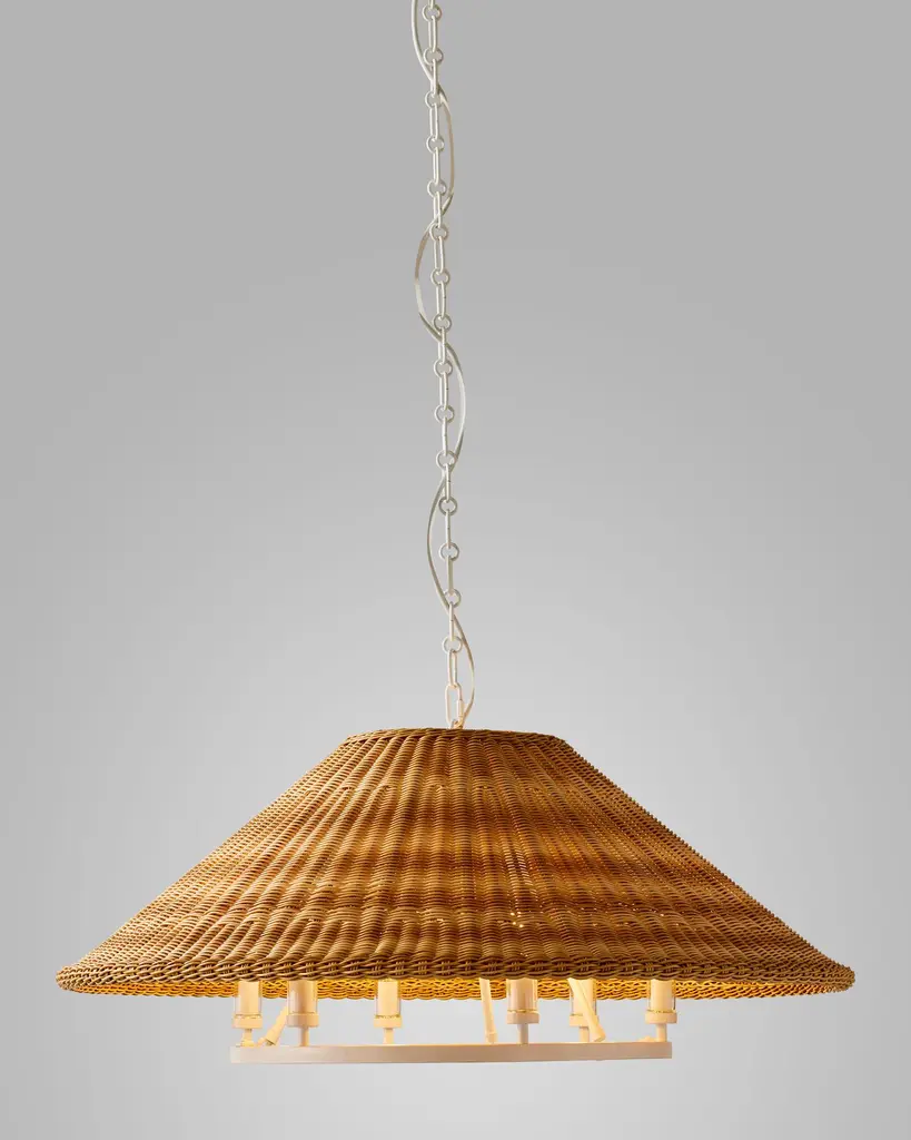 High regard. A tapered shade in woven wicker with a powder coated frame. It commands the ceiling. A captivating accompaniment to sunset soirées.
