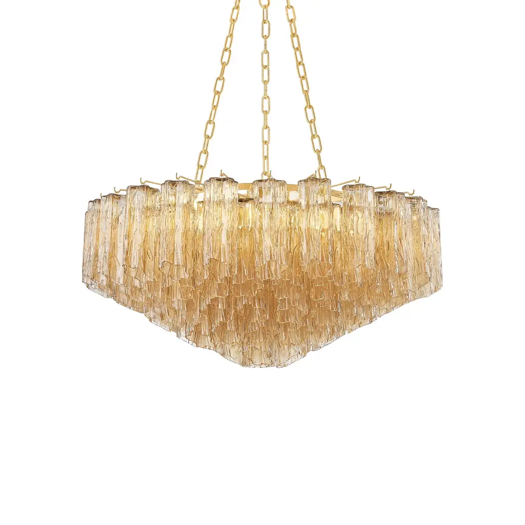 The incredible quantity of layers, lights, and complex glass shapes make Watertown a dramatic showstopper. Inspired by Art Deco aesthetics, this maximalist chandelier features organically shaped Tronchi glass shades with textured cuts. The shades are arranged to form a descending point at the center, reminiscent of water droplets. Features