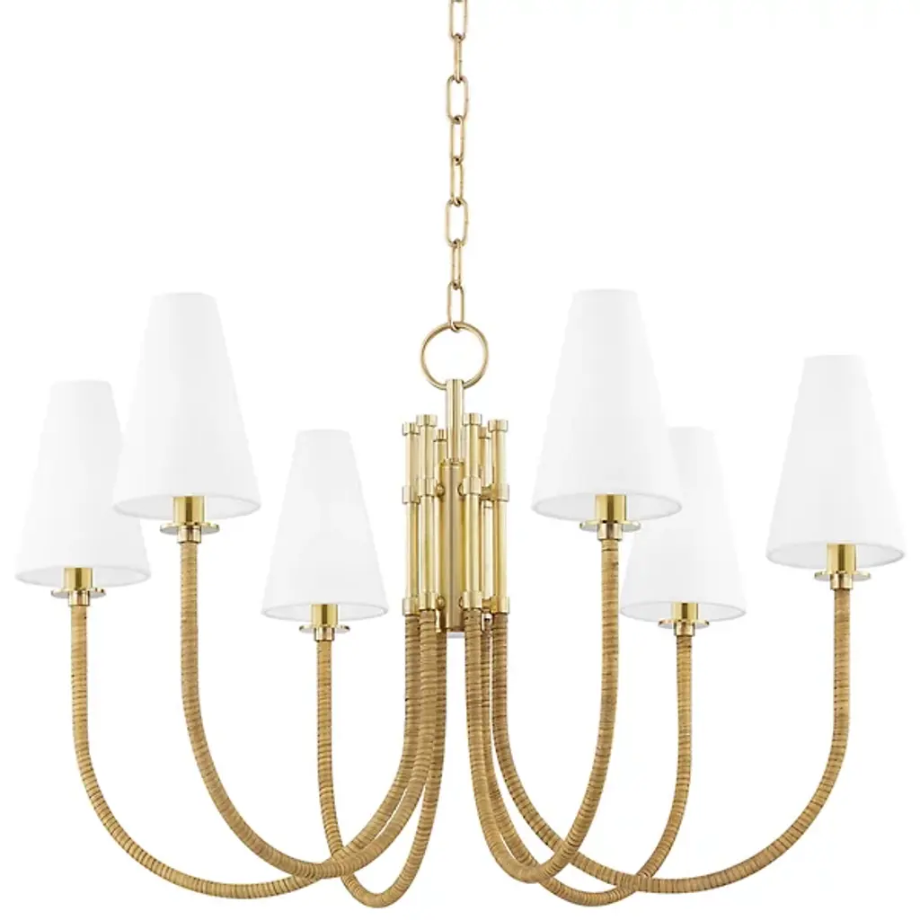 Webson's classic silhouette, swooping Aged Brass arms, and rounded white linen shades are accented by natural rattan wrapping for a soft organic feel. Available as a chandelier and 2-light wall sconce.