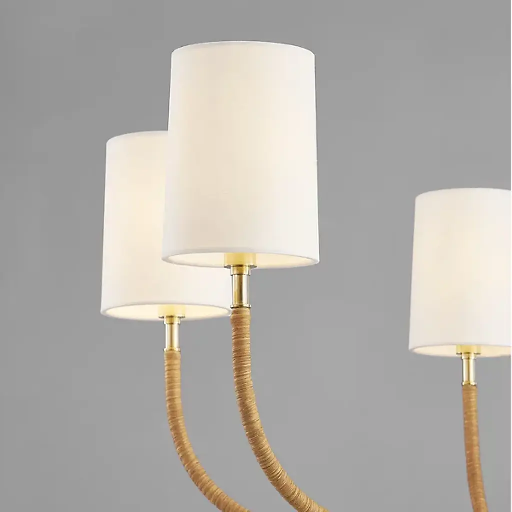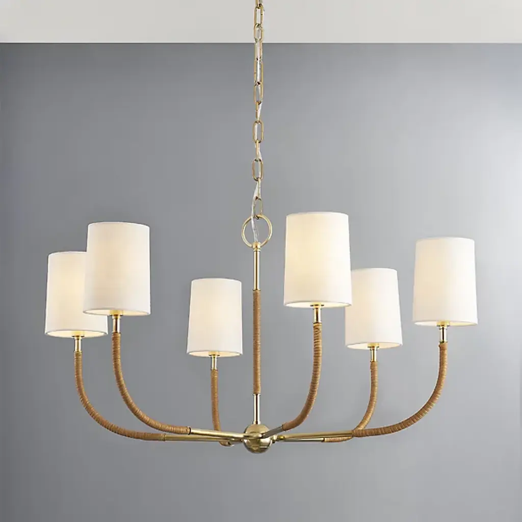 Make your living area luxurious with the Webson Chandelier by Hudson Valley Lighting. A canopy at your ceiling provides the foundation for a lovely chain of links. At the end of this chain rests a ring that secures a downrod, creating a focal point for a collection of contouring arms. These arms are wrapped with intricate rattan and support bulbs covered by shades of Belgian linen. This multi-light fixture effortlessly illuminates your mid-century modern home, providing ample amounts of light for your gatherings.